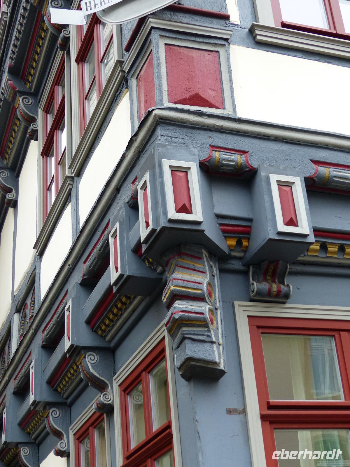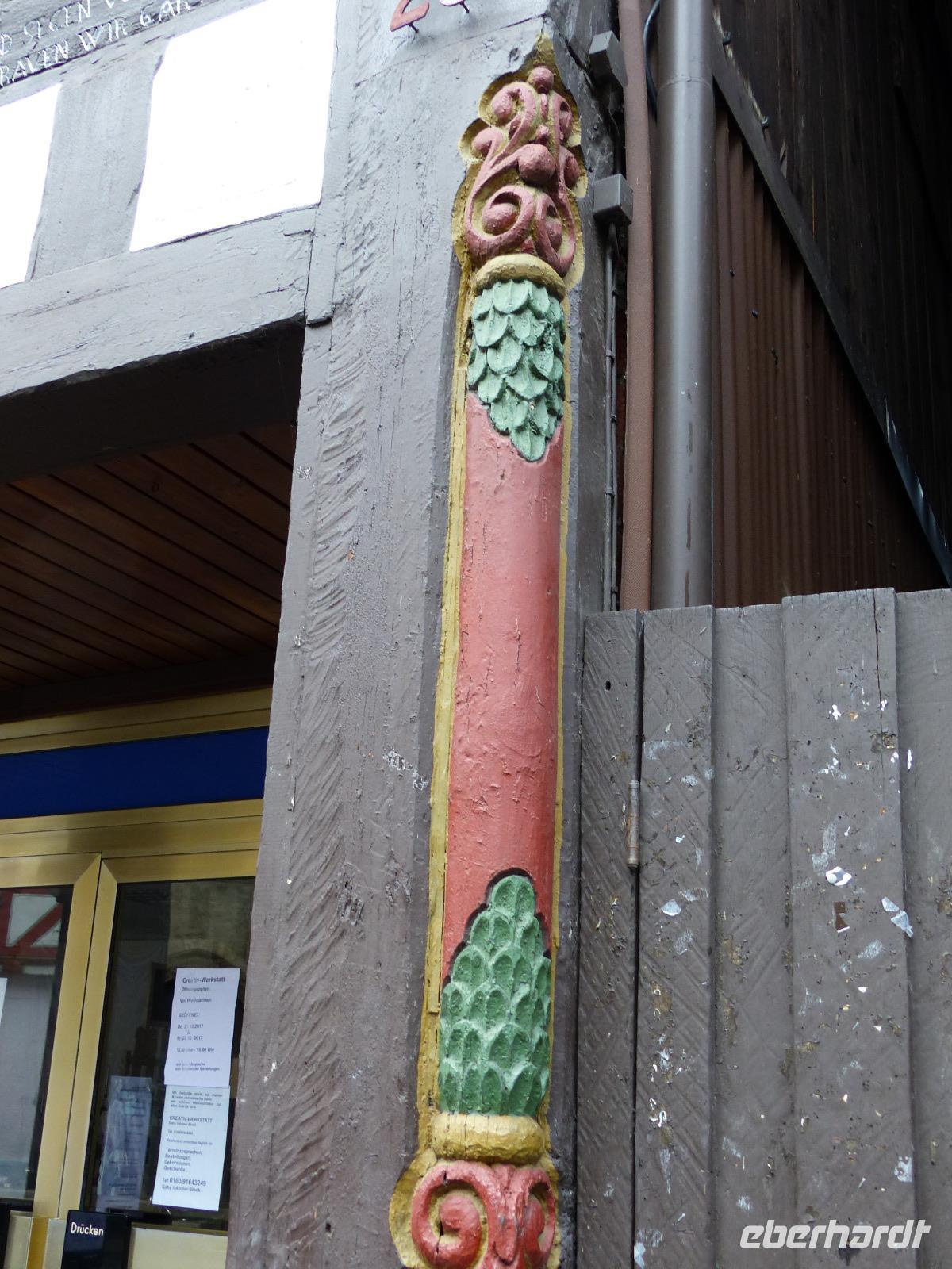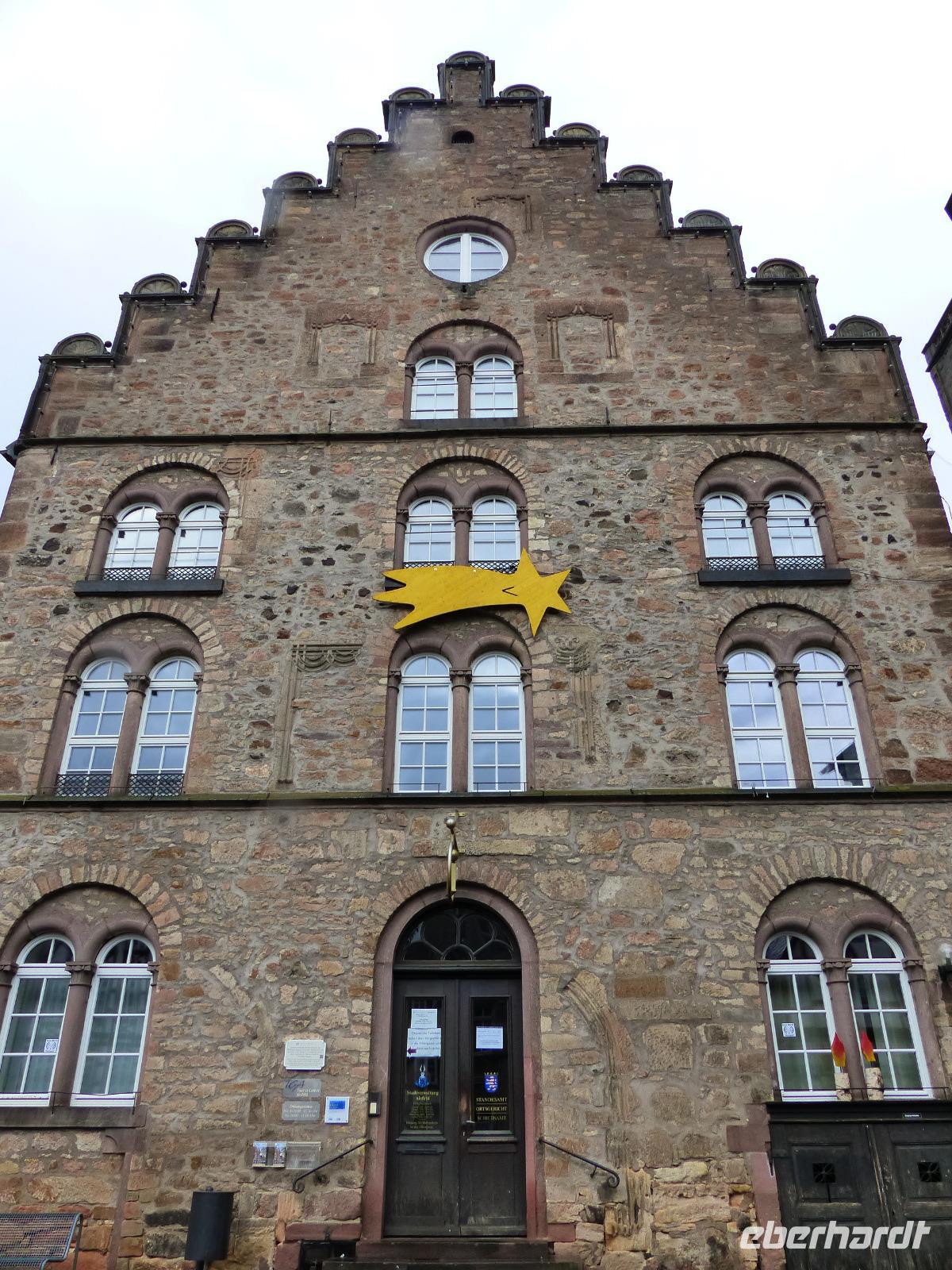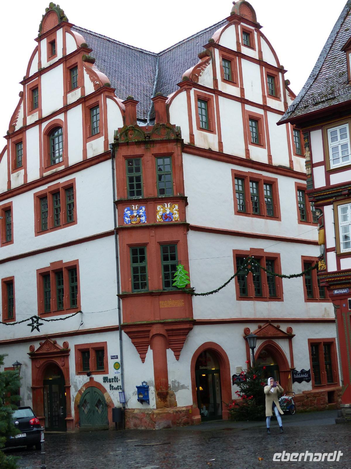 Das Alsfelder Rathaus, auf dem mit drei Arkaden versehenen steinernen Unterbau einer Markt- und Gerichtshalle in Rähmbauweise Anfang des 16. Jh. errichtet, gilt als eines der schönsten Rathäuser Deutschlands. Als Wahrzeichen der Stadt ziert es verschiedene Firmenlogos und war auch schon Motiv auf einer Briefmarke der Deutschen Post. Dicht neben dem Rathaus steht der Steinbau des Weinhauses. Bemerkenswert an dem Bau mit Staffelgiebelk ist seine Ecke: hier befindet sich noch heute der Pranger, ein mittelalterliches Straf-Gerät. In Alsfeld ist dies ein fest im Mauerwerk an einer kurzen Kette verankerter und verschließbarer Eisenring, der Delinquenten nach ihrer Aburteilung um den Hals gelegt wurde. Damit waren Ärmsten wehrlos dem Spott oder der Gewalttätigkeit ihrer Mitmenschen ausgeliefert. Da der - deutlich vielfach benutzte - Pranger über einen Trittstein verfügt, kann er verschiedenen Körpergrößen „angepasst" werden.