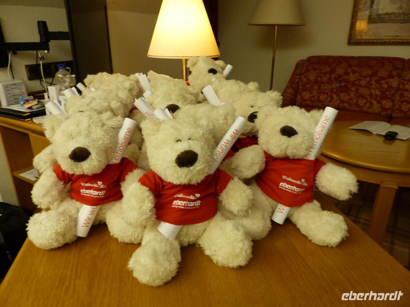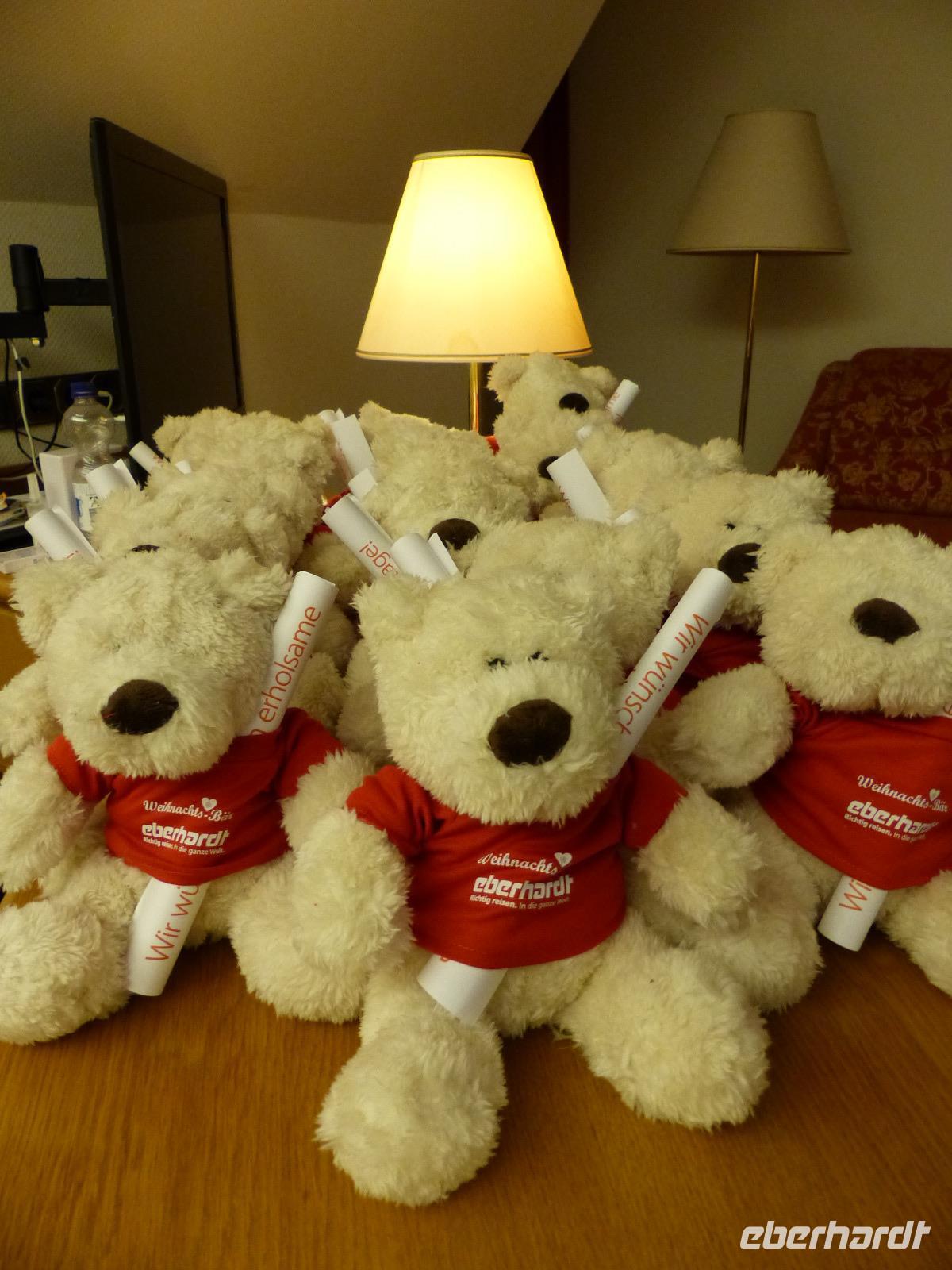 Wer wollte, konnte sich vor dem Abendbuffet noch etwas frisch machen, alle aber waren zur „Bescherung" zu einem Kurzbesuch in unserem Bus eingeladen, der gegenüber vom Hotel stand: bei Weihnachtsmusik und einem leckeren Glühwein bekamen die Gäste Süßigkeiten und einen der niedlichen Eberhardt-Reise-Teddybären...