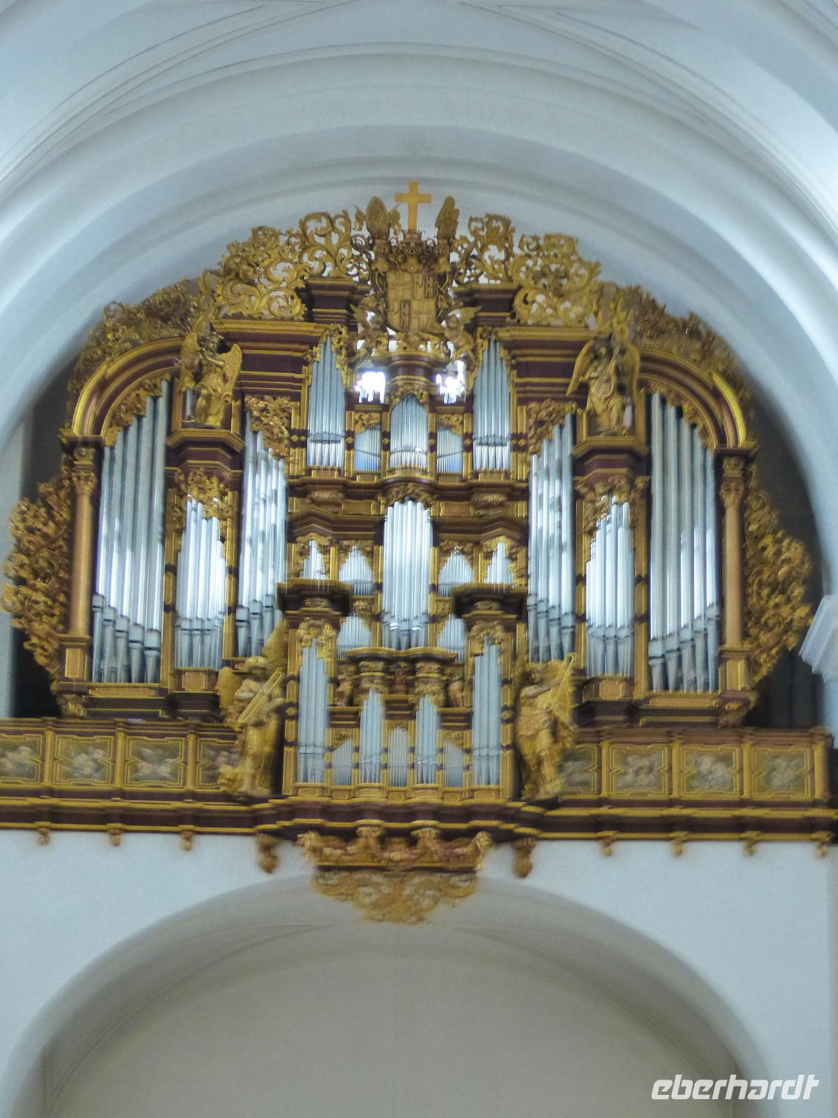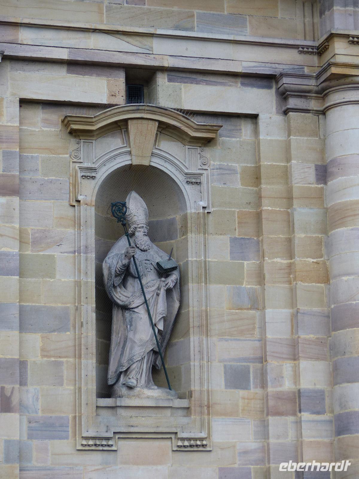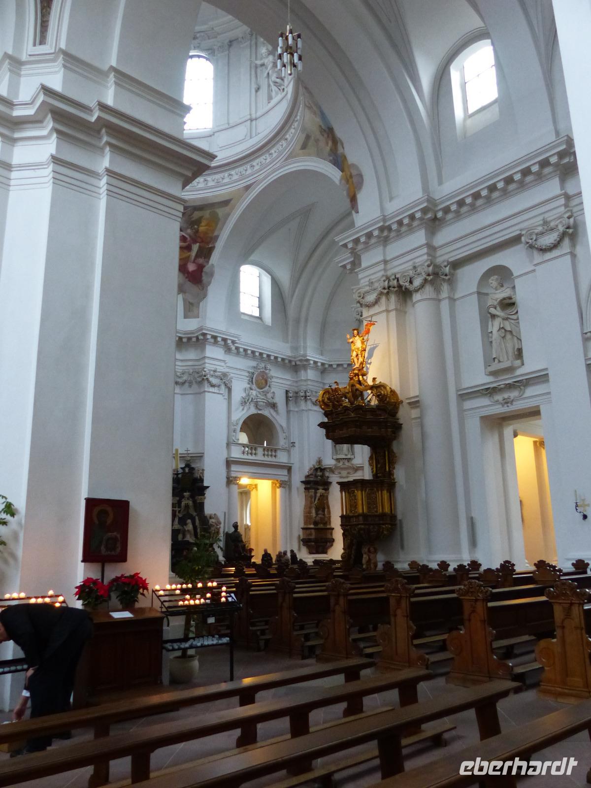 Dann hatten wir noch etwas Freizeit, in dem wir individuell noch den Dom besuchen konnten, den Dientzenhofer seit 1704 in nur wenigen Jahren als barockes Kleinod gestaltete. Die architektonisch klar gegliederte Prunkfassade beherrschen zwei etwa 65 m hohe Türme. Flankiert von den Statuen des Sturmius und des Bonifatius passiert man das Portal in der Westfassade der kreuzförmigen dreischiffigen Pfeilerbasilika und steht in dem für ein sehr bedeutendes katholisches Gotteshaus erstaunlich schlichten Sakralbau. Besonders sehenswert sind die Altäre und die Krypta mit dem reichverzierten Sarkophag, die die Gebeine des Heiligen enthalten. Diese sind das Ziel der alljährlichen Bonifatius-Wallfahrt.