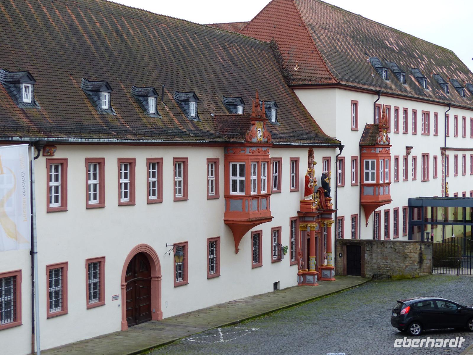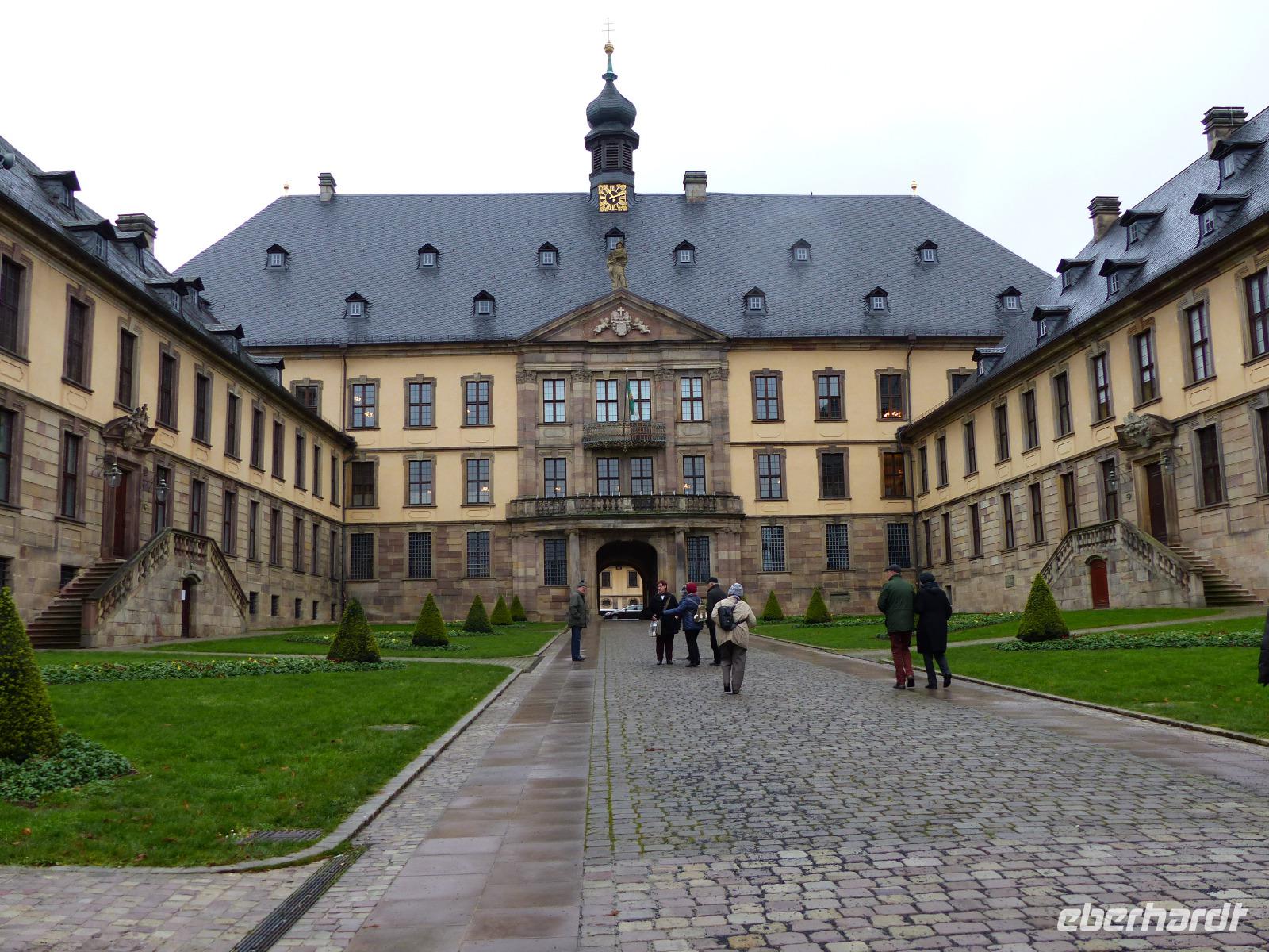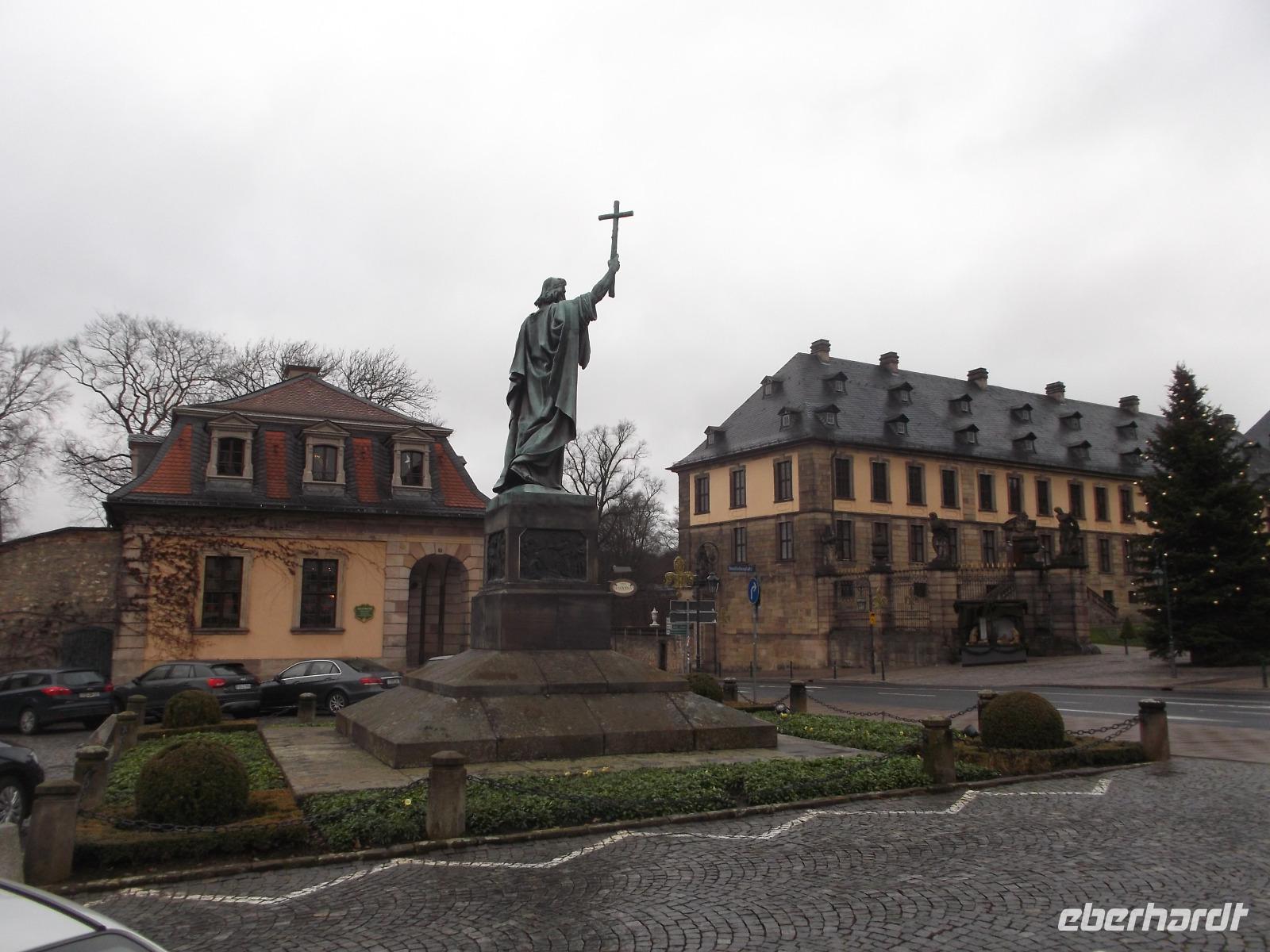 Da im Dom noch der Weihnachtsgottsdienst stattfand, als wir in Fulda eintrafen, lernten wir bei einer Stadtführung zunächst die Altstadt kennen. Alte Zunfthäuser und schöne Fachwerkbauten prägen die Straßen, die etwas abseits vom Domplatz, Von der Heiligkreuzkirche, der Pfarrkirche der Stadt und vom weitläufigen Stadtschloss dominiert werden. Durch Rittergasse und an der Severikirche vorbei gelangten wir zum Vorplatz des Schlosses, dem Bonifatiusplatz, den die große Bronzestatue des Missionars und Märtyrers aus dem 8. Jh. beherrscht und gingen dann zum Stadtschloss. Das Fuldaer Schloss, als Burg des Abtes angelegt und in der Renaissance zur Abts- und später Bischofsresidenz umgebaut. In seiner heutigen barocken Gestaltung trägt es die Handschrift des Barockbaumeisters Johann Dientzenhofer, der hier sowie in Bayern Anfang des 18. Jh. wirkte und Prachtbauten wie den Fuldaer Dom, das Kloster Banz oder das Stift Neumünster in Würzburg errichtete.