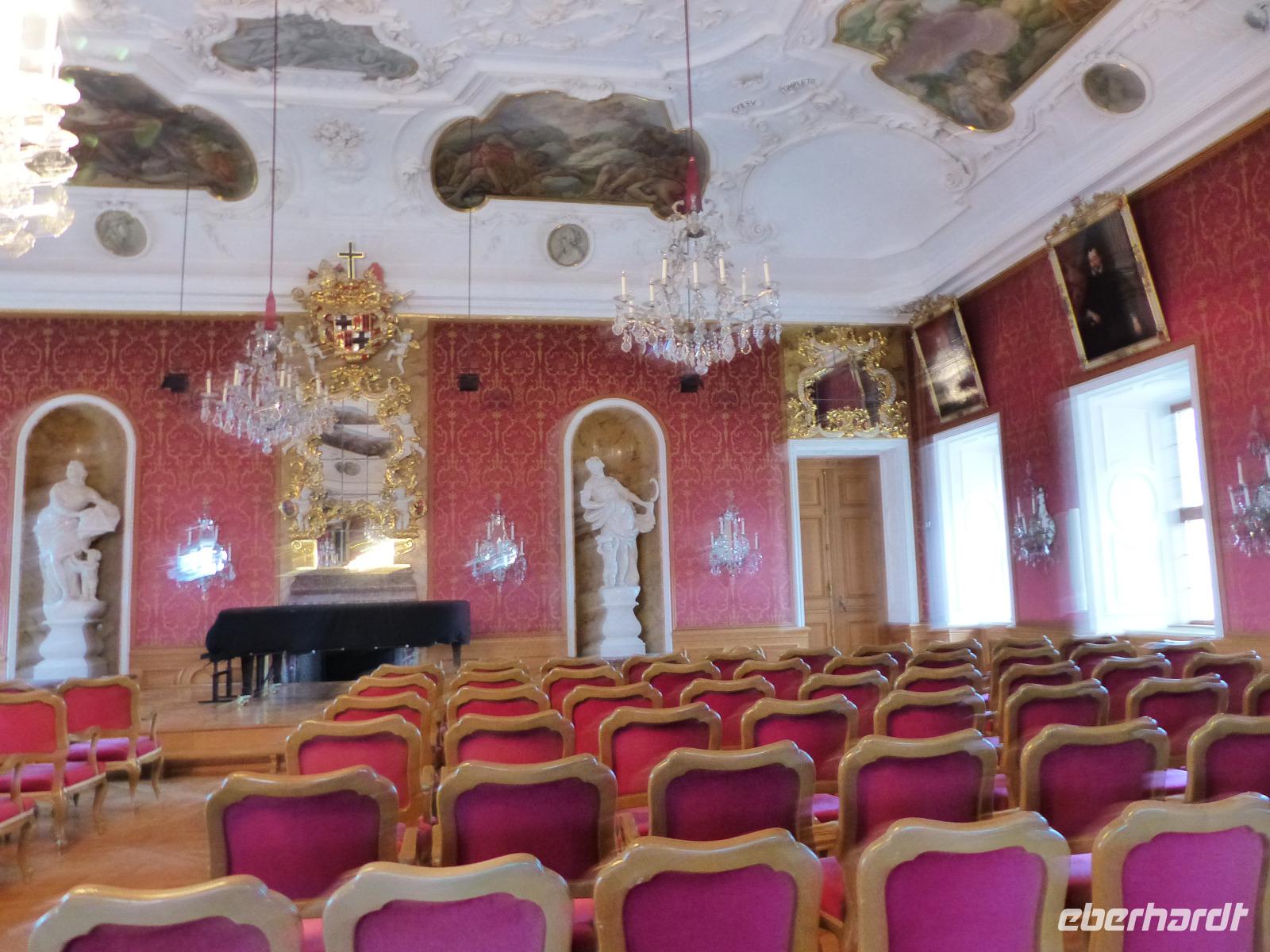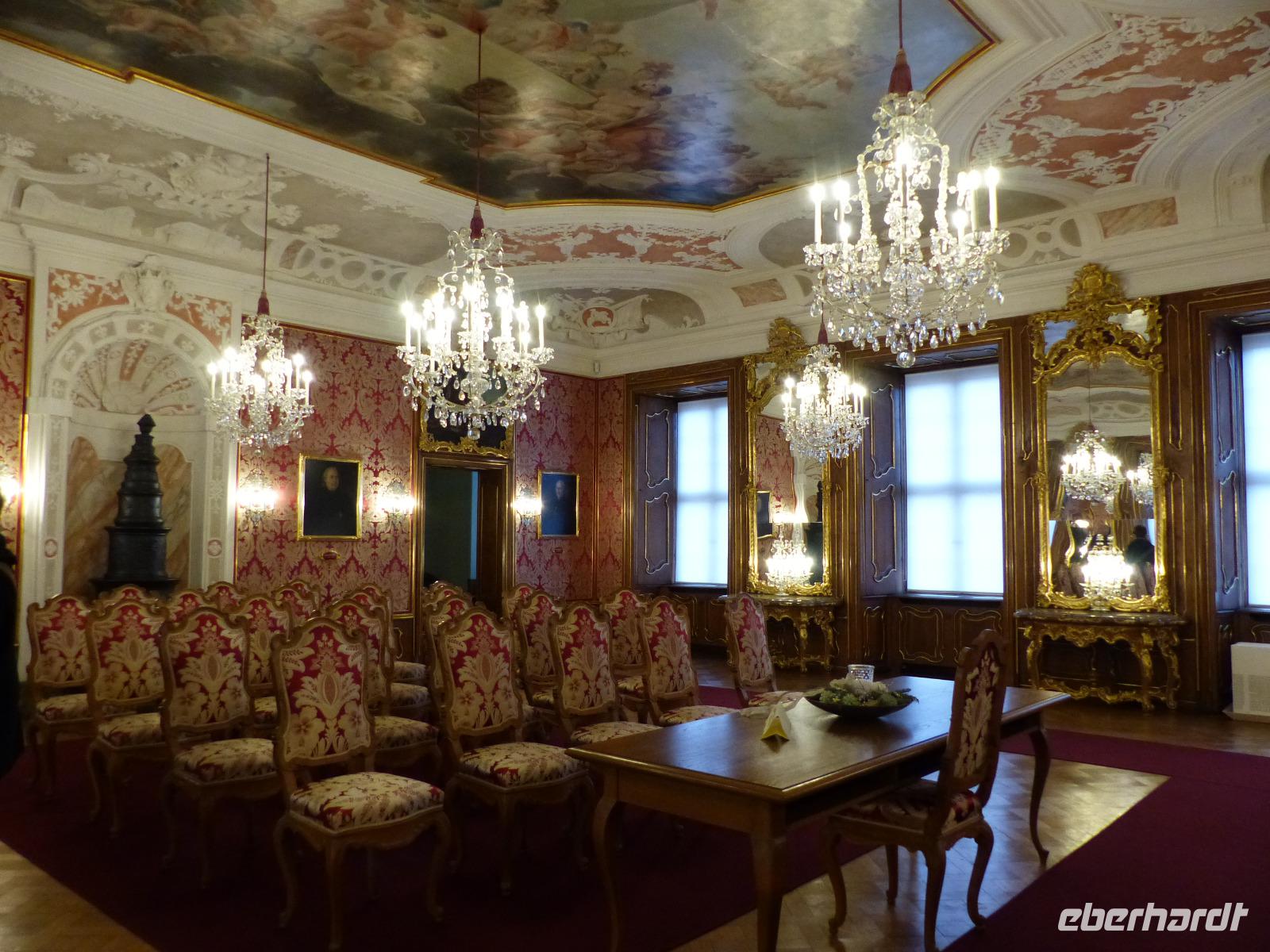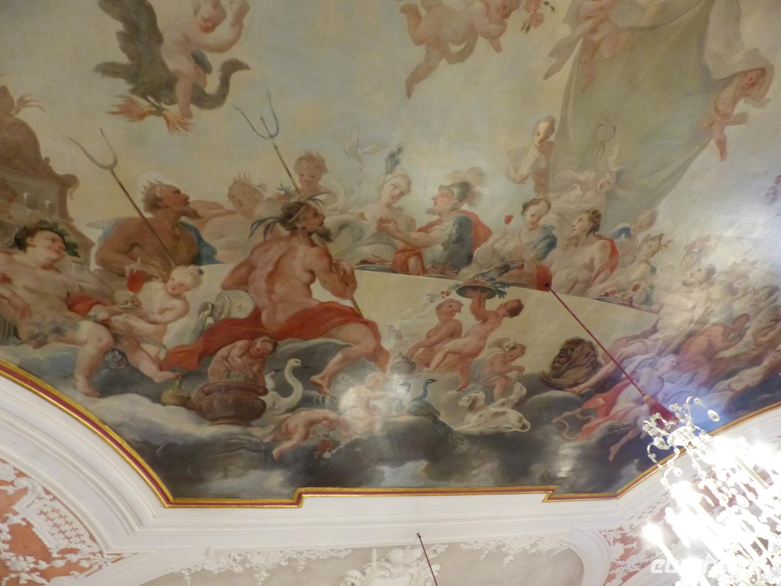 Die Prunksäle des Schlosses, sowohl einige der Empfangssäle der Fürstäbte, die im 18. Jh. zu Fürstbischöfen erhoben wurden, als auch Privaträume und das Spiergelzimmer konnten wir besichtigen und besonders einige der prunkvollen Deckengemälde bestaunen.