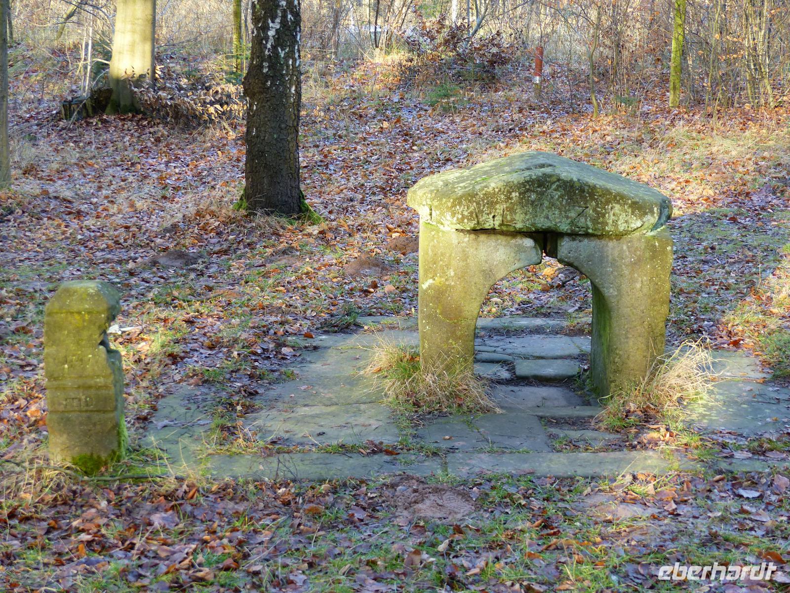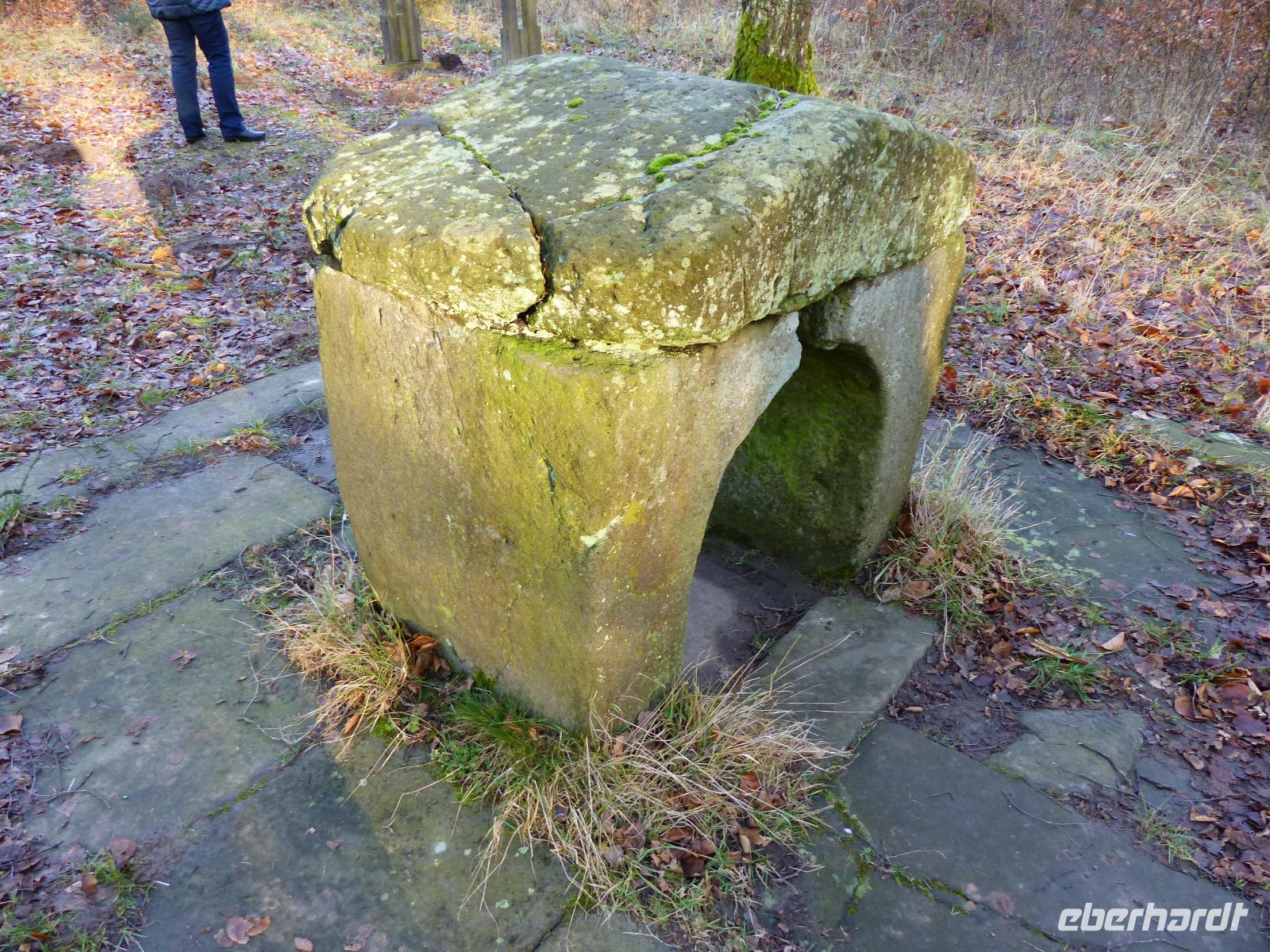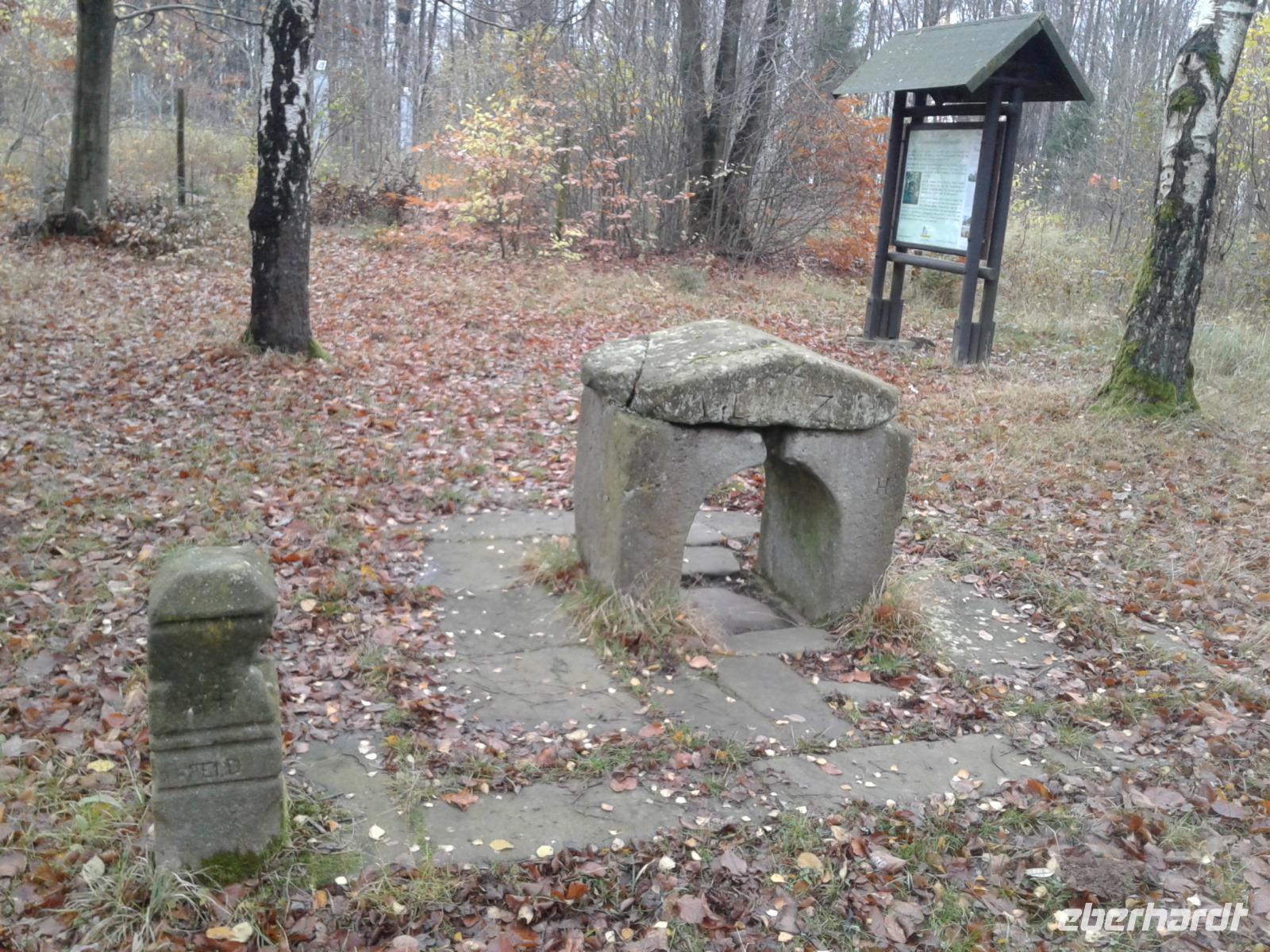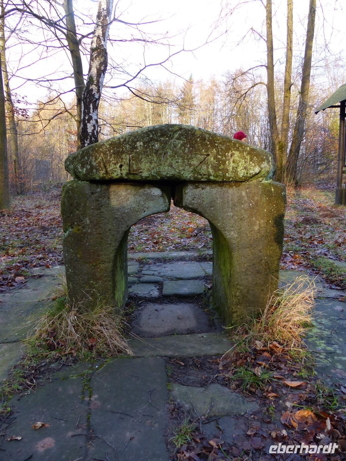 Heute zum zweiten Weihnachts-Feiertag gönnten wir uns gleich zum Tagesauftakt ein „Richtig-Reisen-Extra". Das Wetter war schön und so suchten wir eine kleine, an einer Seitenstraße unscheinbar im Wald liegende alte Kultstätte auf. Das „Nadelöhr" ist heute eine Art „Häuschen" aus ein paar Sandsteinblöcken, nur etwa einen Meter hoch und breit mit einem niedrigen, torähnlichen Durchgang. Früher stand hier wohl ein Baum mit einem Loch, der den gleichen Zweck erfüllte wie das später, wenn man der eingekratzten Inschrift folgt, 1561 aufgestellten Steinhäuschen: zu bestimmten Zeiten, etwa der Wintersonnenwende, sollte man hindurchkriechen und auf diese Art die Heilkräfte der Natur und die Dämonen beschweren. Ein auf germanische oder wahrscheinlicher sogar keltische Zeiten zurückgehendes Reinigungsritual steht dahinter. An vielen Orten hat sogar die katholische Kirche diese Bräuche vereinnahmt und sogernannte „Schlupfaltäre" errichtet. Bis heute behaupten die Friedewalder übrigens, dass man gesund bleibe, wenn man durch das Nadelöhr krieche... Zwar war das Wetter noch recht schön, aber wir haben das mit dem Durchkriechen dann doch nicht probiert...