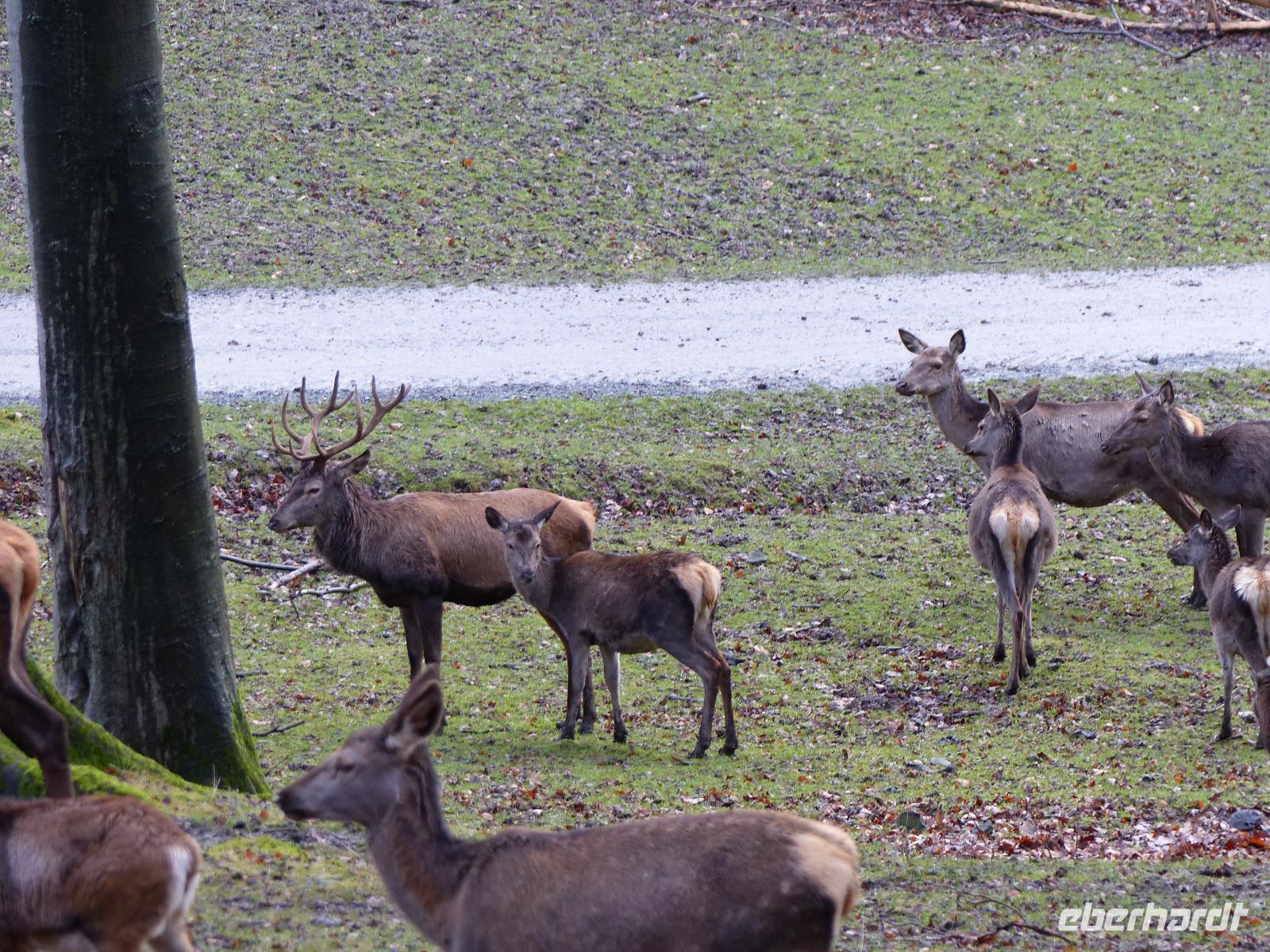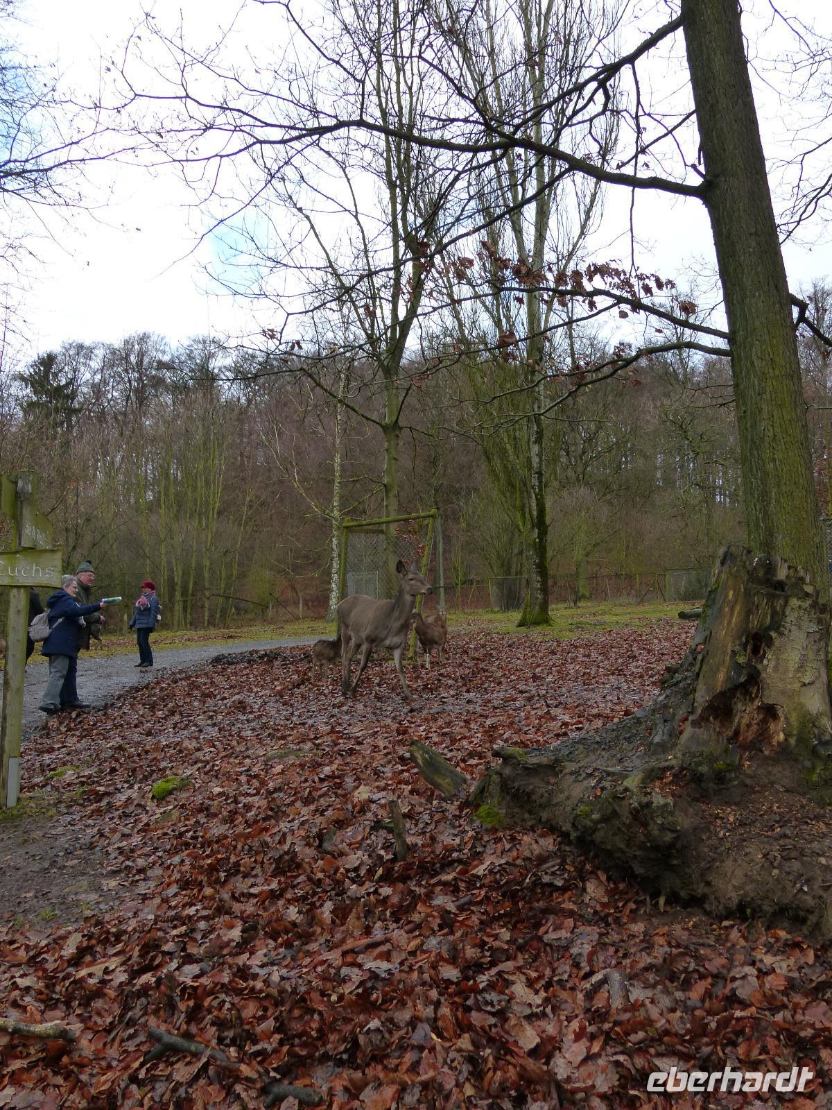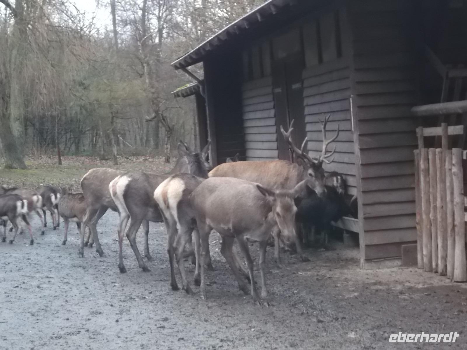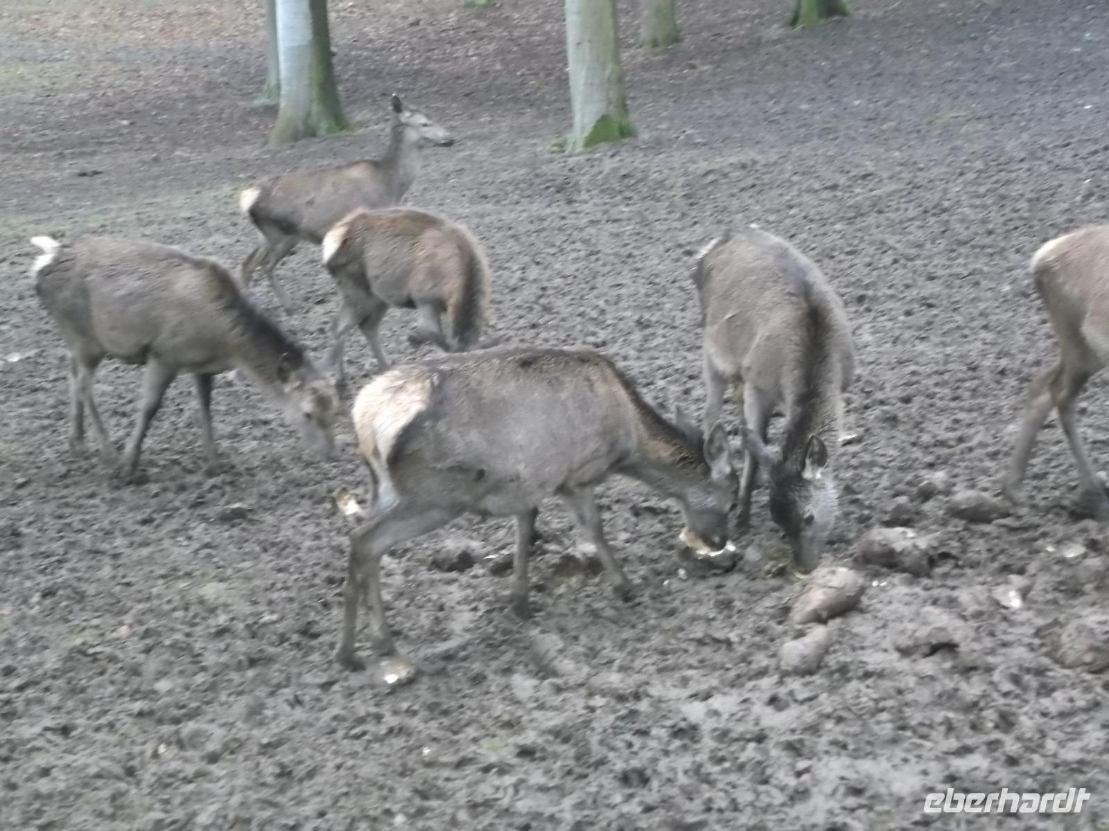 Und wir wurden nicht enttäuscht! Gleich nach Betreten des Wildparks kamen uns ganz zutraulich ganze Herden von Rehen und Hirschen entgegen. Luchse waren in ihrem Gehege zu sehen, nur wenig entfernt gab es Wildpferde, Wildschweine und tatsächlich Wölfe! Da auch das Wetter seit Alsfeld trocken war, hatten wir einen angenehmen Spaziergang, der seinen Höhepunkt in der nachmittäglichen Wildfütterung fand.