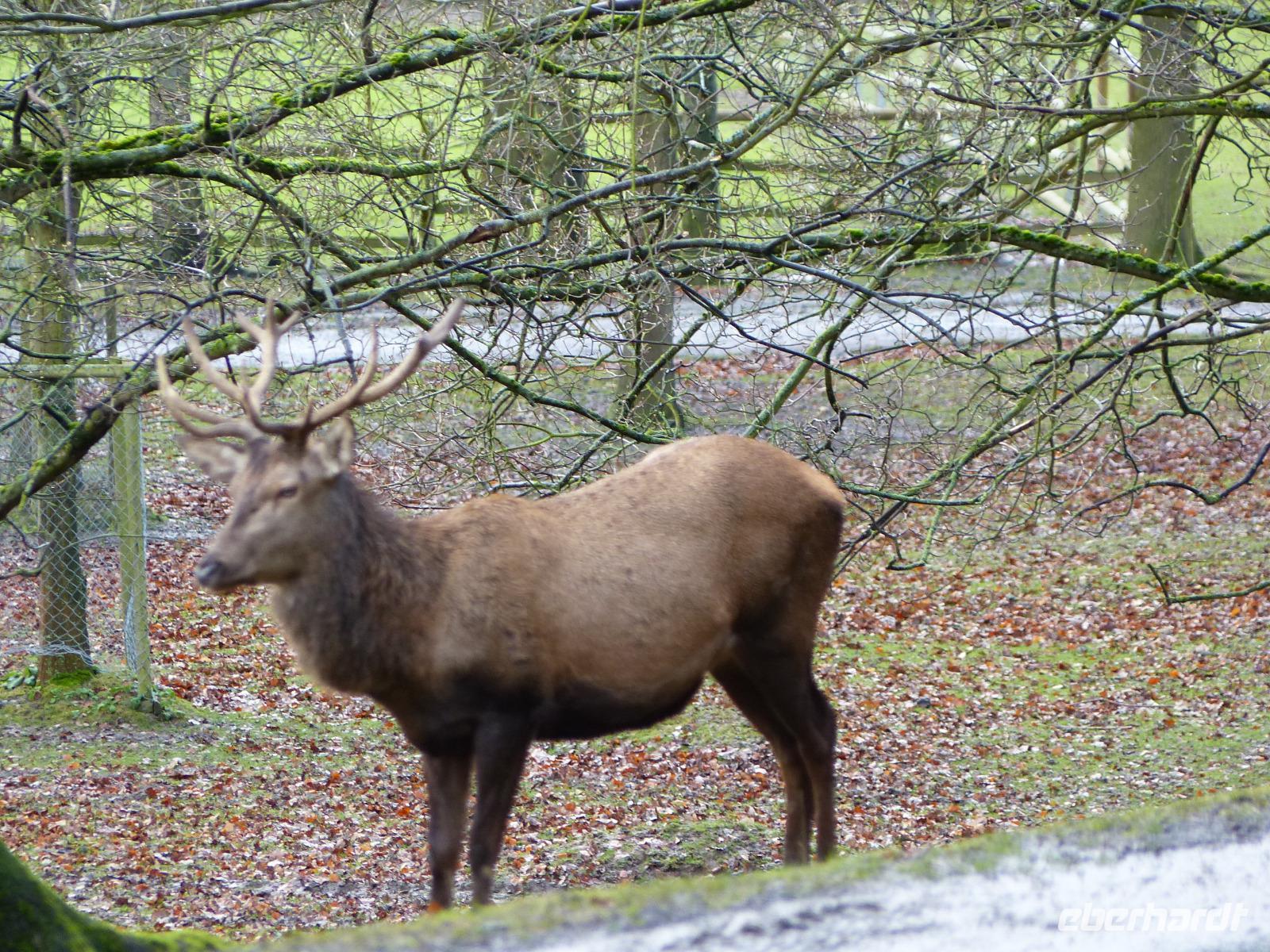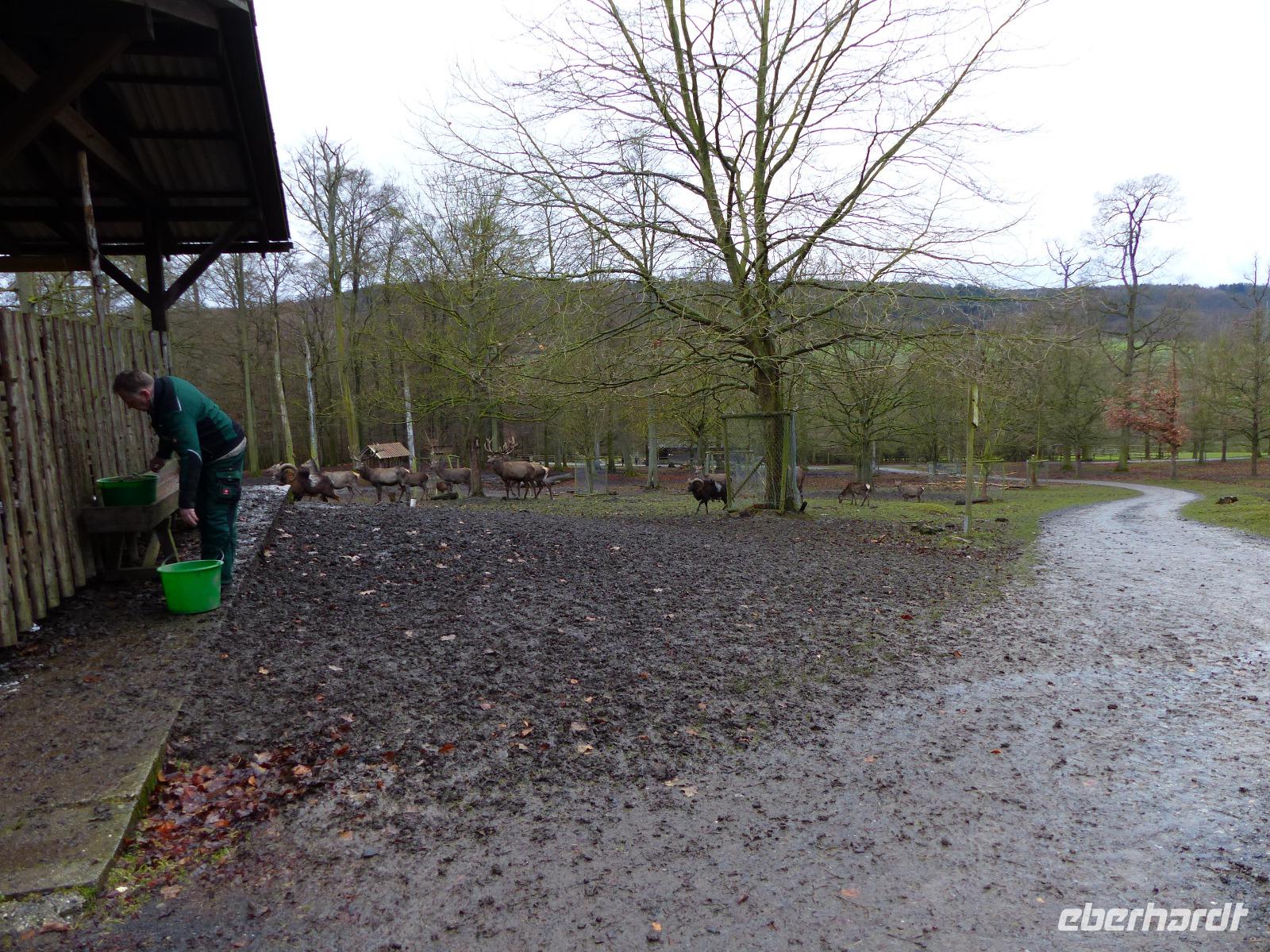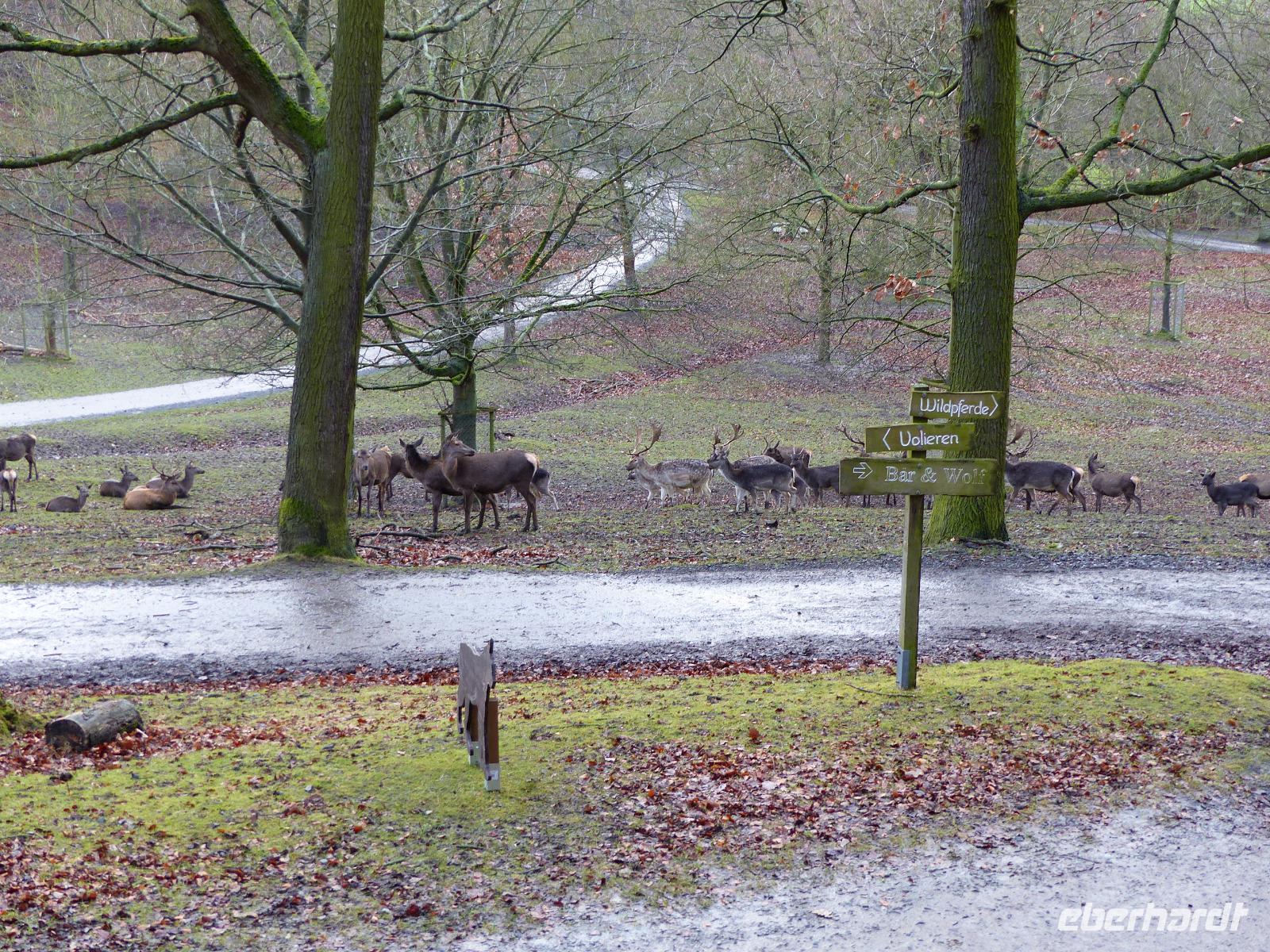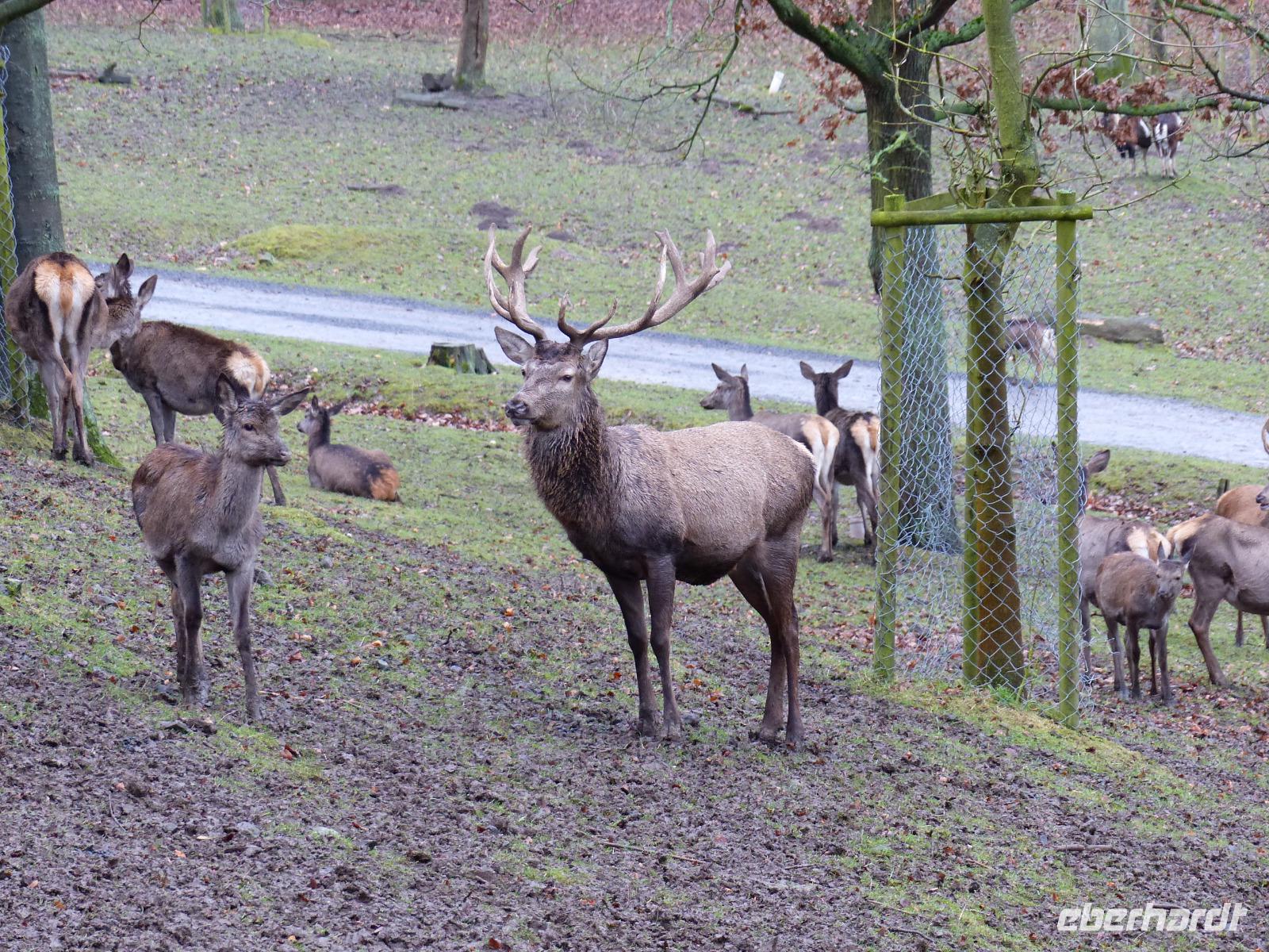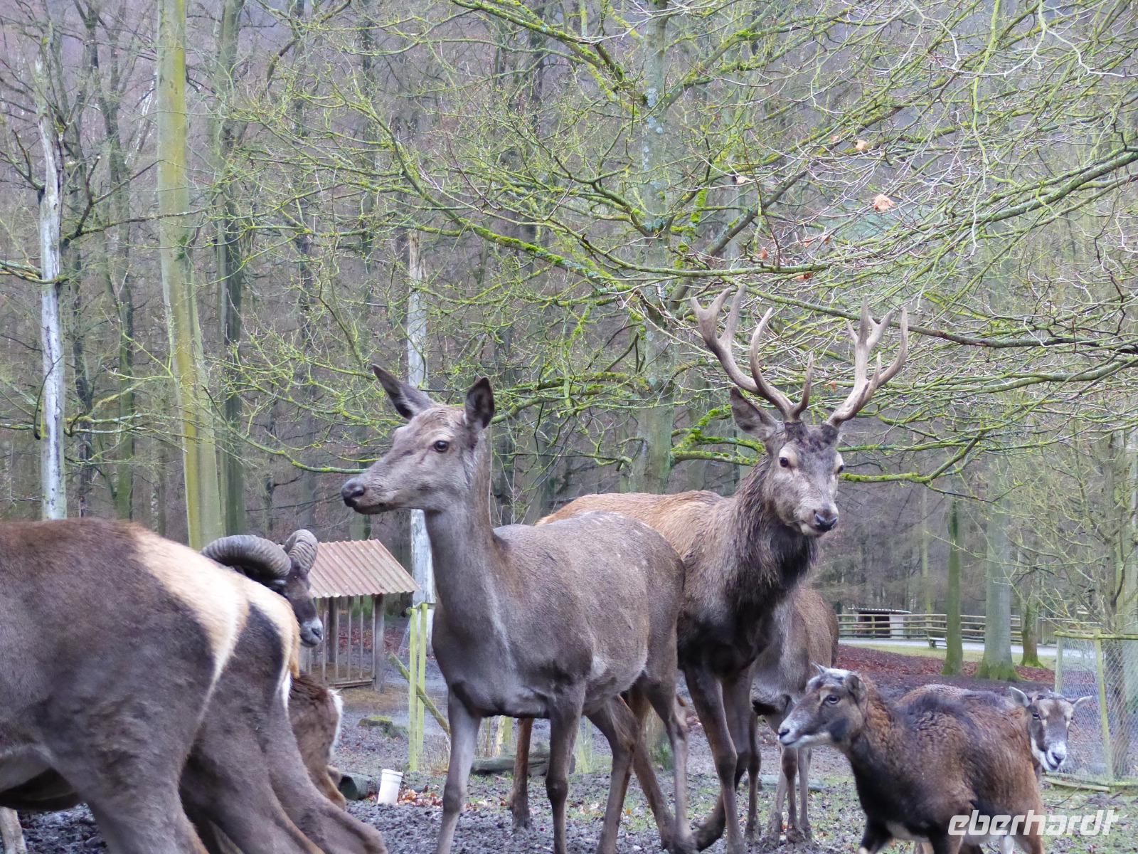 Und wir wurden nicht enttäuscht! Gleich nach Betreten des Wildparks kamen uns ganz zutraulich ganze Herden von Rehen und Hirschen entgegen. Luchse waren in ihrem Gehege zu sehen, nur wenig entfernt gab es Wildpferde, Wildschweine und tatsächlich Wölfe! Da auch das Wetter seit Alsfeld trocken war, hatten wir einen angenehmen Spaziergang, der seinen Höhepunkt in der nachmittäglichen Wildfütterung fand.