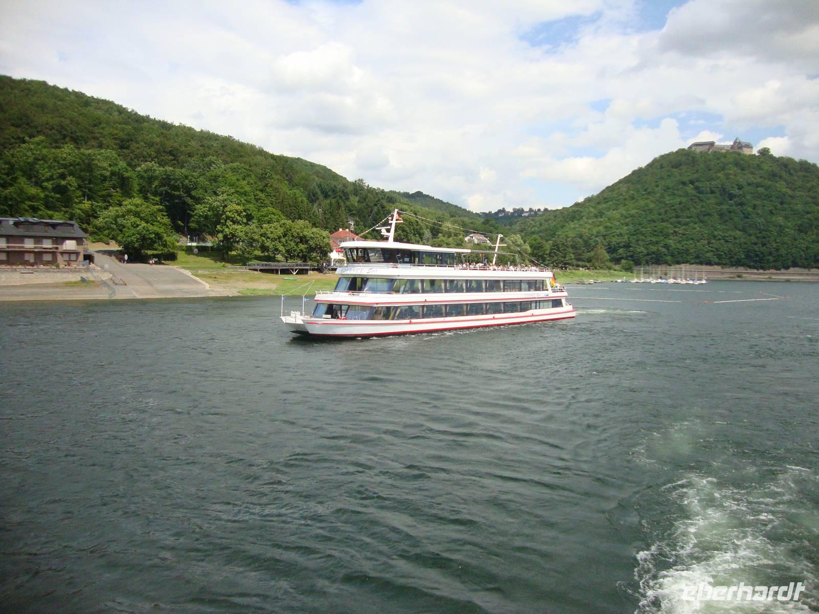 Zuerst besuchten wir das kleine Städtchen Wolfhagen mit dem Märchenbrunnen, wo wir unser Gruppenfoto zur Erinnerung an die Reise machten. Geprägt von hübschen Fachwerkbauten der Weserrenaissance ist es ein Kleinod in der Ferienregion Edersee. Bevor wir am Mittag eine zweistündige Rundfahrt unternahmen führte uns Thomas noch um den landschaftlich sehr schön gelegenen Stausee, welcher in diesem Jahr sein hundertes Jubiläum feiert. Mit dem MS "Stern von Waldeck" ging es dann auf Fahrt um die schöne Landschaft vom See aus zu entdecken. Bis zur Staumauer fuhr unser Schiff, die wir anschließend zu Fuß begehen konnten. Auf dem Schloss Waldeck, hoch oben über dem See gelegen gab es für alle Kaffee und Kuchen, eine gute Idee zum Samstag Nachmittag.
