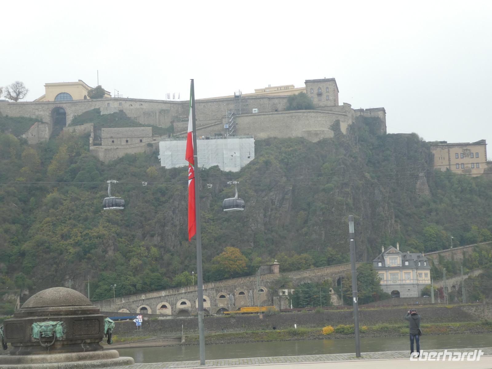 Auf nach Koblenz zum Deutschen Eck. Nach einer kurzen Fahrt entlang des Rhein erreichten wir Koblenz. Wir wurden schon erwartet und unsere Stadtführung begann am Kaiser Wilhelm Denkmal am Deutschen Eck dort wo die Mosel in den Rhein fließt. Das Denkmal entstand 1897 wurde jedoch im März 1945 zerstört. Erst 1993 wurde Kaiser Wilhelm wieder auf den Sockel gehoben. Außerdem hatten wir einen schönen Blick auf die Burg Ehrenbreitstein oberhalb des Rhein. Wir erreichten die alte Stadtmauer und sahen schon von weitem die Basilika St. Kastor. Sie ist die älteste Kirche in Koblenz. Wir erreichten den Görresplatz und bestaunten den Brunnen mit der Historiensäule. Dort wird die Geschichte von Koblenz dargestellt. Von dort aus spazieren wir zum Rathausplatz. Hinter dem Rathaus befindet sich der Schängelbrunnen. Das Wahrzeichen Koblenz steht als kleiner Bub auf dem Sockel und spukt regelmäßig einen Wasserstrahl. Weiter spazieren wir zum Florinsmarkt wo sich das Danzhaus befindet. Dort ist der „Augenroller" zu sehen der seine Augen bewegt und aller halben Stunden die Zunge heraussteckt. Dort trennten sich unsere Wege. Einige Gäste nutzten die Freizeit für einen Bummel durch die Stadt oder zum Mittagessen. Mit den anderen Gästen fuhren wir mit der Seilbahn zur Festung Ehrenbreitstein. Die Seilbahn wurde anlässlich der BUGA 2011 in Betrieb genommen. Behutsam schwebten die Gondeln zum Festungsgelände. Wir genossen den schönen Blick auf das Rheintal und die Stadt Koblenz. Oben angekommen besuchten wir die Festungsanlage. Dort befindet sich das Landesmuseum Koblenz und eine Jugendherberge. Auch von der Aussichtsplattform in 118 Meter Höhe lassen wir den Blick schweifen und können an Hand der farblichen Abstimmung genau sehen wo Rhein und Mosel zusammenfließen. Wir fahren weiter nach Arenberg wo sich die Pfarrer Kraus Anlagen befinden. In der religiösen Parklandschaft besuchten wir die Wallfahrtskirche. Auffällig waren die verschiedenen Baumaterialien wie Lavagestein, Muscheln und Bergkristalle. Anschließend spazierten wir durch die Gartenanlage und bestaunten den Paradies- und Erlösergarten.