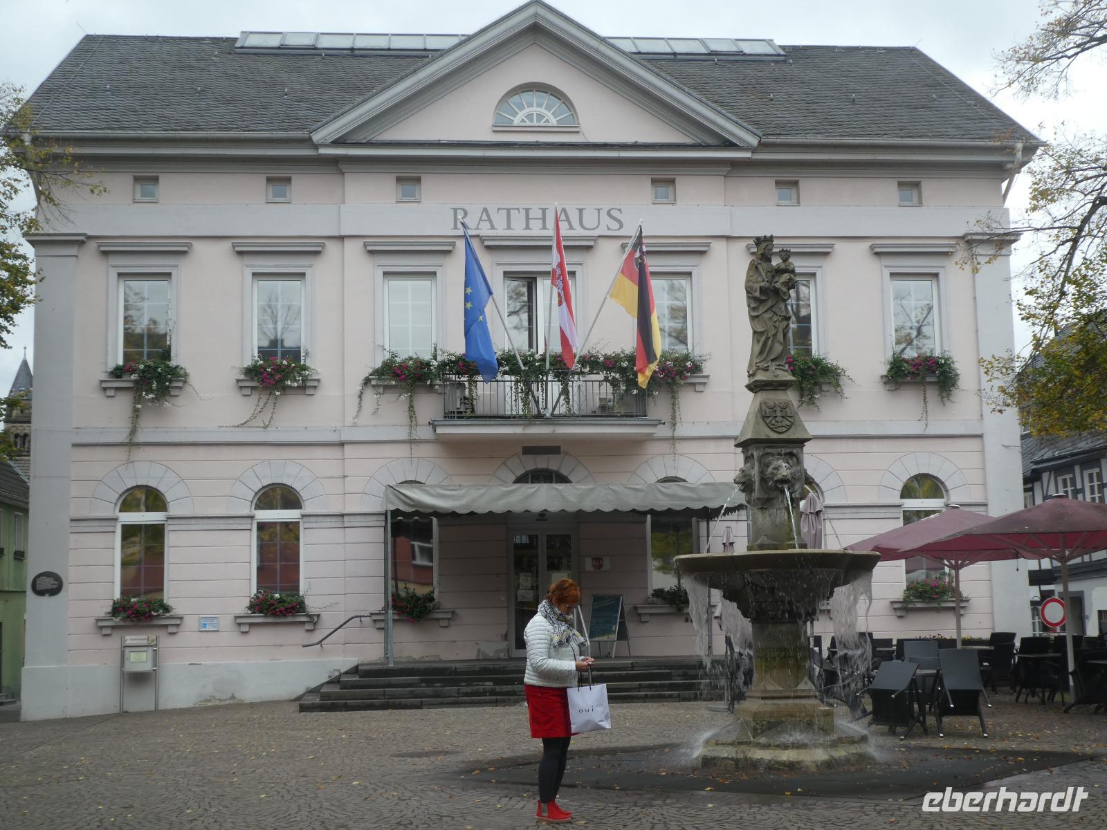 Heute erkundeten wir Bad Breisig. Der Ort entstand vor etwa 2500 Jahren als keltisch-römische Siedlung. Auf Grund der 6 vorhandenen Quellen wurde er 1958 zum Kurort ernannt. Zuerst brachte uns die Gästeführerin die Geschichte des Hotels näher und erzählte die Sage „Über den Spuk am Mühlenteich". Vorbei an der Seniorenresidenz erreichten wir den Kurpark. Er ist mit seiner alten Baumkultur ein beliebter Treffpunkt für Einheimische und Touristen. Der Springbrunnen ist besonders am Abend sehenswert wen er in verschiedenen Farben erstrahlt. Auf der anderen Seite des Rhein befindet sich oberhalb von Bad Hönningen das Schloss Arenfels. Auch in Bad Breisig gibt es eine Burganlage die Burg Rheineck. Leider ist diese in Privatbesitz und nicht zu besichtigen. Wir erreichen das Alte Rathaus wo jetzt ein Puppenmuseum beheimatet ist. Leider hatte es geschlossen. Im ehemaligen Kurhaus werfen wir einen Blick in die Römer Terme. Ein kleines Thermalbad welches 1991 eröffnet wurde und durch den Geyrsprudel gespeist wird. Weiter ging es in die Altstadt wo einige schöne Fachwerkhäuser zu sehen sind. Ein Blick in die Kirche und schon befanden wir uns an der Rheinpromenade. Neben schönen Fachwerkhäusern, in denen sich verschiedene Restaurants befinden bestaunten wir das älteste Haus des Ortes Das Alte Zollhaus. An der Uferpromenade kehrten wir zum Mittag ein bevor wir nach Andernach fuhren. Nach einem kurzen Spaziergang wurden wir an der Anlegestelle schon erwartet. Mit dem Geysirschiff fuhren wir zur Halbinsel Namedyer Werth. Bereits um 1900 wurden dort erste Aktivitäten bemerkt. Doch erst durch eine Bohrung 1903 war man sich sicher etwas Besonderes entdeckt zu haben. Den größten Kaltwasser-Geysir der Welt mit einer Fontäne von 60m Höhe. Seit 2008 ist dies im Guinness Buch der Rekorde verewigt. Nach einer kurzen Fahrt legten wir an der Halbinsel an und spazierten zum Geysir. Wir traten nah an die Ausbruchstelle heran und sahen schon ein langsames Sprudeln. Nun war es so weit langsam begab sich der Geysir in die Höhe. Mehrere Minuten war er zu sehen. Nach diesem Erlebnis fuhren wir mit dem Schiff wieder zur Rheinpromenade.