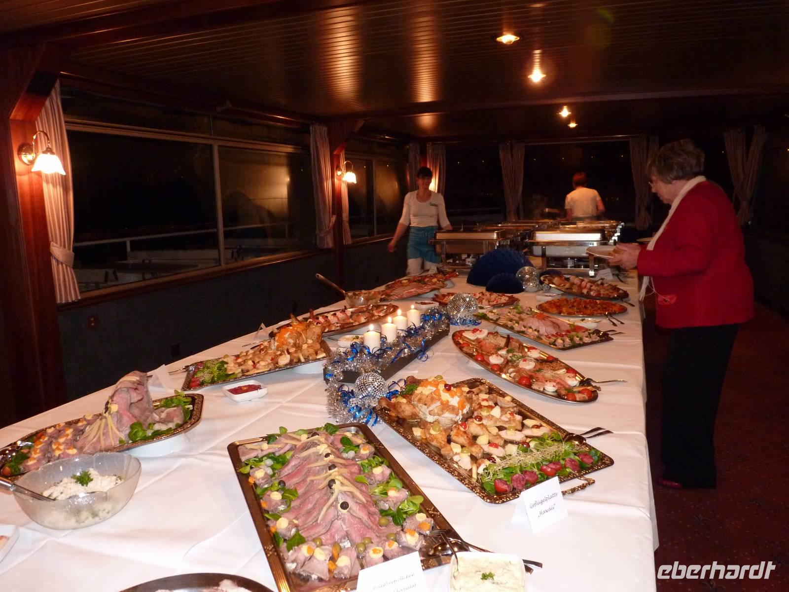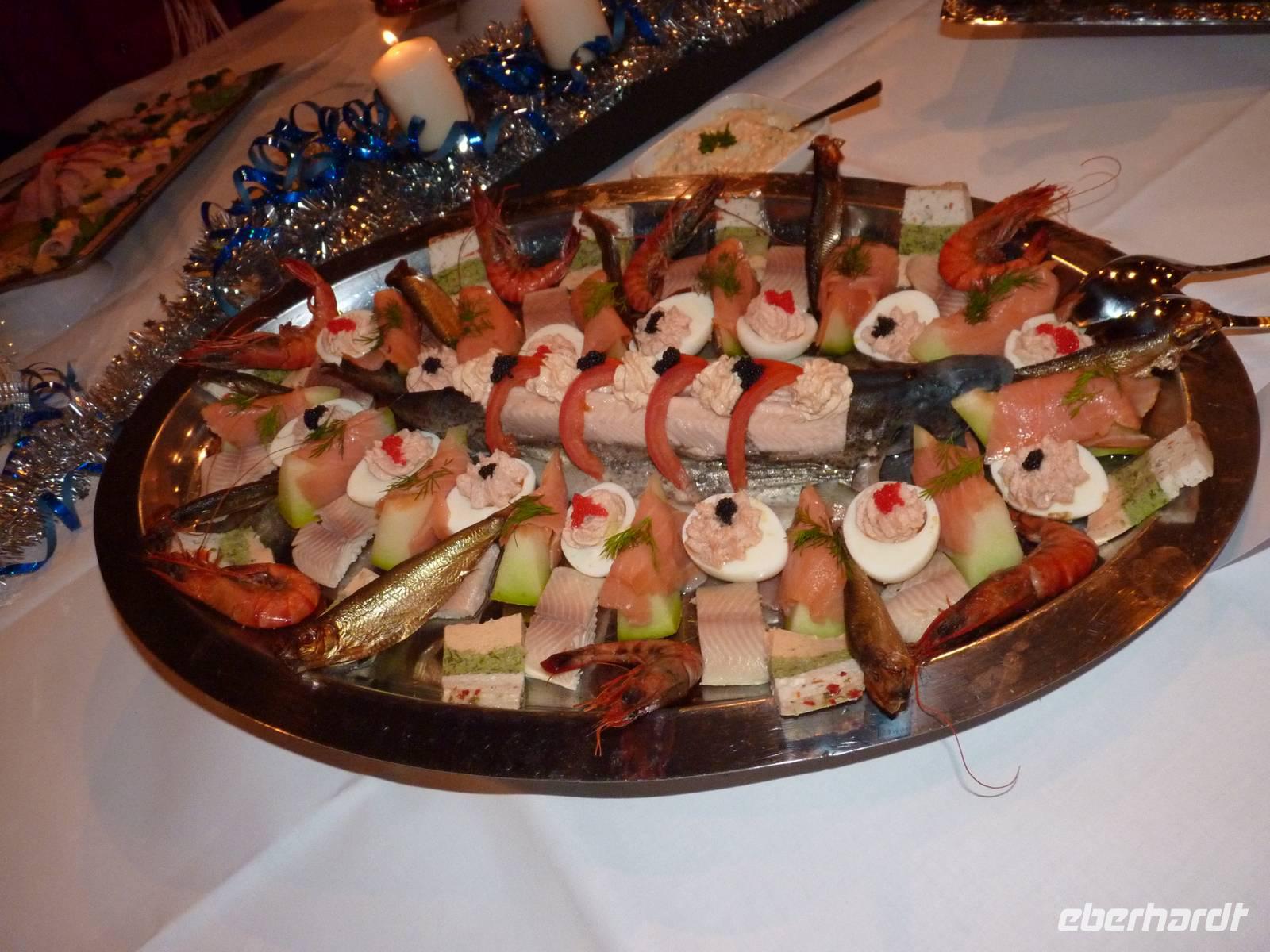 Gaumenfreuden, wie Räucherfisch, Braten, Geflügel, Lachs, Roastbeefröllchen, Schweinefilet, Burgunderbraten, verschiedene Gemüse und Beilagen, eine Dessertauswahl und zu später Stunde ein Käsebuffet sorgten für das leibliche Wohl.