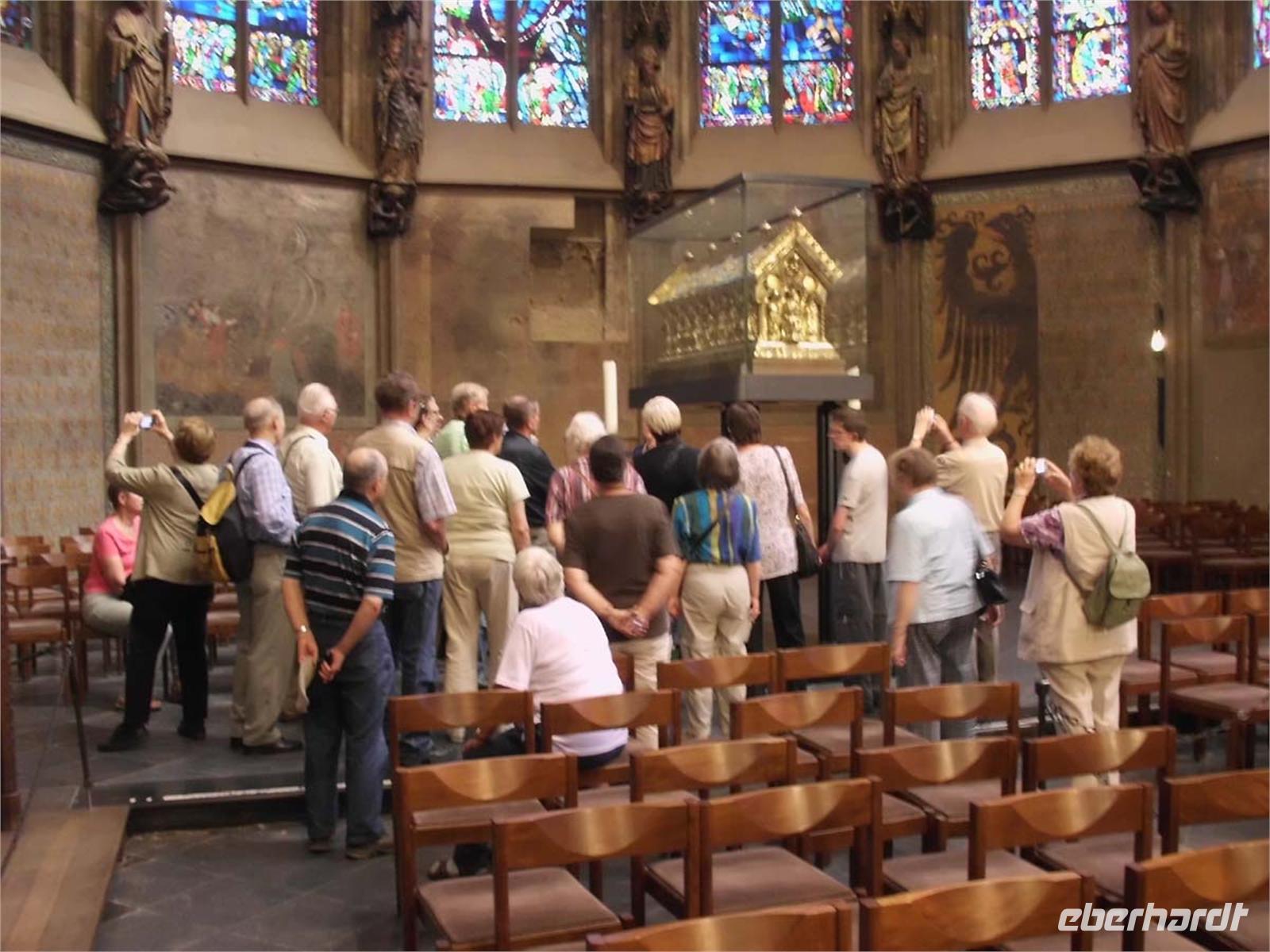 Am Nachmittag reisen wir in die Stadt Karls des Großen nach Aachen. Vor einem kleinen Spaziergang durch die Altstadt, den Pfalzbezirk und über den Marktplatz bekommen wir eine Führung durch den Dom und die Schatzkammer. Wir betrachten hier u. a. den Kaiserthron auf dem sich 37 deutsche Herrscher zum König haben Krönen lassen.