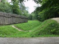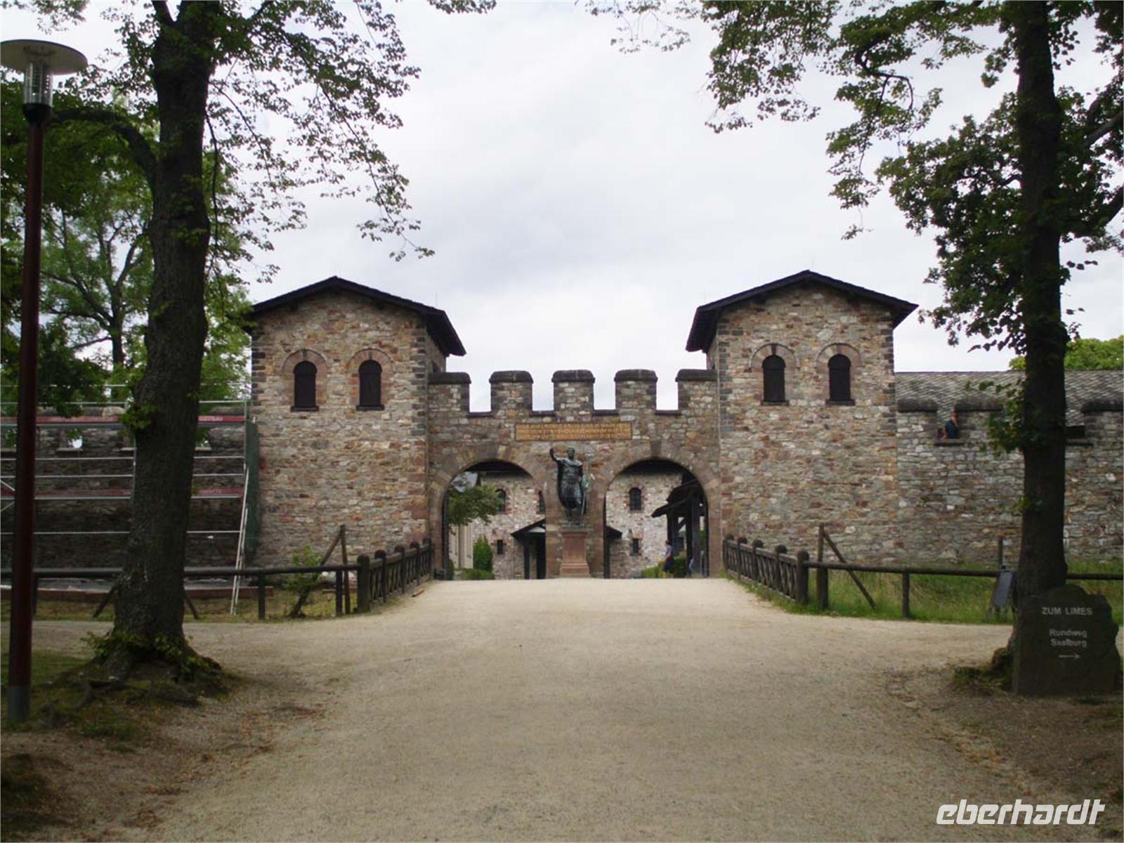 Unser erster Besichtigungspunkt ist die Saalburg bei Bad Homburg v. d. H. Es handelt sich um das am besten erforschte Limeskastel Deutschlands, das zum Weltkulturerbe gehört und seit der Zeit Kaiser Wilhelms I. rekonstruiert wird. Um 80 n. Chr. in Form einfacher Schanzen errichtet, erfuhr es bis zu seiner Zerstörung durch die Alemannen um 260 n. Chr. mehrere Erweiterungen und bauliche Verbesserungen von Holz zu Stein. Gleich hinter dem Lager verläuft der Limes, der noch als ca. 1,5 m hoher Wall im Wald zu