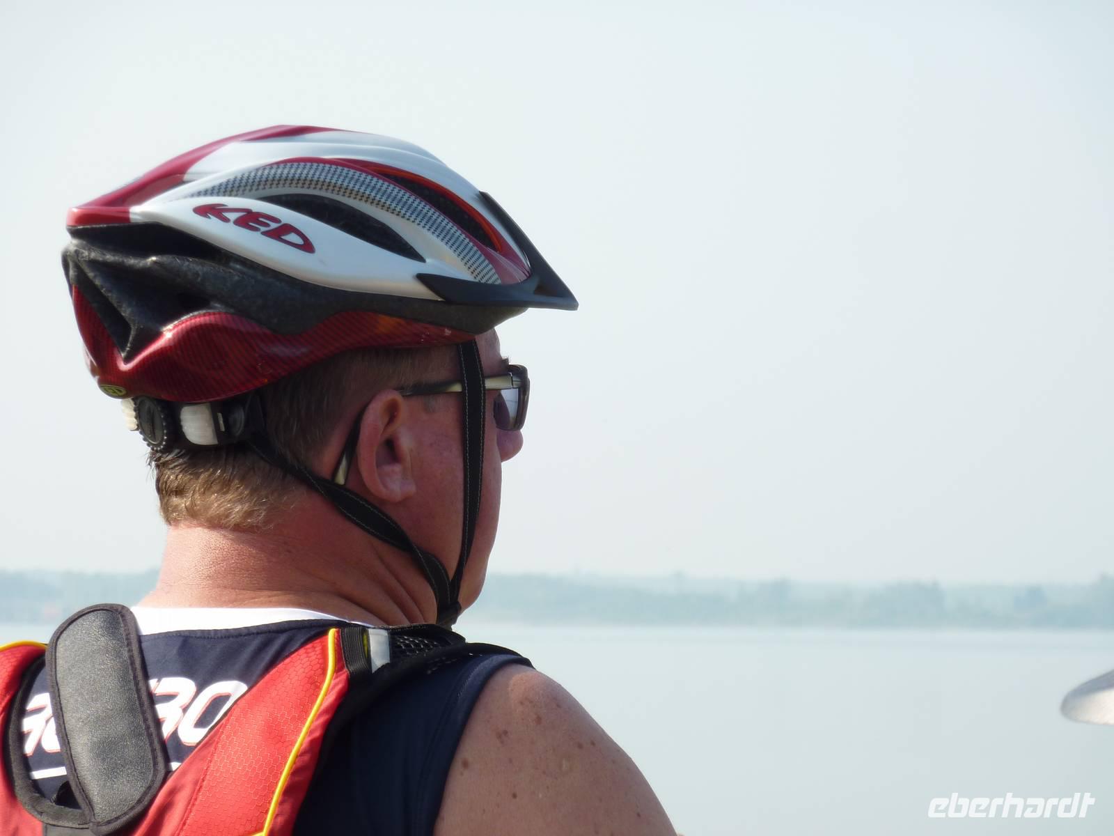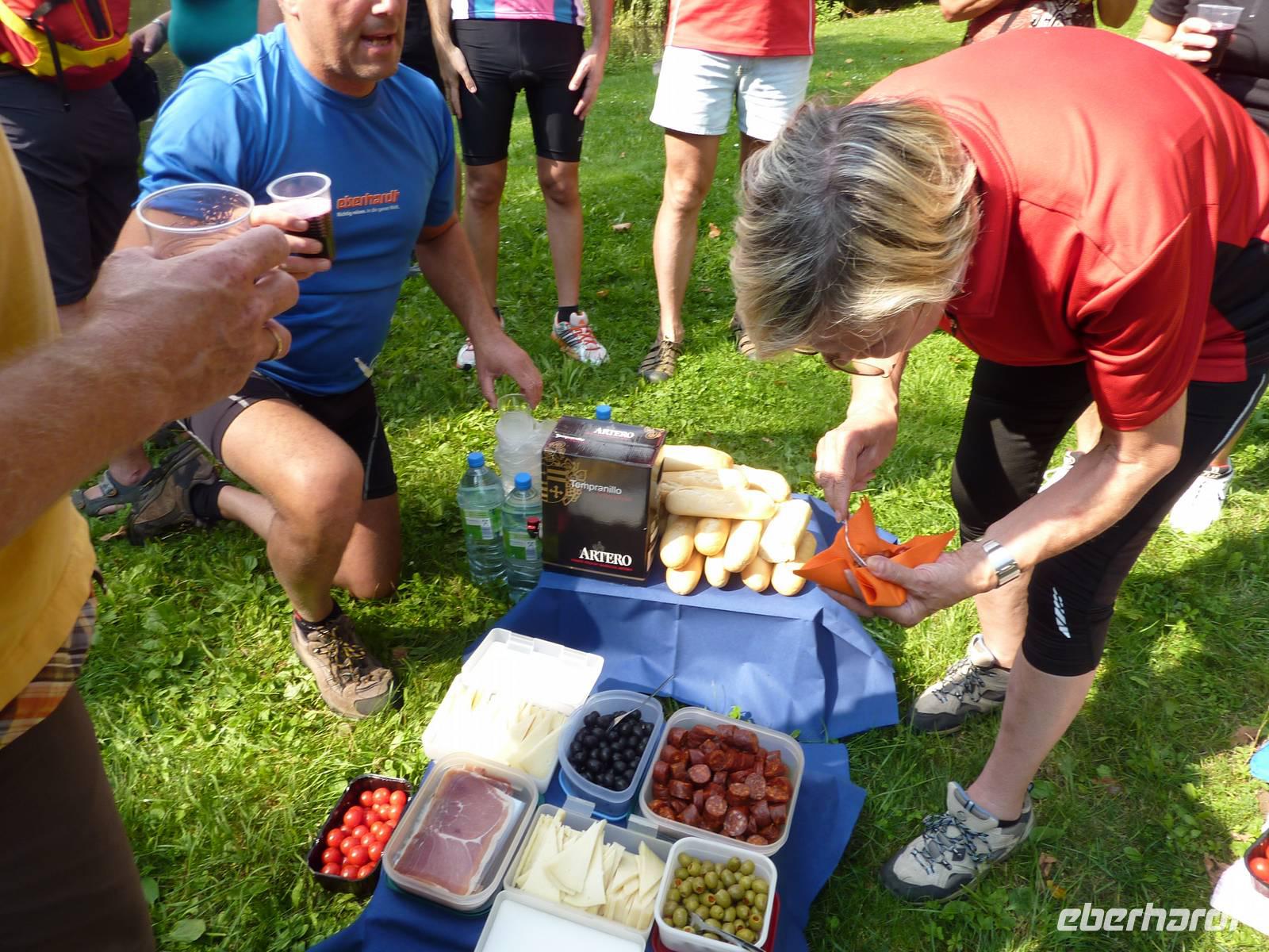 Nach dem leckeren Frühstück sammelten wir uns alle bei strahlendem Sonnenschein mit den Rädern vorm Hotel. Mit Blick auf die Karte stellte Jens die heutige Radtour rund um das Leipziger Neuseengebiet vor. Die führte uns zunächst vorbei am Markkleeberger See mit seinen schon recht gut ausgebauten touristischen Einrichtungen hin zum eher noch verschlafenen Störmthaler See. Dessen Markenzeichen, der schwimmende Veranstaltungsort VINETA, markiert die verlorene Magdeborner Kirche und ist ein Mahnmal für die Orte, die dem Espenhainer Tagebau weichen mussten. Bei der Weiterfahrt durch kleine Ortschaften, die durch die Stilllegung des Tagebaus der Abbaggerung entgangen sind, kamen wir auch nach Mölbis. Hier war es Zeit für eine kleine Kaffee-, Radler-, Bierpause. Anschließend erklommen wir mit den Rädern die Halde Trages, ein über 60 m hohes Plateau, welches bei der Aufschließung des Tagebaus Espenhain durch die Aufschüttung von Abraum entstand. Vom 33 Meter hohen Aussichtsturm hatten wir einen herrlichen Ausblick auf die ehemalige Tagebauregion und das Umland. Weiter durchfuhren wir Espenhain, kamen am Hainer See vorbei und erreichten mit dem Schlosspark Rötha einen idyllischen Ort für unser Picknick. In Erinnerung an die Radreise Andalusien stand es unter dem Motto Spanien. Bei lecker Schinken, Käse, Oliven und Baguette und auch einem Schlückchen Rotwein rasteten wir mit Blick auf Entenfamilien und zutraulichem Nutria. Unser Weg führte uns weiter durch ein neu aufgeforstetes Mischwaldgebiet auf ehemaligem Bergbau-Gelände - die Neue Harth. Entlang des Zwenkauer Sees und vorbei am Vergnügungspark Belantis erreichten wir mit dem Aussichtspunkt Bistumshöhe den Cospudener See. Der dortige kleine Kiosk mit seinen Erfrischungen kam uns bei der sommerlichen Wärme gerade recht. Und auch von der Möglichkeit, eine echte Bisonbratwurst zu verzehren, wurde Gebrauch gemacht. Bei der Fahrt um die Südspitze des Sees konnten wir dann auch die „Spender" der Grundzutat der Wurst beobachten. Rechtzeitig vor den Donnern und dem verdunkelten Himmel kehrten wir 16 Uhr zum Hotel zurück. Nach einer Erholungspause trafen wir uns 18:30 Uhr auf einen Aperitif aus Uwes eigenem Obstanbau auf dem Parkplatz. Wir verkosteten die flüssigen Quitten und Erdbeeren, stiegen dann in die Taxis und fuhren zu unserem spanischen Restaurant Bustamante in Leipzig. Optimistisch auf das trocken bleibende Wetter wählten wir den gemütlichen Patio - Innenhof im Restaurant. Mit dem schmackhaften Tapas Essen, der spanisch, herzlichen Mentalität des Restaurantchefs erlebten wir einen voll authentischen spanischen Abend mit viel Spaß und Unterhaltung.