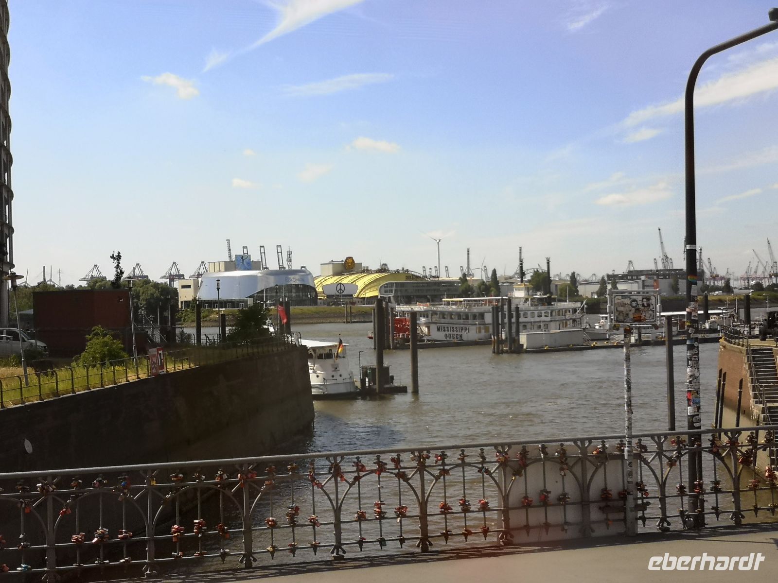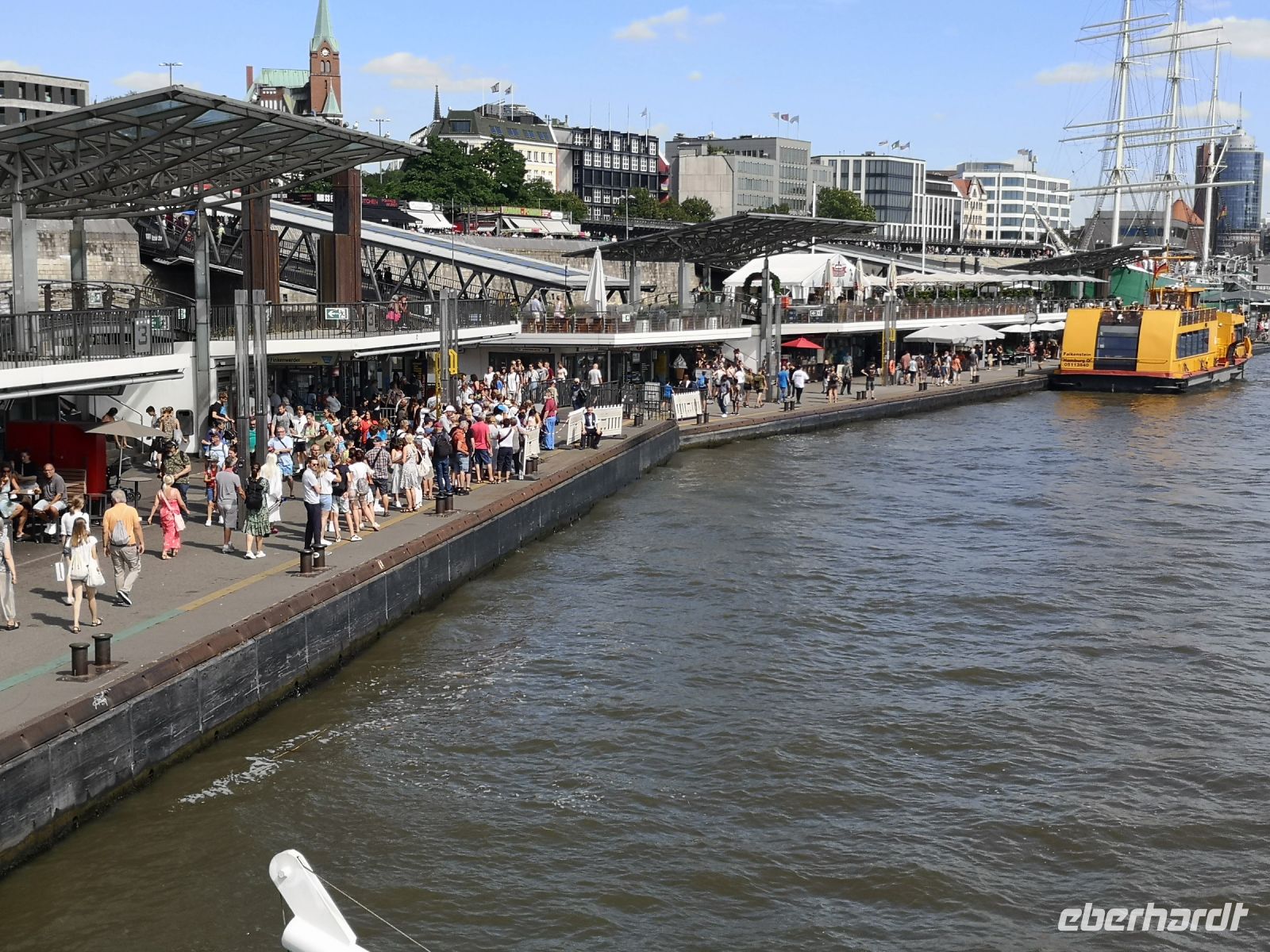Nach all den feinen Restaurants am Straßenrand, haben wir jetzt erst mal Hunger. Deshalb rollen wir über die Brücken, etwas steil nach unten, mit gemeinsamer Unterstützung, auf die St. Pauli-Landungsbrücken und finden was wir suchten. Überall gibt es hier die leckeren Heringsbrötchen, im Stehen, mit oder ohne Bierchen, oder gemütlich in einem der Terrassenrestaurants.