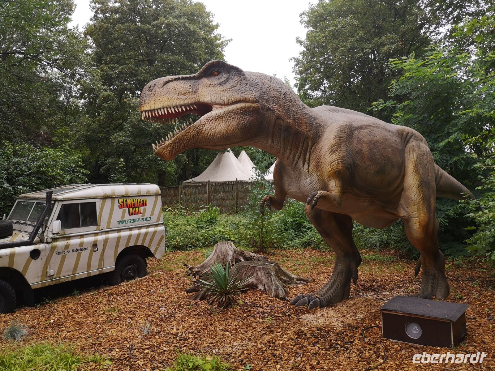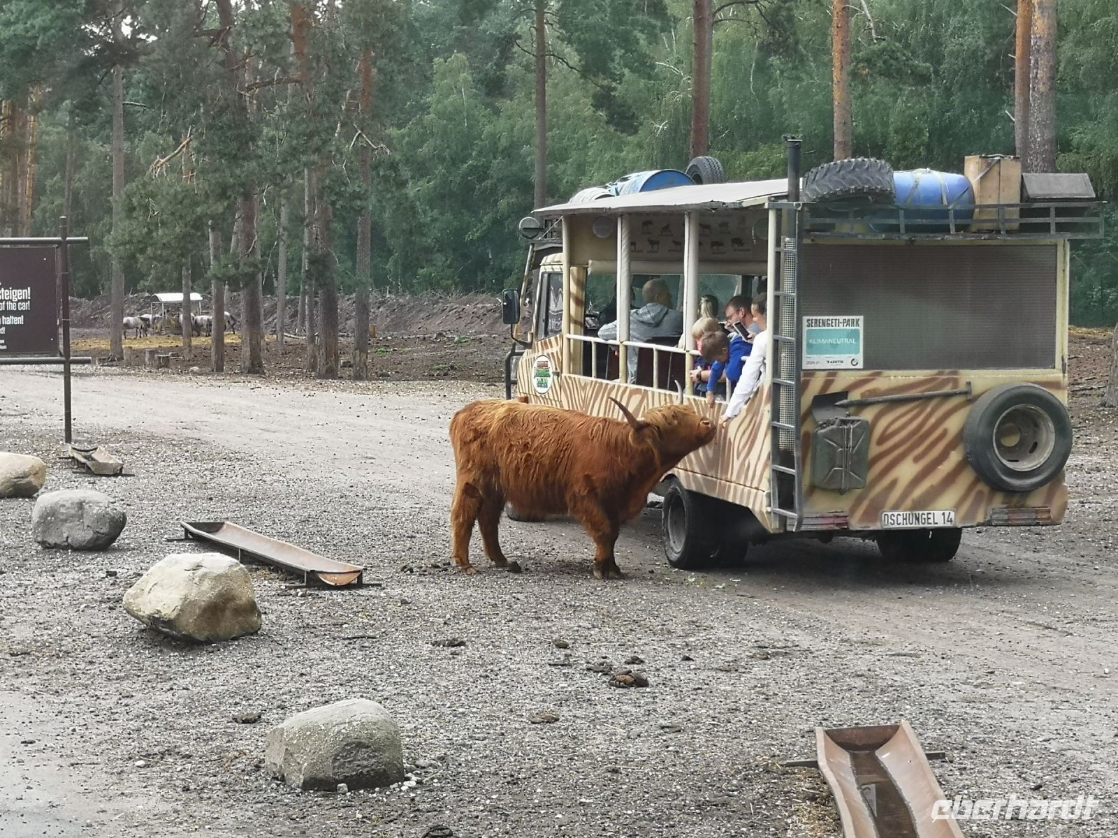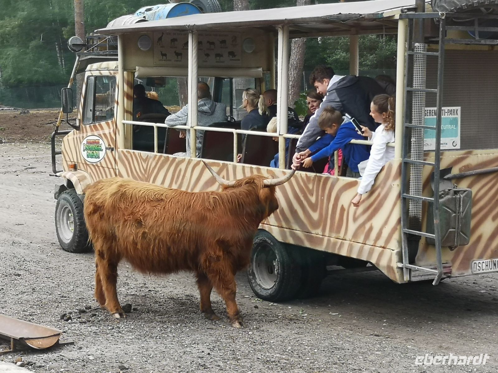 Wir wollten aber auch nicht nass werden, und entschieden uns erstmal für eine ausgiebige Würstchen und Suppenpause im Bus. Gut das Daniel seinen fahrbaren Kiosk immer gut gefüllt dabei hat. Schon zwei Würstchen später sah die Welt schon viel freundlicher aus. Der Regen hatte aufgehört und die Sonne kam auch zaghaft durch die Wolken. Jetzt konnten wir noch die Teile des Parks besuchen, die nicht mit dem Bus zu befahren sind. Die Dschungel- und die Abenteuer-Safari konnten alle mit den Rollstühlen gut und entspannt besuchen. Hier sind die Affen und ein Streichelzoo zu besuchen und für die abenteuerlustigen finden sich jede Menge Nervenkitzel mit Achterbahn und Co.