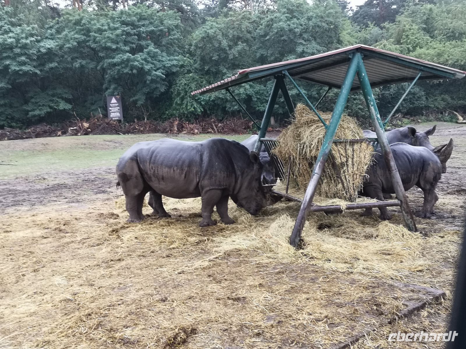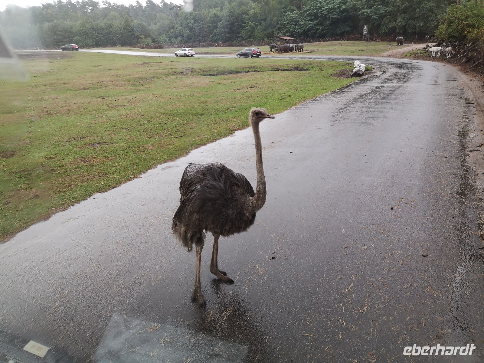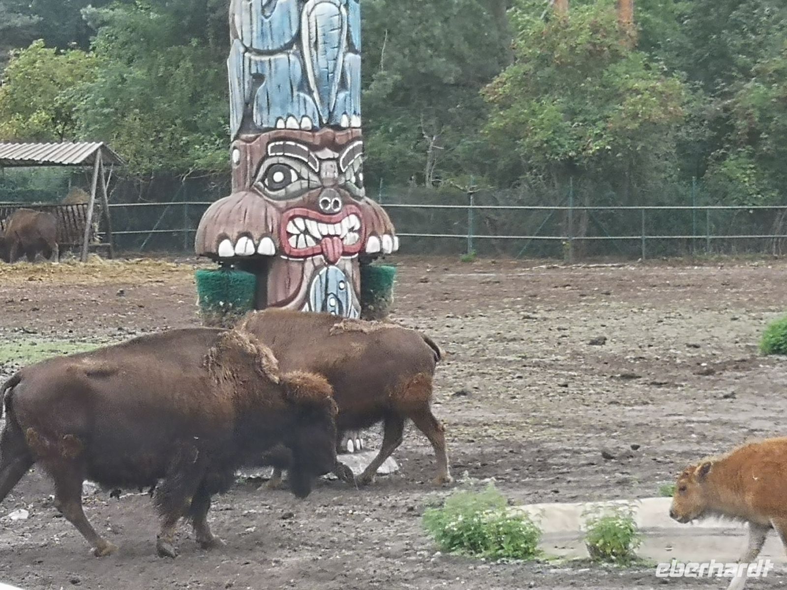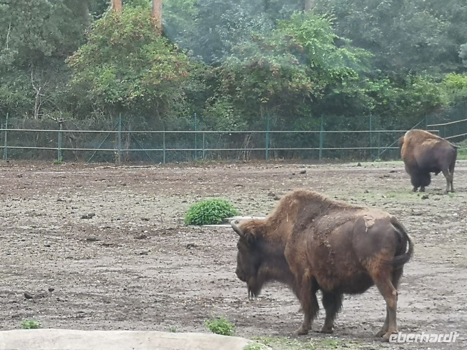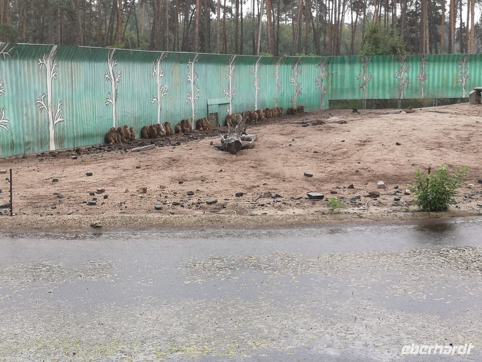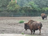 In der Zwischenzeit hat der Regen sich breit gemacht, was aber den nordamerikanischen Bisons, afrikanischen Löwen und auch den weisen Leoparden ziemlich gleichgültig war. Absolut nicht entspannt war eine Herde Affen, die sich alle unter den Überstand ihres Zauns zwängte um ja nicht nass zu werden.