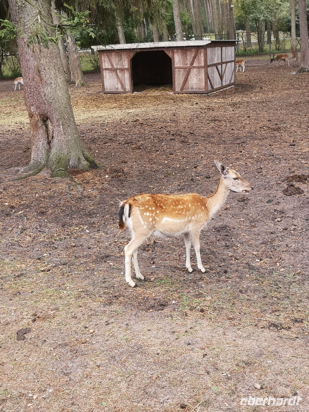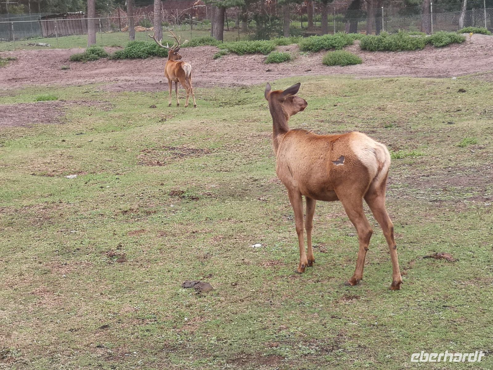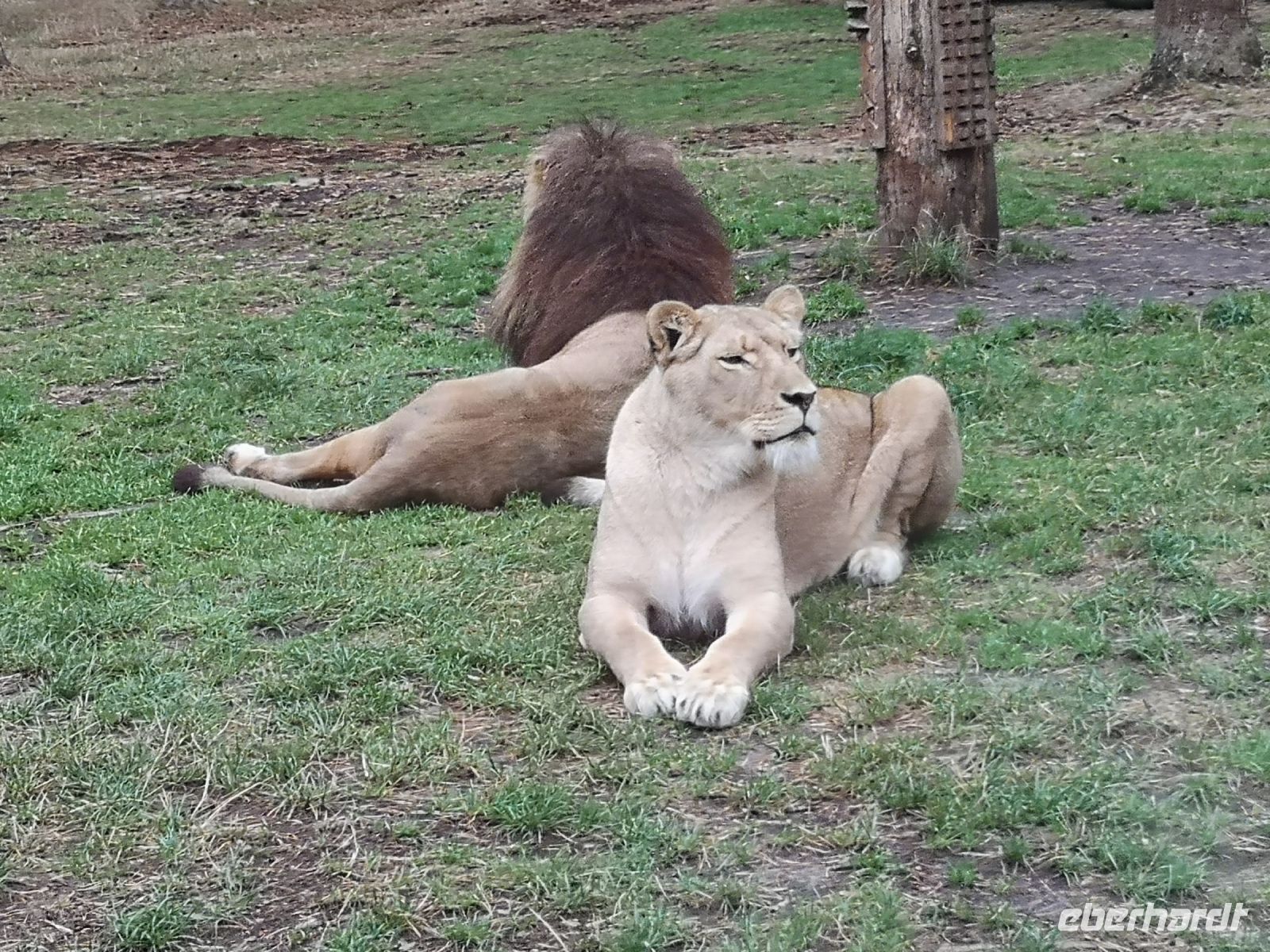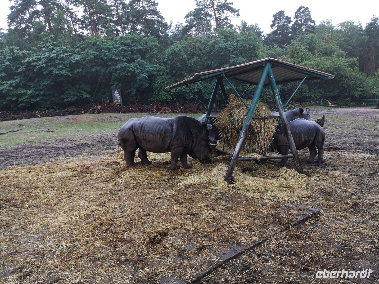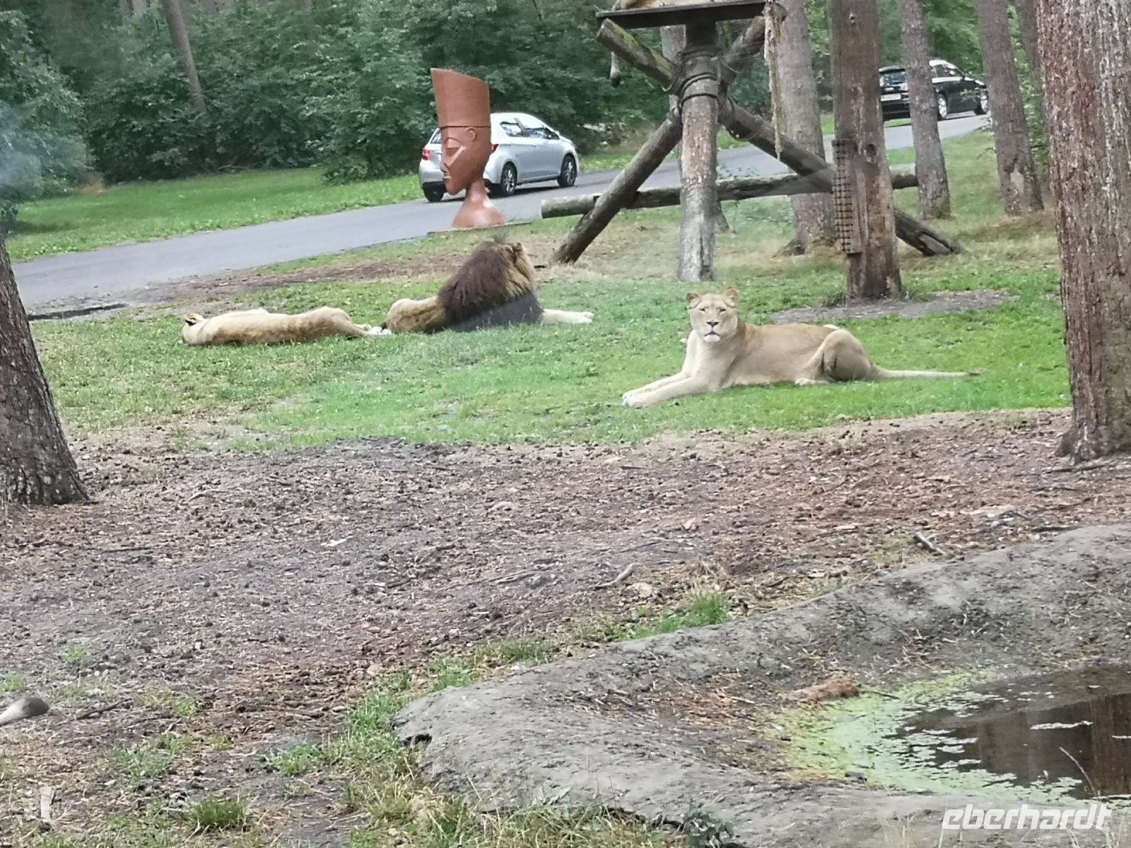 In der Zwischenzeit hat der Regen sich breit gemacht, was aber den nordamerikanischen Bisons, afrikanischen Löwen und auch den weisen Leoparden ziemlich gleichgültig war. Absolut nicht entspannt war eine Herde Affen, die sich alle unter den Überstand ihres Zauns zwängte um ja nicht nass zu werden.