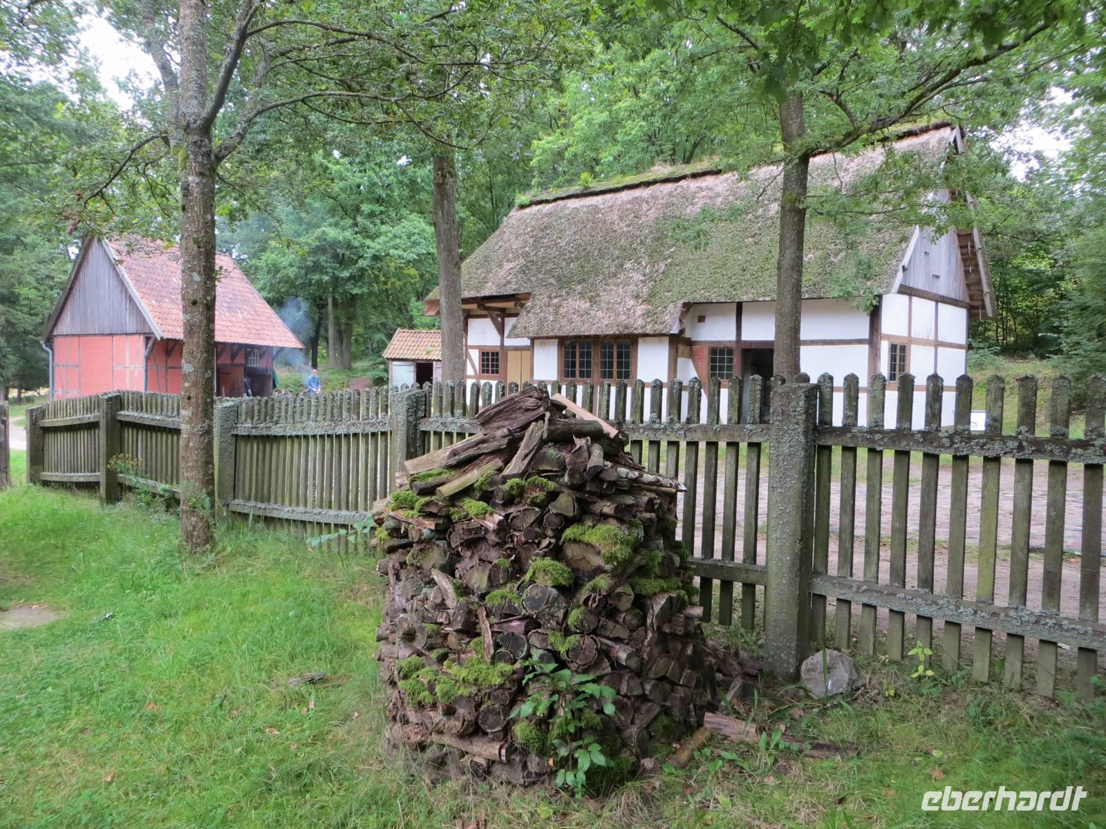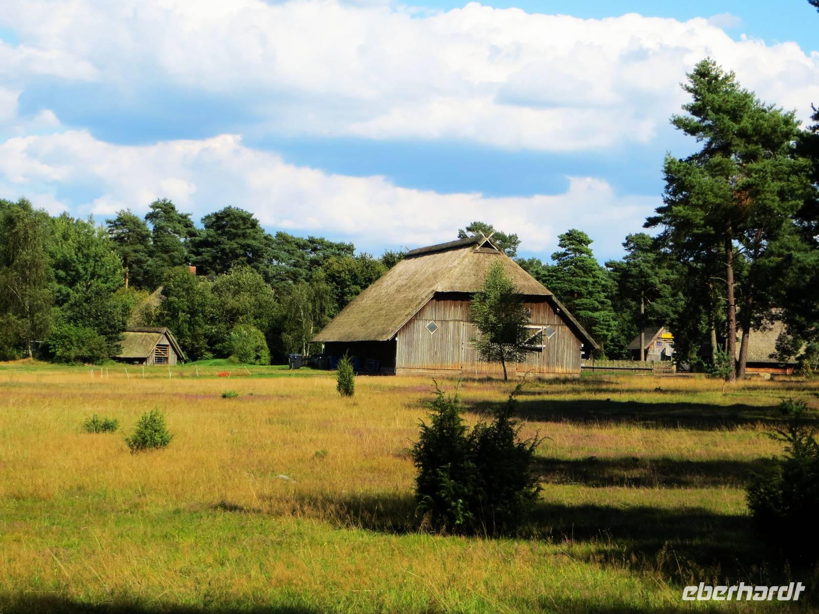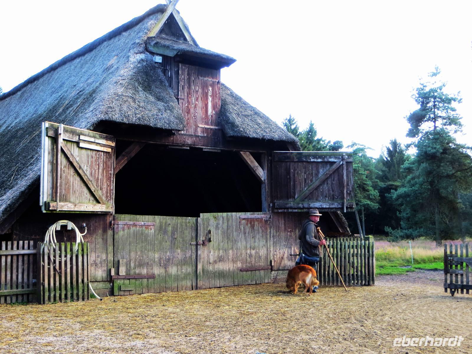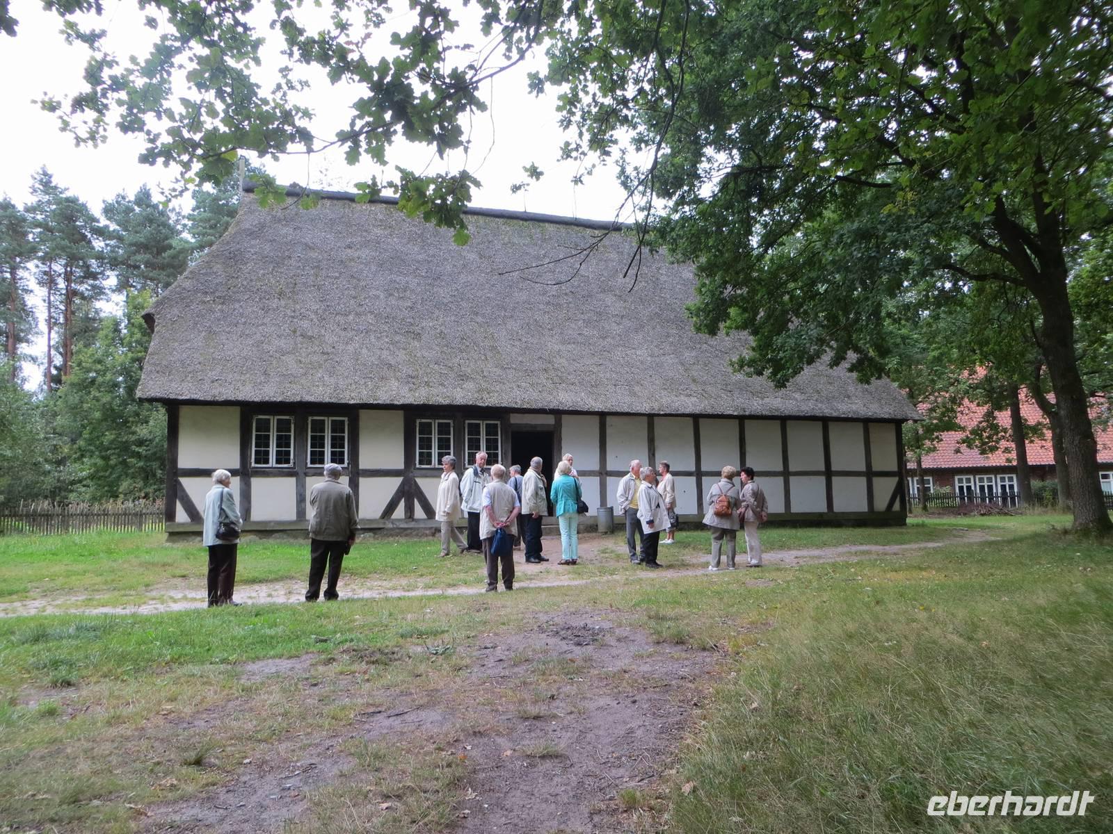Nochmals wollen wir Einblick nehmen in die Geschichte und Kultur der Lüneburger Heide. Nirgendwo besser geht das, als in einem Museumsdorf. Hösseringen bietet zwischen Wäldern und Wiesen im Tal des Heideflüsschen Hardau eine Idylle vergangener Zeiten In ruhiger abgeschiedener Lage, wo heute noch die Straßen enden, liegt das Haufendorf mit Bauerngehöft, Schmiede, Ställen und Bauerngärten. Beim Rundgang durch das Freilichtmuseum unter fachkundiger Führung wird schnell klar, dass das Bauernleben keine Idylle war, sondern harte Arbeit und karges Auskommen. Die Heide zeigt heute ein trübes Gesicht, Nieselregen begleitet unseren Rundgang, gutes Pilzwetter, wir finden gleich drei, lassen sie aber für die nächsten Besucher stehen.