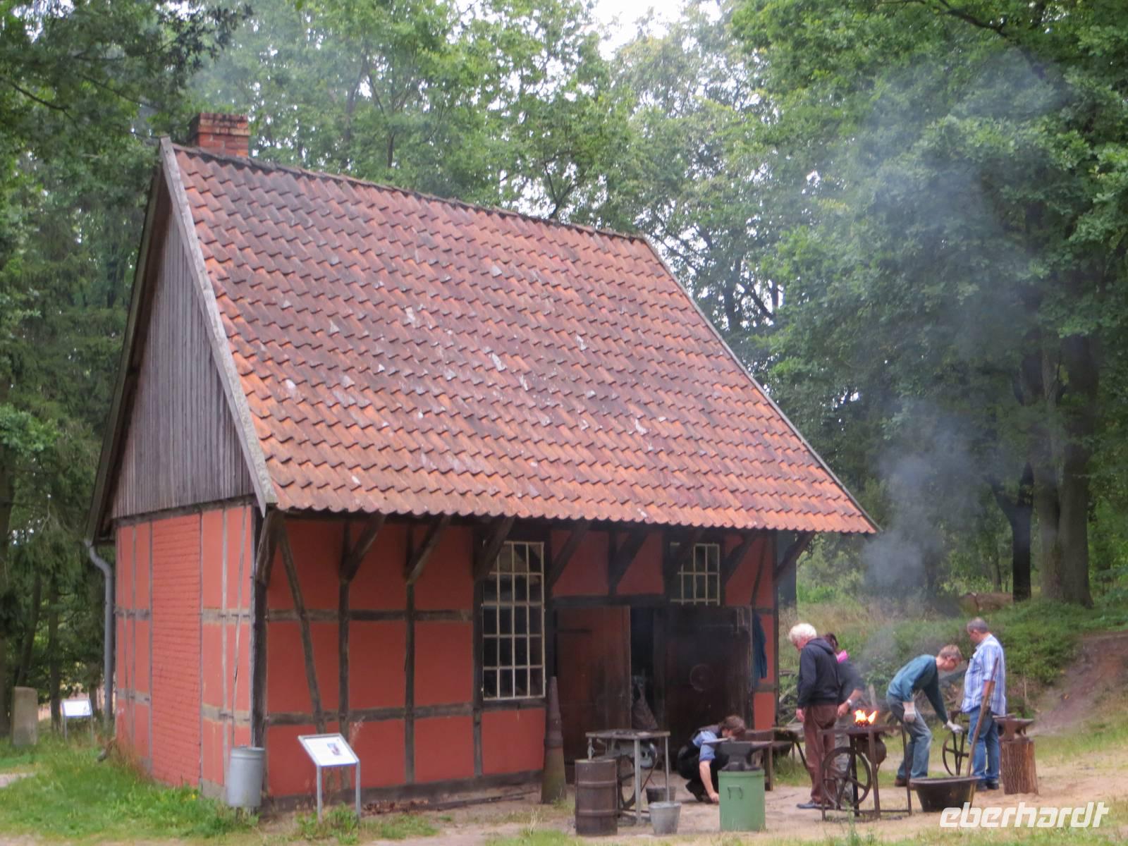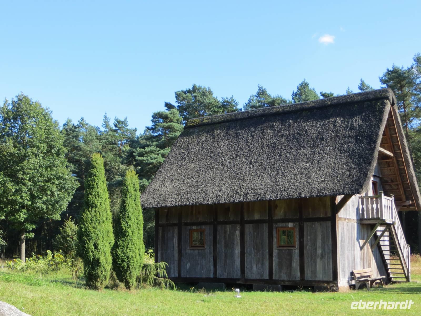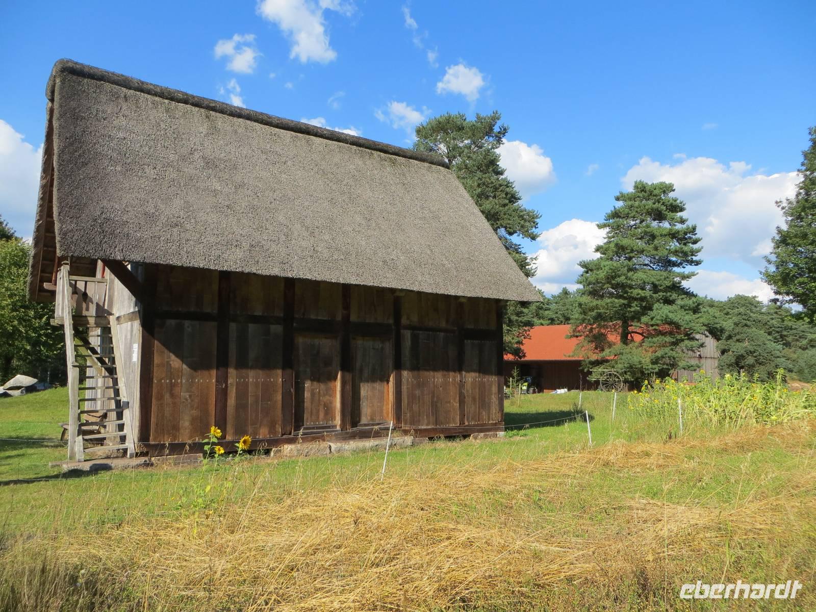 Nochmals wollen wir Einblick nehmen in die Geschichte und Kultur der Lüneburger Heide. Nirgendwo besser geht das, als in einem Museumsdorf. Hösseringen bietet zwischen Wäldern und Wiesen im Tal des Heideflüsschen Hardau eine Idylle vergangener Zeiten In ruhiger abgeschiedener Lage, wo heute noch die Straßen enden, liegt das Haufendorf mit Bauerngehöft, Schmiede, Ställen und Bauerngärten. Beim Rundgang durch das Freilichtmuseum unter fachkundiger Führung wird schnell klar, dass das Bauernleben keine Idylle war, sondern harte Arbeit und karges Auskommen. Die Heide zeigt heute ein trübes Gesicht, Nieselregen begleitet unseren Rundgang, gutes Pilzwetter, wir finden gleich drei, lassen sie aber für die nächsten Besucher stehen.