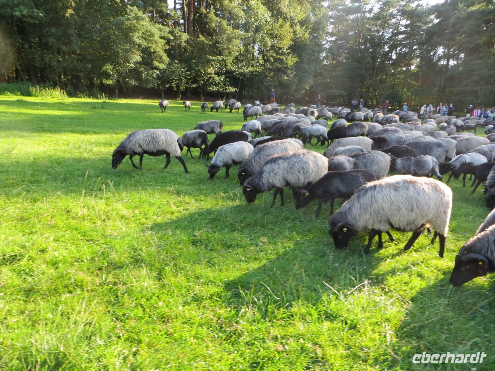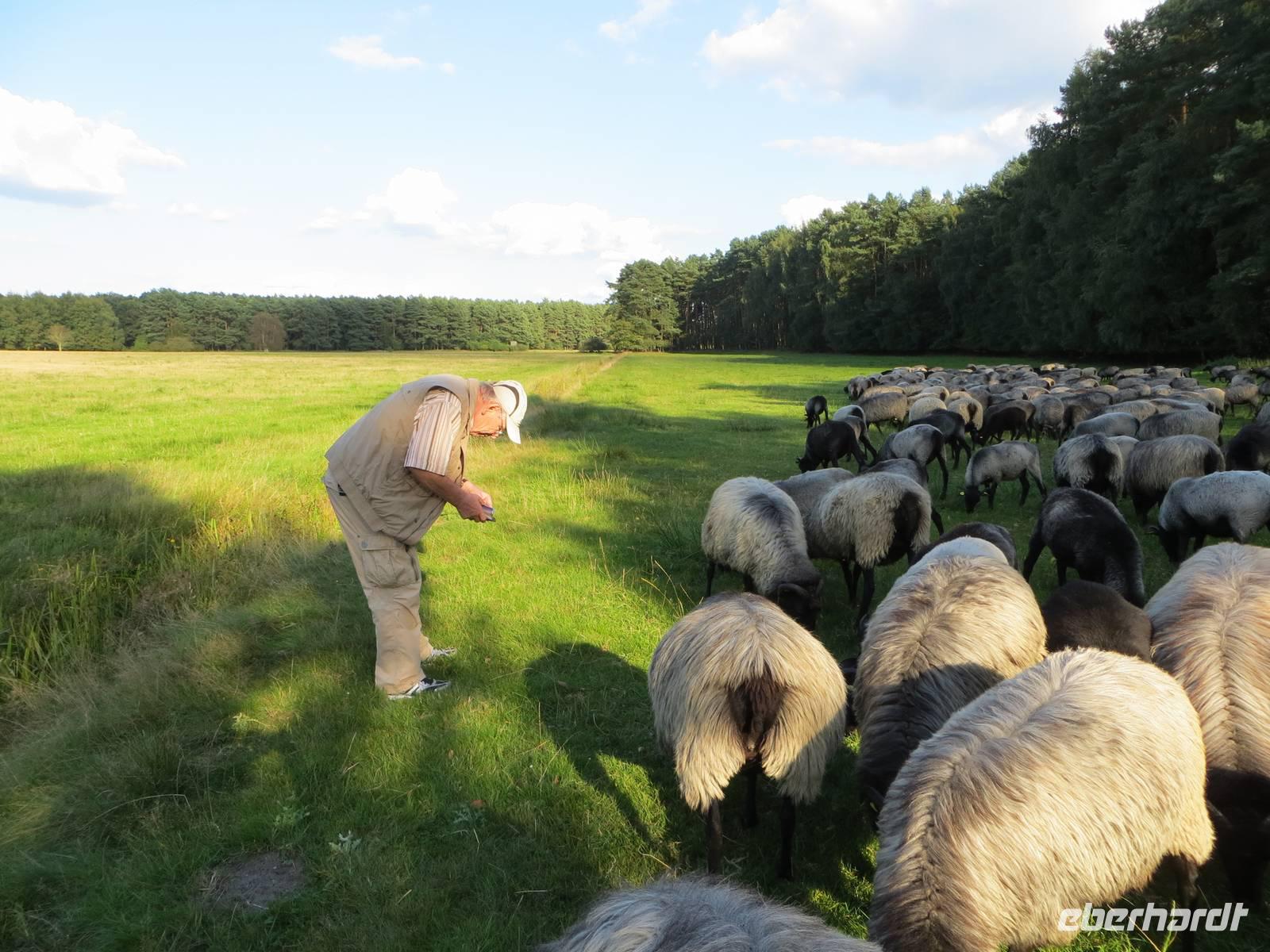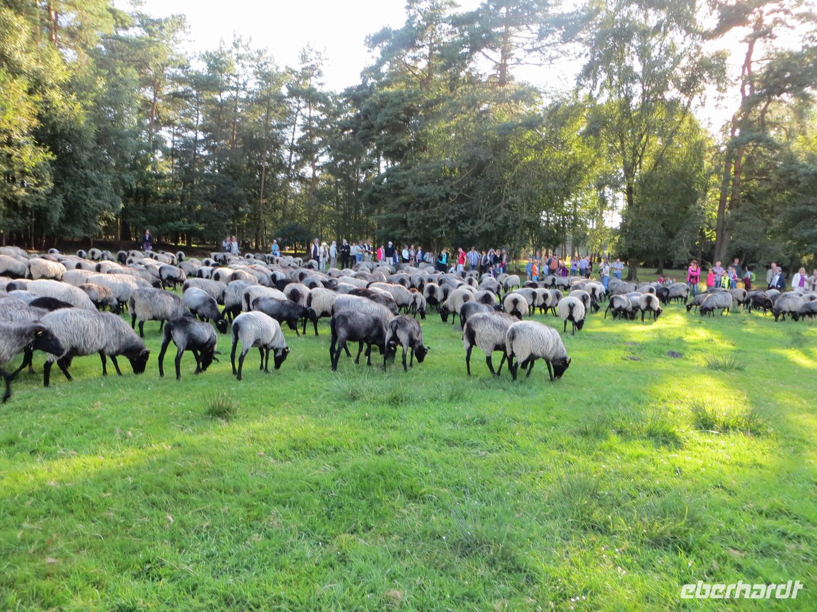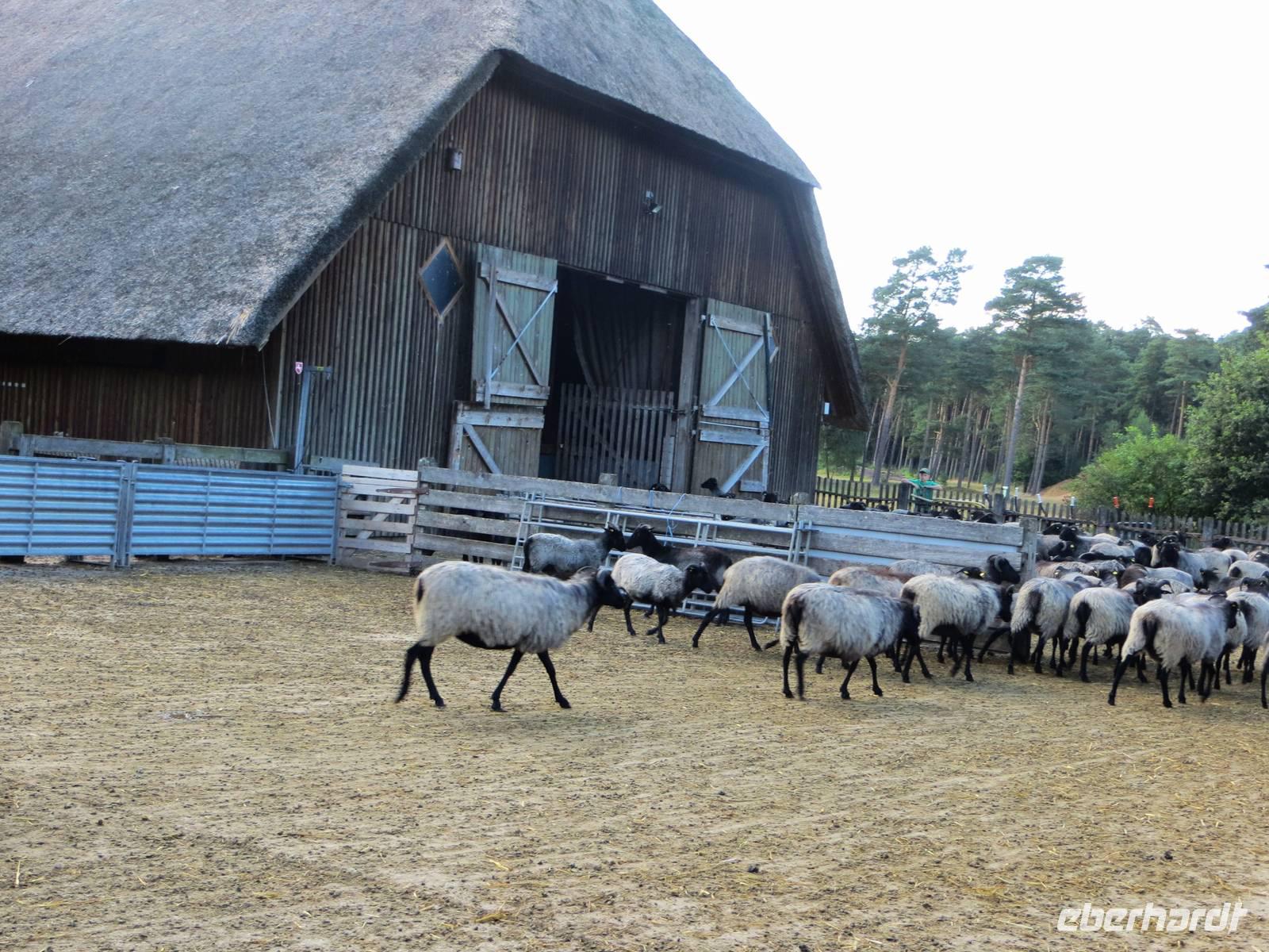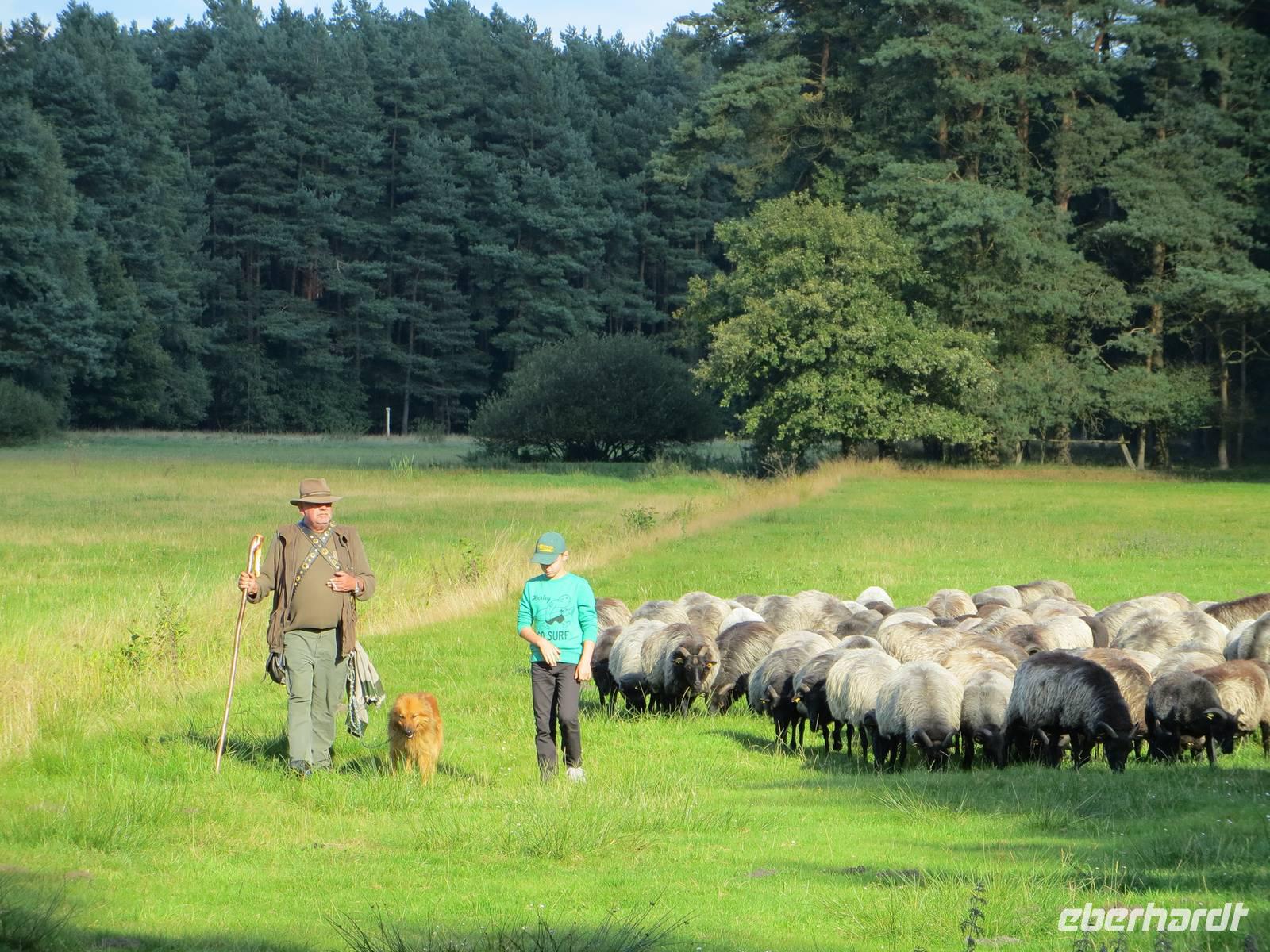 Nach einer kurzen "Siesta" haben wir noch einen Höhepunkt auf dem Programm. Wir wollen den Schäferhof e.V. bei Neuenkirchen besuchen. Der 1976 von Bürgern gegründete Verein Schäferhof bemüht sich um Maßnahmen des Naturschutzes und der Landschaftspflege auf Heide- und Moorflächen sowie der Schaffung von Rückzugsgebieten für bedrohte Tierarten. Zur Zeit werden ca. 400 Morgen Heide und 200 Morgen Grünland bewirtschaftet. Der Schäferhof unterhält eine Gebrauchsherde von etwa 350 Muttertieren mit Lämmern. Hinzu kommen ca. 170 Jährlinge. Unsere Gästeführerin Uschi Timm erzählt ausführlich über das Leben in der Heide damals und heute. Der Schäferhof versetzt uns in eine vergangene Zeit und ist doch gegenwartsbezogen. Wir erfahren viel über ökologische Zusammenhänge, vor allem in der Erlebnis-Sonderaustellung über Ameisen. Ein lebendiger Ameisenhaufen zum Reinschauen ist Mittelpunkt der Ausstellung. Uschi Timm ist es eine Herzensangelegenheit, ihre Gäste in die Welt der Ameisen mitzunehmen und Vorurteile abzubauen und so zum Schutz der Winzlinge beizutragen. Eine Eselfamilie ist sehr zutraulich. Aber endlich ist es so weit! Die Heidschnuckenherde kehrt zum Stall zurück. Wir begegnen ihr auf einer Lichtung im Wald und begleiten sie ein Stück. Schnell vergeht die Zeit mit dem Schäfer, seinen zwei Hütehunden und den Schnucken. Schließlich sind alle Schafe im Stall, es gibt noch Spezialitäten zu kaufen oder eine Heidschnucken-Grillwurst zu kosten, aber nun heißt es Abschiednehmen, es ist schon spät. Zurück im Hotel Allerhof freuen sich alle auf das gute Abendbuffet, wir werden bereits erwartet, es ist bereits halb acht. Ein ereignisreicher Urlaubstag neigt sich dem Ende zu.