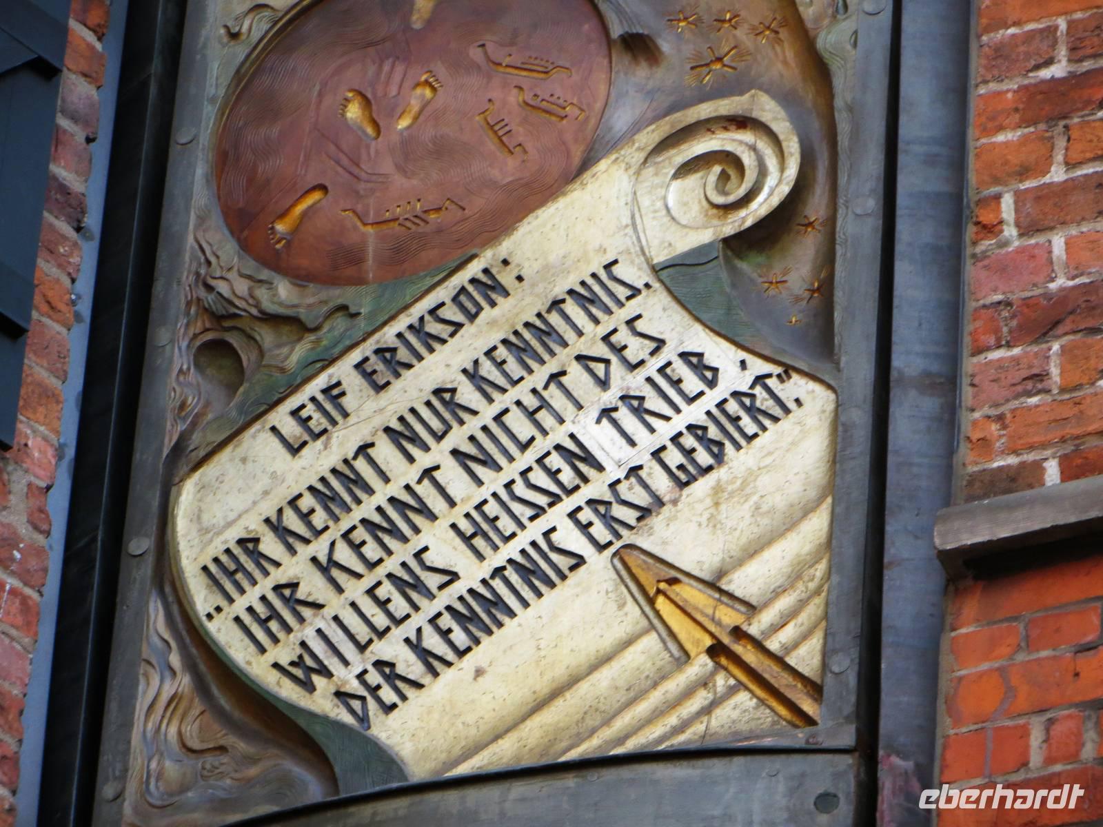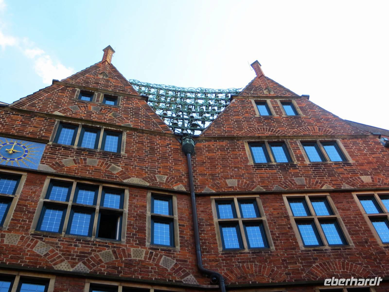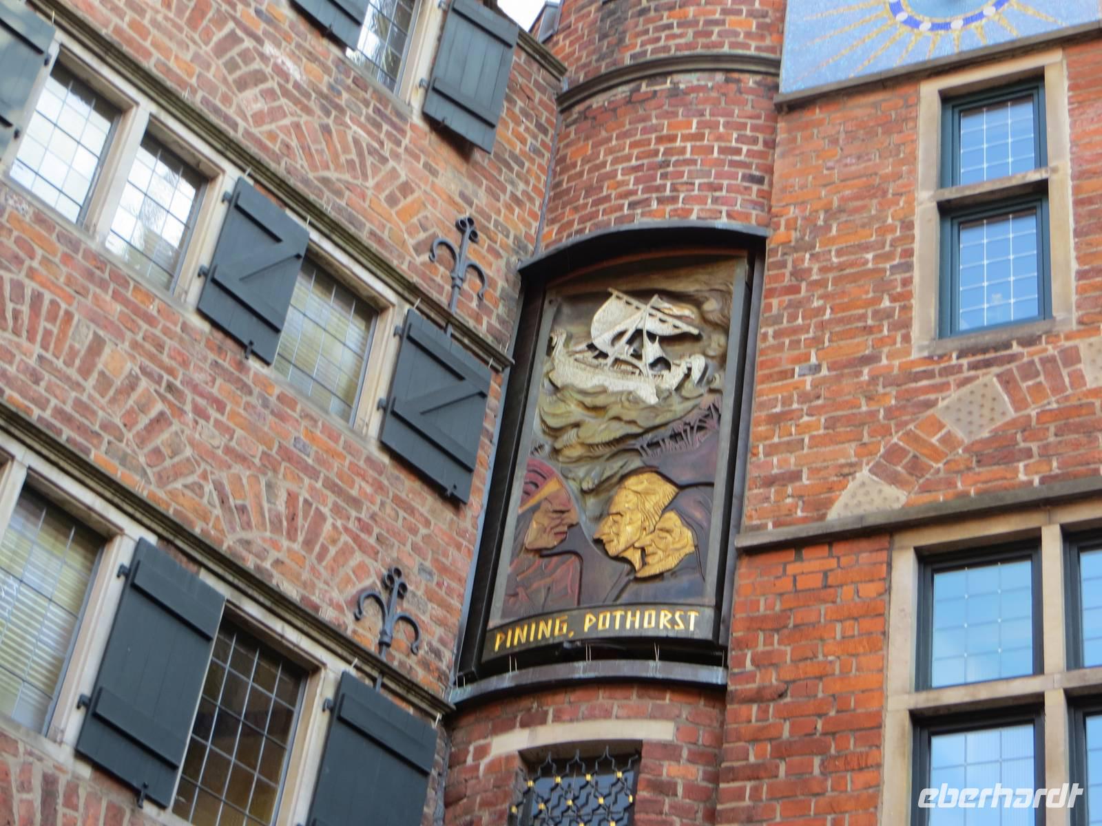 Wir fanden uns wieder pünktlich 15.00 Uhr zum Glockenspiel auf der Böttcherstraße ein. Sieben Minuten lang erklingen Melodien auf 30 Meißner Porzellanglocken, dazu drehen sich zeitgleich 10 Bildtafeln, die den Entdeckern und Abenteurern gewidmet sind, die den Ozean überquerten, sei es mit dem Schiff oder auch zu Luft.