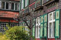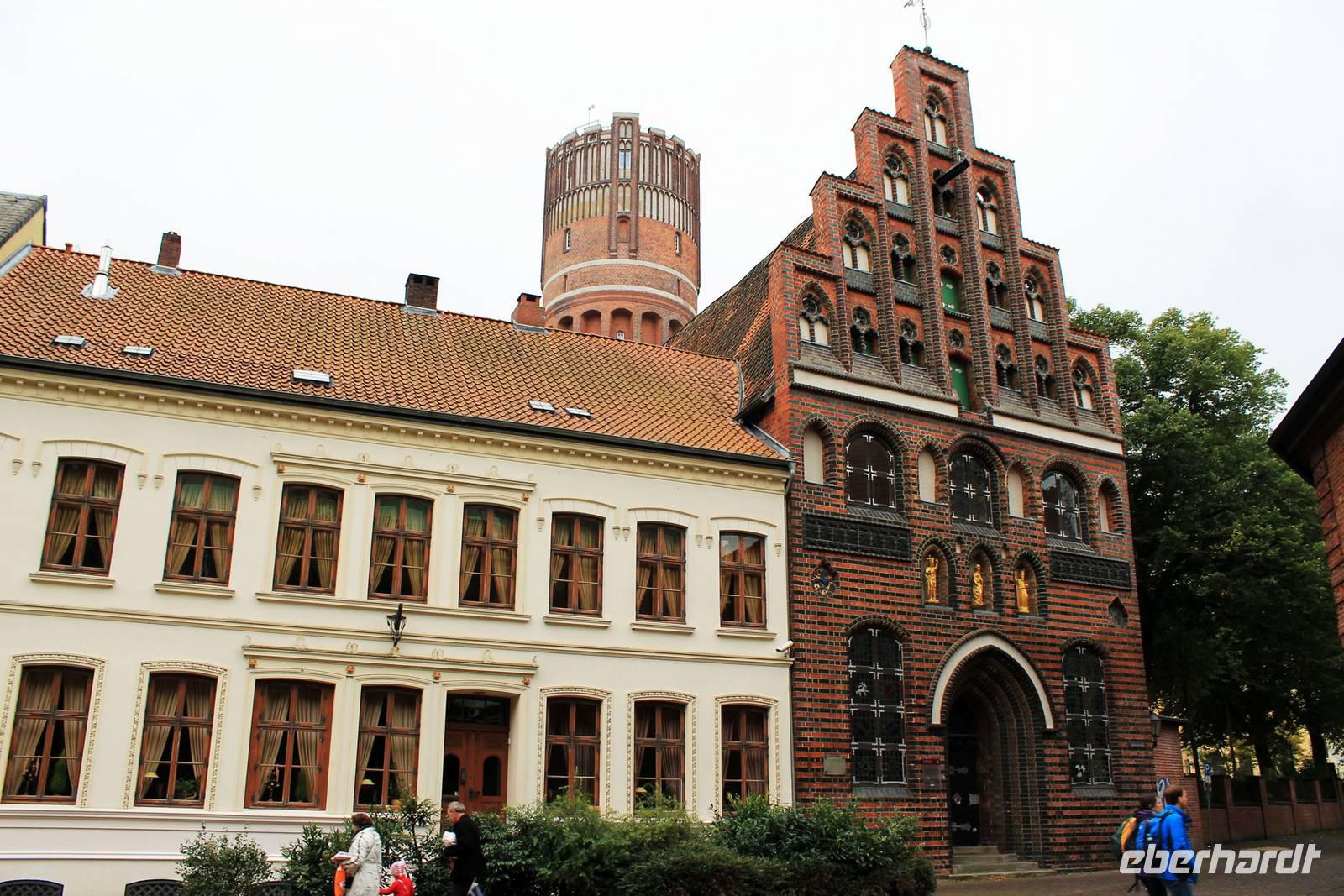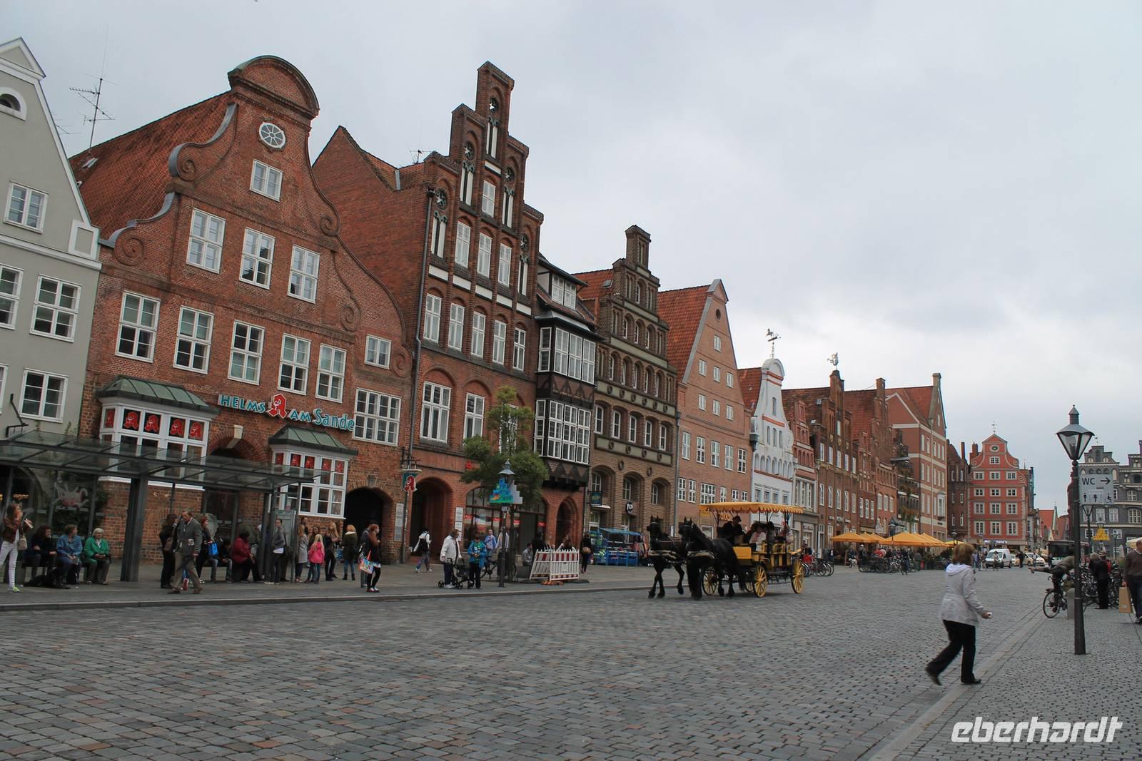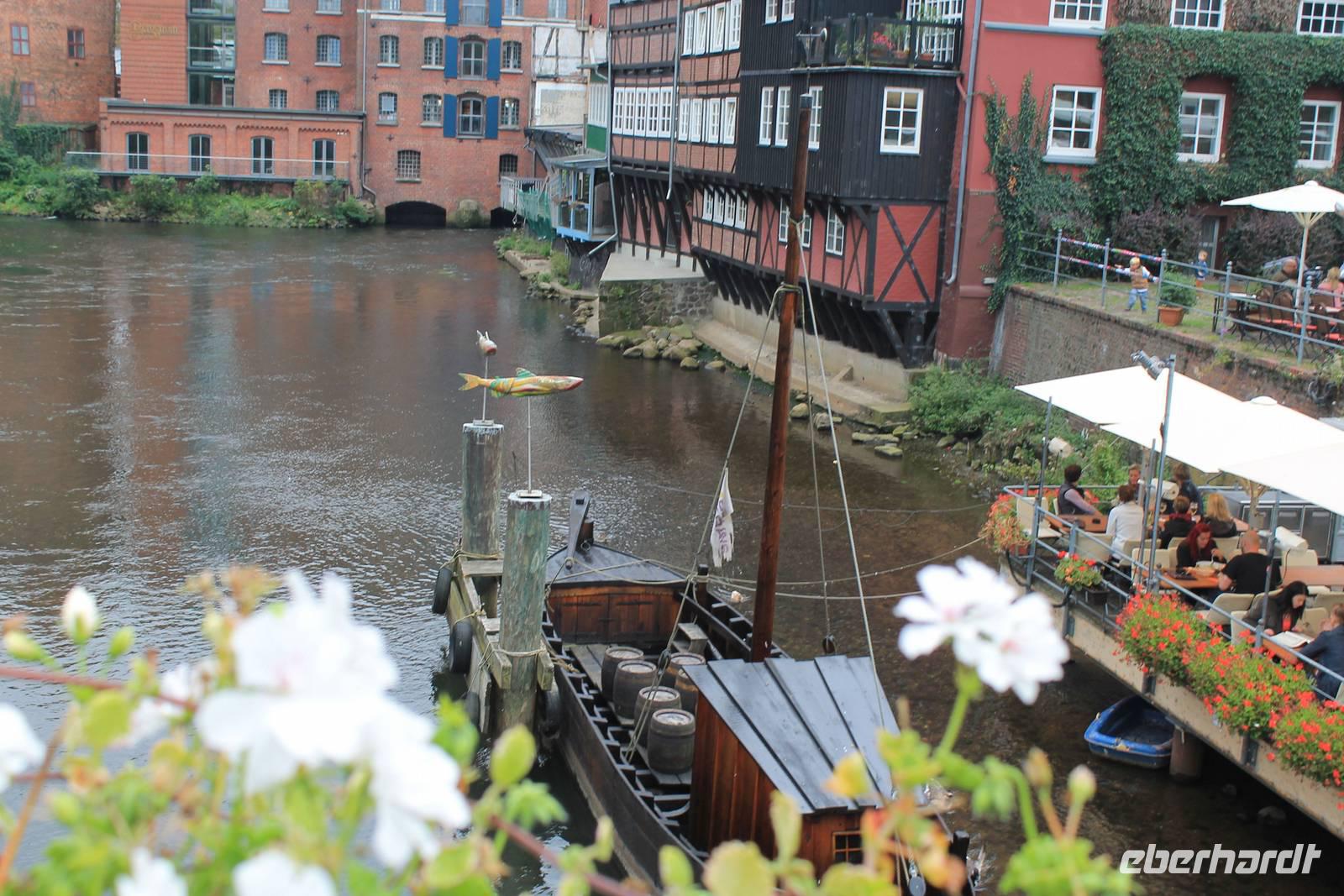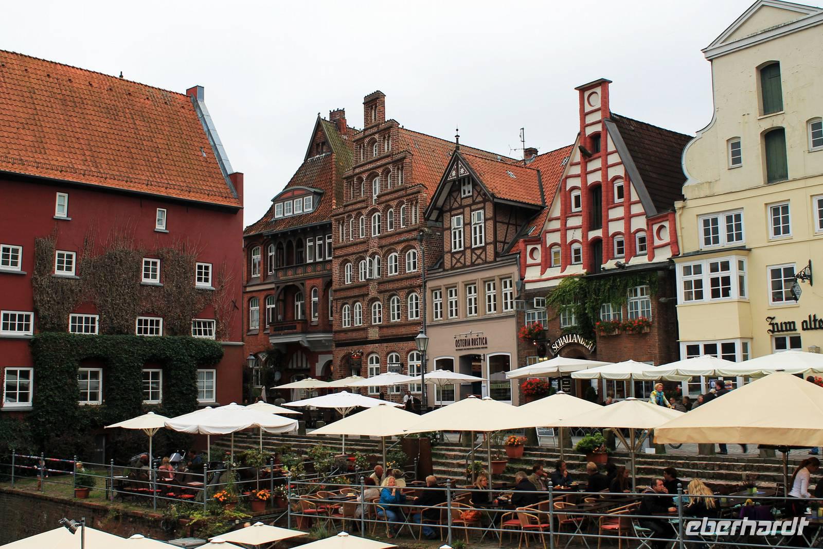 Nochmals wollen wir Einblick nehmen in die Geschichte und Kultur der Lüneburger Heide. Nirgendwo besser geht das, als in einem Museumsdorf. Hösseringen bietet zwischen Wäldern und Wiesen im Tal des Heideflüsschen Hardau eine Idylle vergangener Zeiten In ruhiger abgeschiedener Lage, wo heute noch die Straßen enden, liegt das Haufendorf mit Bauerngehöft, Schmiede, Ställen und Bauerngärten. Beim Rundgang durch das Freilichtmuseum unter fachkundiger Führung wird schnell klar, dass das Bauernleben keine Idylle war, sondern harte Arbeit und karges Auskommen. Die Heide zeigt heute ein trübes Gesicht, Nieselregen begleitet unseren Rundgang,Weiter geht es nach Lüneburg, der alten Salzstadt mit seiner backsteingotischen Häusern und Treppengiebeln, dem 800 jährigen alten Rathaus und dem Hafenviertel an der Ilmenau. Im Bereich des alten Hafens steht noch die Barockfassade des Alten Kaufhauses, und der Alte Kran, eine bis heute funktionsfähige mittelalterliche Holzkonstruktion, in deren Inneren zwei große Laufräder das Heben und Senken des Kranseils ermöglichen. Besonders hervorzuhebende Gebäude sind die drei verbliebenen Stadtkirchen St. Johannis am Sande, die Kirche St. Michaelis, in der Johann Sebastian Bach von 1700 bis 1702 Chorknabe war, und die fast modern wirkende Stadtkirche St. Nicolai, die ab 1407 erbaut wurde. In St. Nicolai findet gerade eine Hochzeit statt. Überhaupt wird in Lüneburg viel geheiratet. Vor dem Standesamt sind immer Heiratswillige. Liegt das an der romantischen Fernsehserie „Rote Rosen", wo Lüneburg als Kulisse für die Herz-Schmerz-Geschichten immer in romantisches Licht gesetzt wird? Auf alle Fälle bietet die Stadt viele schöne Fotomotive Wir merken, die Zeit vergeht viel zu schnell, es gibt einfach viel zu sehen und zu entdecken. Liebhaber der Fernsehserie "Rote Rosen" haben manches Gebäude erkannt, das im Film als Drehkulisse diente. Manch einer wäre gerne länger geblieben...