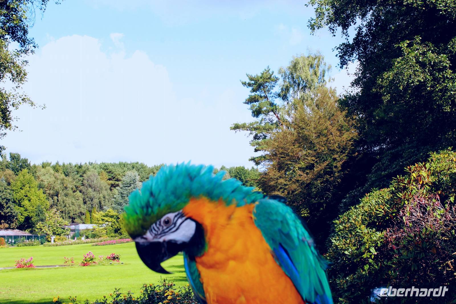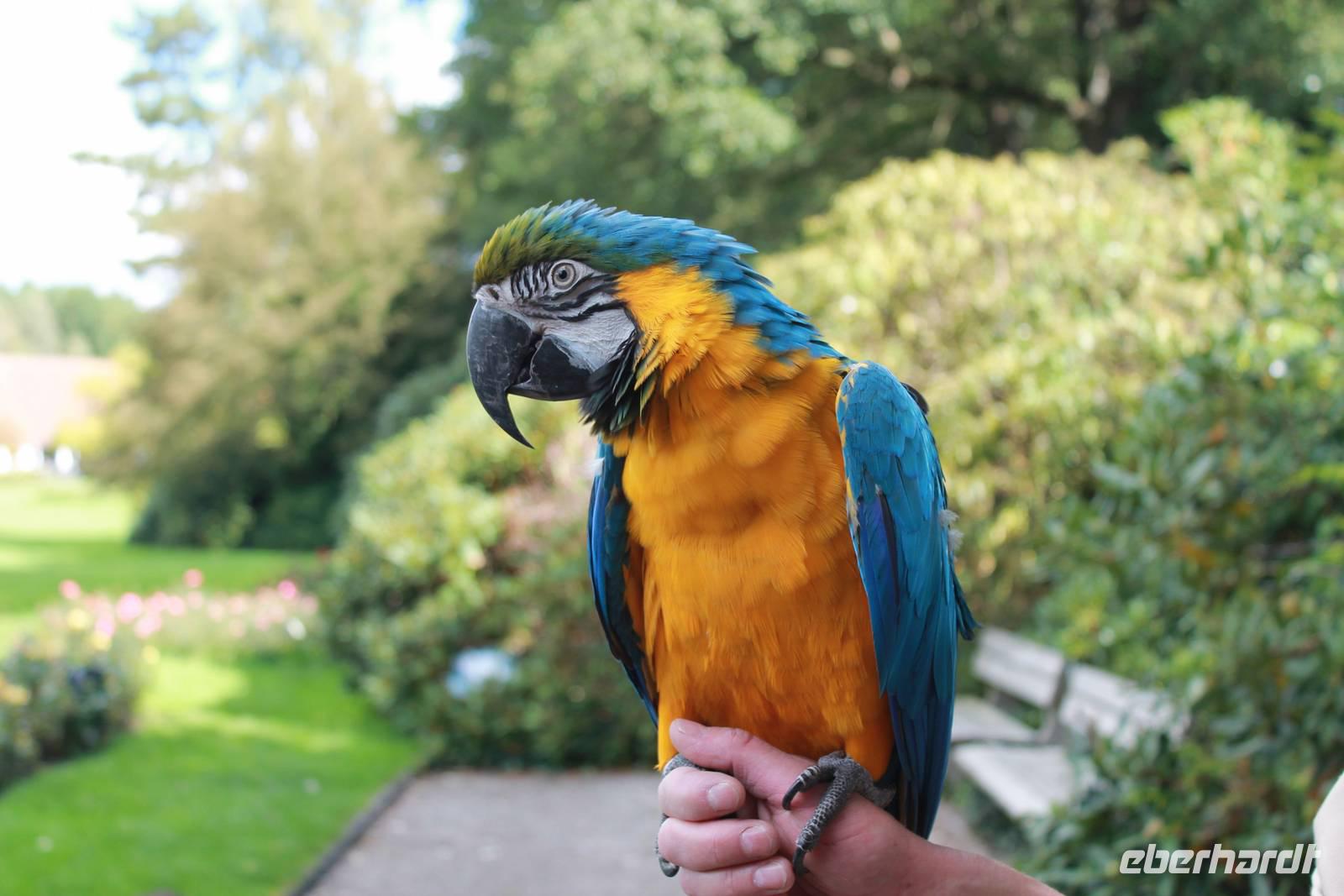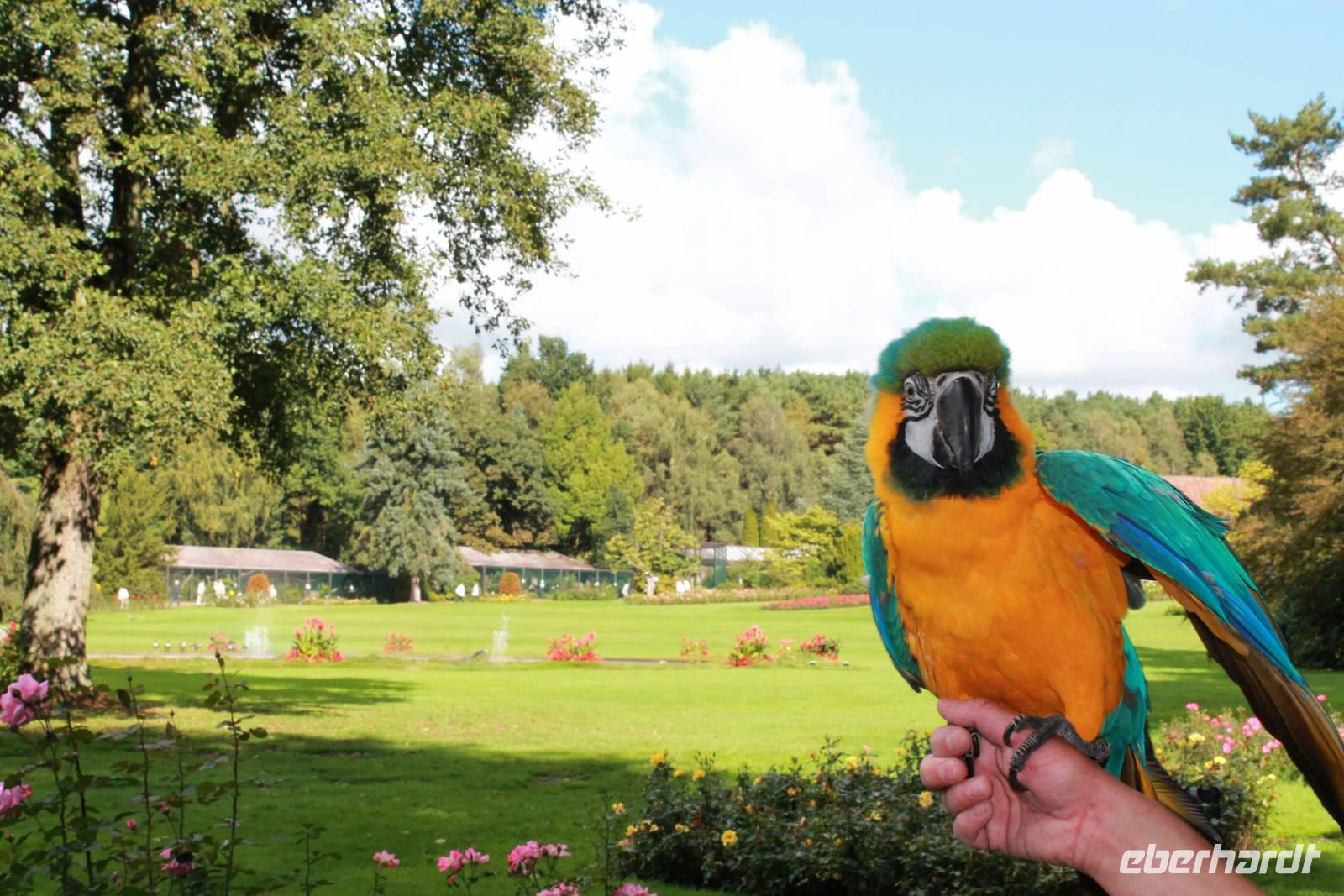 Die Farbenpracht und Artenvielfalt der Vögel ist kaum in Worte zu fassen - das muss man einfach erlebt haben. Bei über 4000 Vögeln aus 675 Arten fällt es schwer, eine Auswahl zu treffen, denn jeder Vogel ist auf seine Weise einzigartig und sehenswert! Zuerst gehen wir zu den Pinguinen, einige sind so handzahm, dass sie sich von uns über den Rücken kraulen lassen. Aber alles freiwillig! Wenn sie genug haben, dann springen sie einfach ins Schwimmbecken und tauchen ab. Nur Hunger haben sie keinen großen, sie sind auch Feinschmecker. Der heutige Fisch ist nicht nach ihrem Geschmack. Dann eben nicht, gehen wir halt weiter mit der Tierpflegerin zu den hungrigen Pelikanen, die fangen den Fisch geschickt in ihren großen Schnabel. Keiner will die unterhaltsame und informationsreiche Vogelshow versäumen, alle finden sich rechtzeitig auf der Flugschau-Wiese ein. Auch wilde Kanadagänse und ein Storch auf der Durchreise mischen sich unter die gefiederten Stars. Und haben keine Angst vor dem tieffliegenden Condor! Dabei ziehen sogar wir manchmal unwillkürlich den Kopf ein! Der Sekretär "Socke" fängt Schlangen und ärgert die Tiertrainer und am Schluss fliegen über 70 Vögel über unsere Köpfe. Wir haben viel Spaß an der 30-ig minütigen Vorstellung und sind uns einig: wunderschön! Der Park mit seinen Rosenbeeten und Wasserspielen bildet die perfekte Kulisse für die Show. Besonders erfreuen die gelben kleinen Goldsittiche und der blaue Hyazinth-Ara.