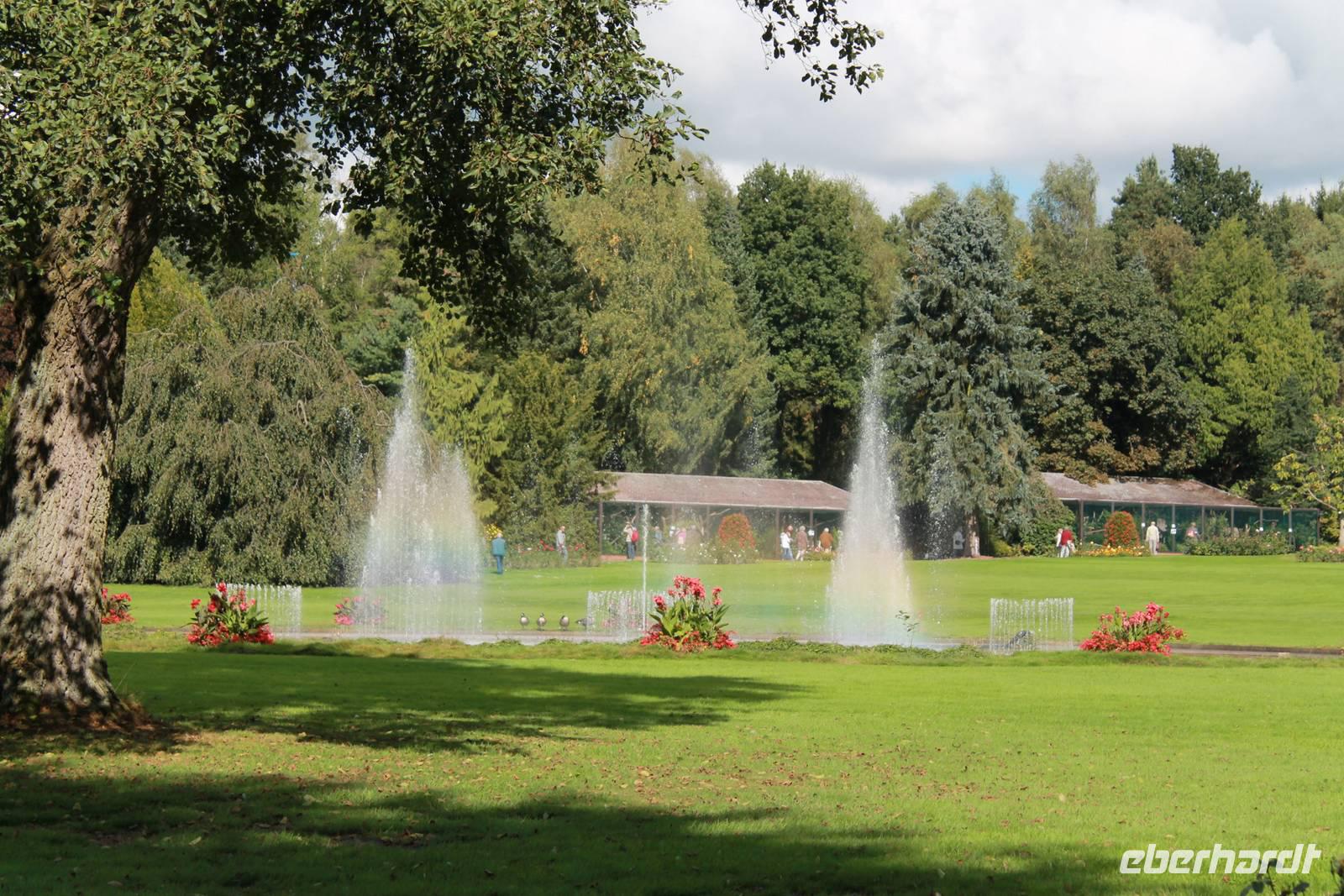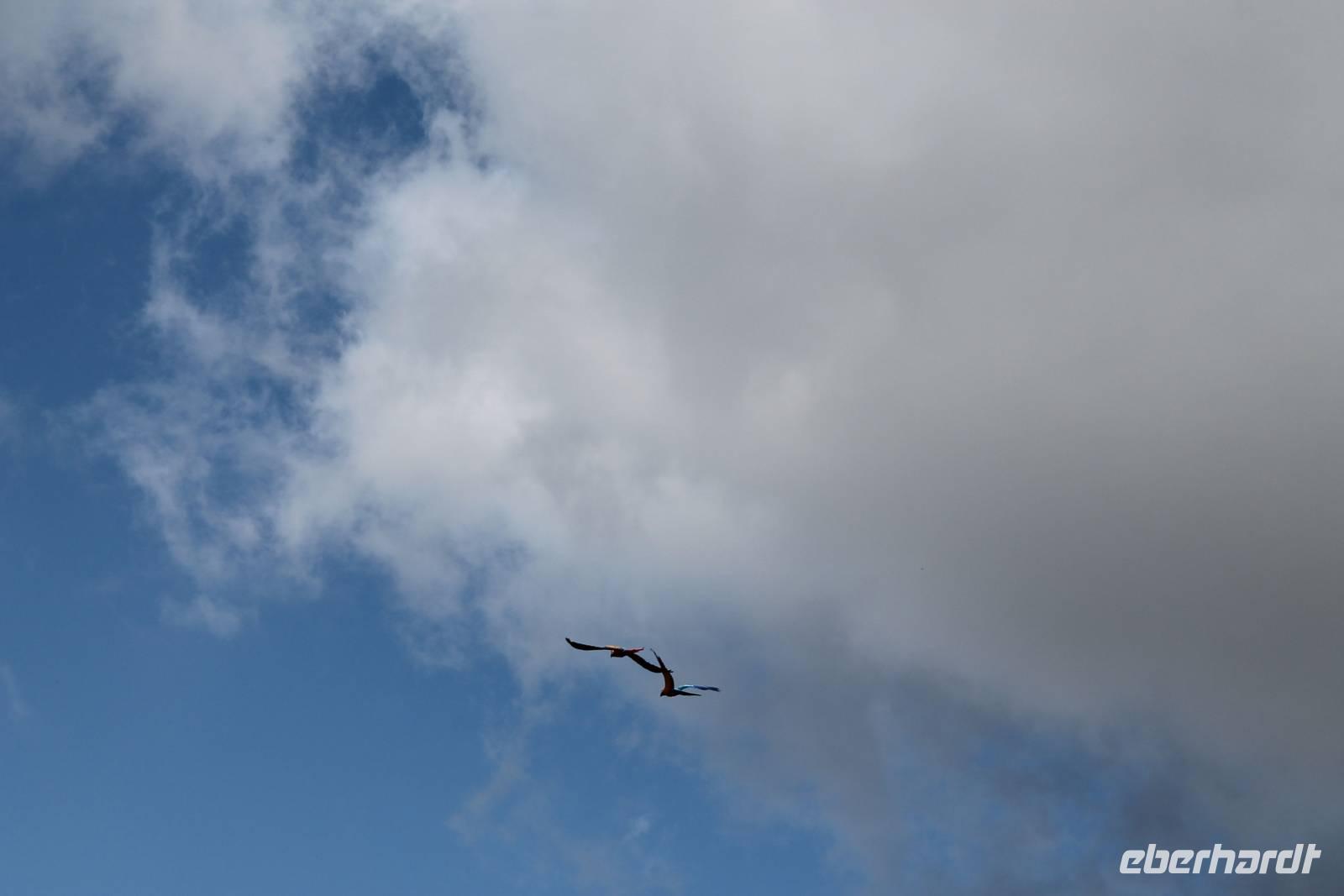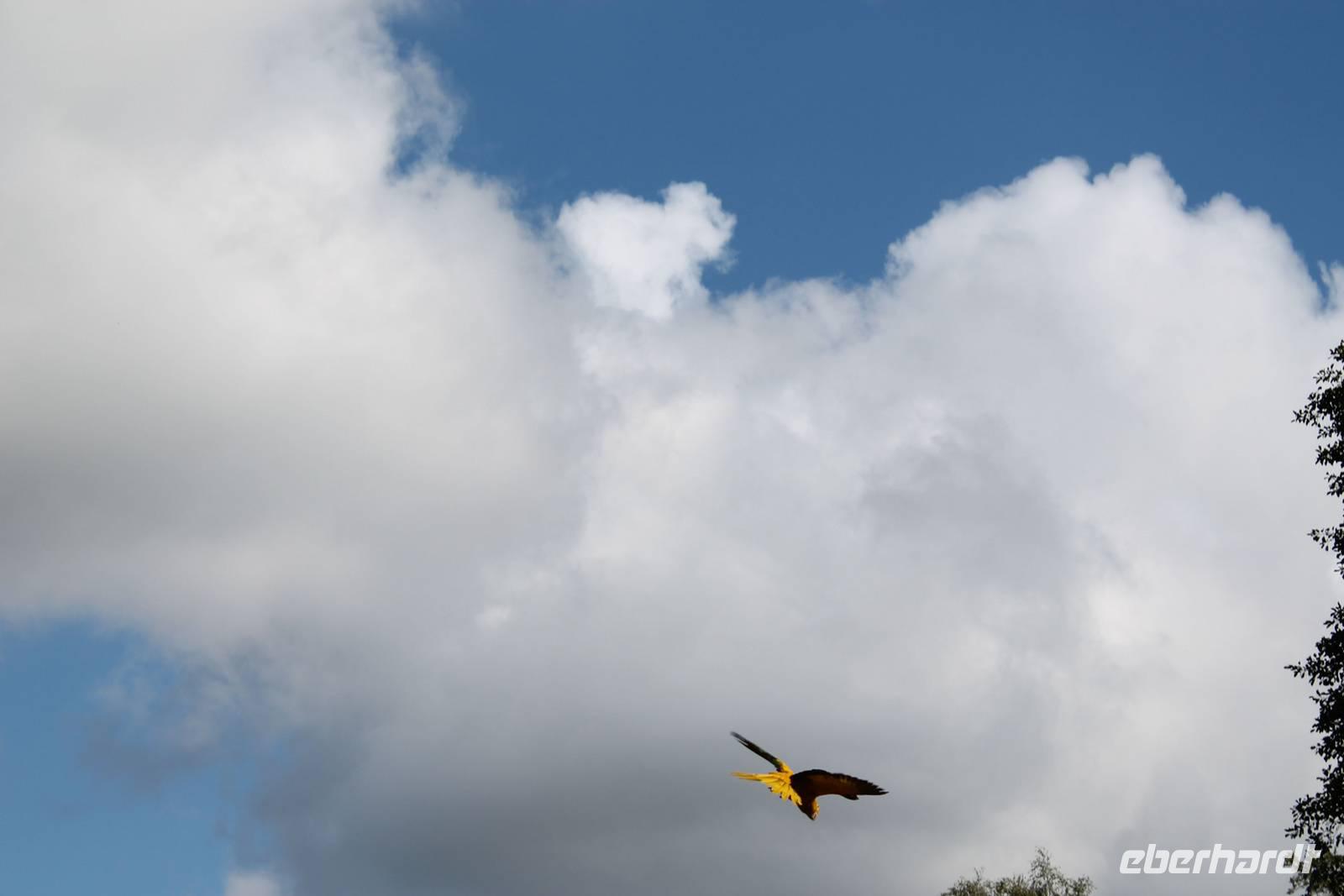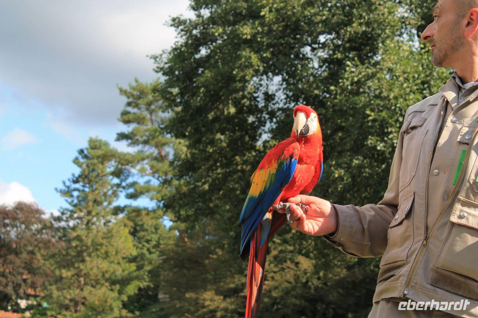 Die Farbenpracht und Artenvielfalt der Vögel ist kaum in Worte zu fassen - das muss man einfach erlebt haben. Bei über 4000 Vögeln aus 675 Arten fällt es schwer, eine Auswahl zu treffen, denn jeder Vogel ist auf seine Weise einzigartig und sehenswert! Zuerst gehen wir zu den Pinguinen, einige sind so handzahm, dass sie sich von uns über den Rücken kraulen lassen. Aber alles freiwillig! Wenn sie genug haben, dann springen sie einfach ins Schwimmbecken und tauchen ab. Nur Hunger haben sie keinen großen, sie sind auch Feinschmecker. Der heutige Fisch ist nicht nach ihrem Geschmack. Dann eben nicht, gehen wir halt weiter mit der Tierpflegerin zu den hungrigen Pelikanen, die fangen den Fisch geschickt in ihren großen Schnabel. Keiner will die unterhaltsame und informationsreiche Vogelshow versäumen, alle finden sich rechtzeitig auf der Flugschau-Wiese ein. Auch wilde Kanadagänse und ein Storch auf der Durchreise mischen sich unter die gefiederten Stars. Und haben keine Angst vor dem tieffliegenden Condor! Dabei ziehen sogar wir manchmal unwillkürlich den Kopf ein! Der Sekretär "Socke" fängt Schlangen und ärgert die Tiertrainer und am Schluss fliegen über 70 Vögel über unsere Köpfe. Wir haben viel Spaß an der 30-ig minütigen Vorstellung und sind uns einig: wunderschön! Der Park mit seinen Rosenbeeten und Wasserspielen bildet die perfekte Kulisse für die Show. Besonders erfreuen die gelben kleinen Goldsittiche und der blaue Hyazinth-Ara.