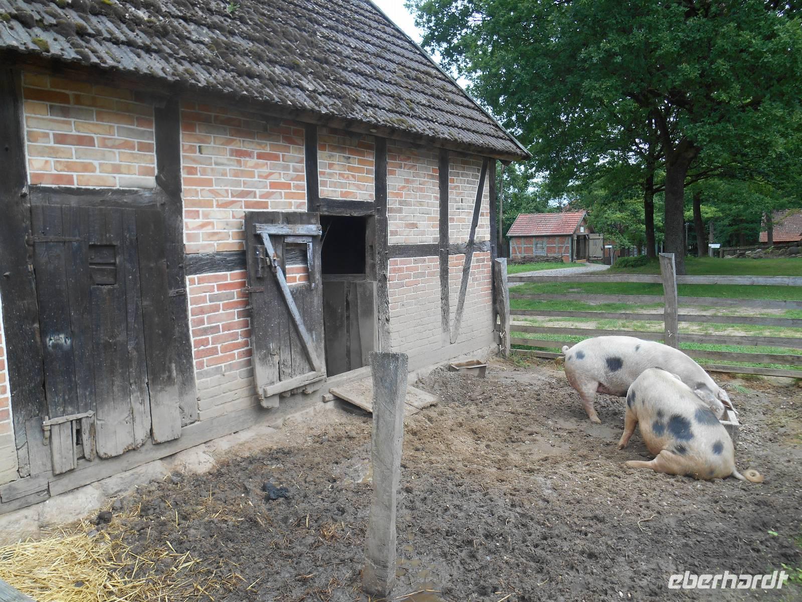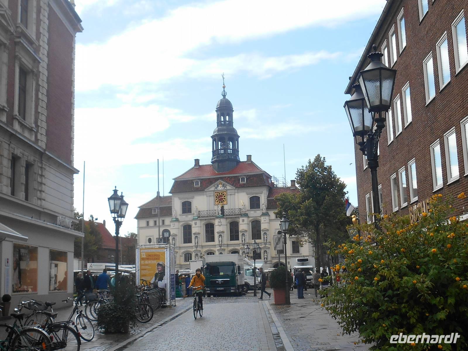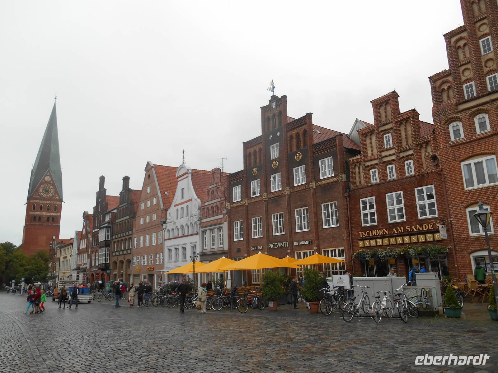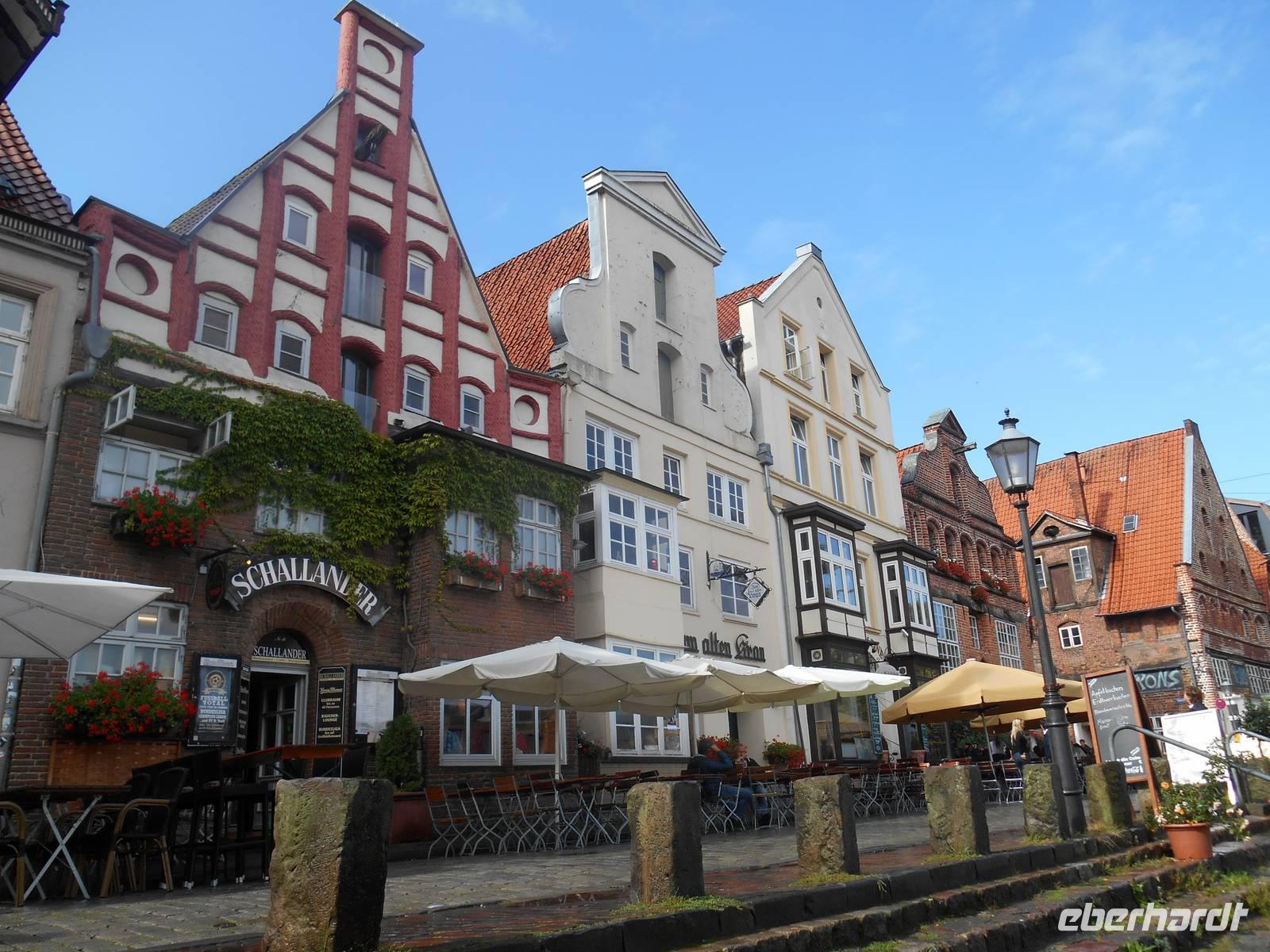 Das Freilichtmuseum Hösseringen war das erste Ziel des heutigen Tages. Wir betraten das 1975 eröffnete Museumsdorf durch eine moderne Eingangshalle mit einem großzügigen Museumsshop. Es ist das größte Freilichtmuseum der Heide und hier wurden wir zu einer interessanten Führung erwartet, wo wir uns immerhin einen Eindruck darüber verschaffen konnten, wie die Heidjer früher lebten. Die hierher versetzten historischen Hof- und Wirtschaftsgebäude stehen in hügeliger Landschaft mit Wald- und Heidefläche und werden von Schafen und Schweinen belebt. Auch ein Schmied zeigt seine Handwerkskünste! Gegen Mittag mussten wir dann leider schon wieder weiter - der Besuch von Lüneburg stand an! Die Stadt, die der Heide ihren Namen gab, ist eine der schönsten des Nordens, denn die Lüneburger Innenstadt ist mit ihren historischen Gebäuden und mittelalterlichem Charme überregional attraktiv! Salz machte Lüneburg im Mittelalter zu einer reichen Stadt. Dazu gibt es auch eine Sage: Vor mehr als tausend Jahren, als noch unermessliche Wälder das Lüneburger Land bedeckten, trug es sich zu, dass mehrere Jäger der Spur eines Wildschweins folgten, die durch Sümpfe und Brüche an der Ilmenau entlang führte. Es währte nicht lange, da lenkte die Spur seitwärts in eine hügelige und trockene Gegend. Wie staunten die Jäger, als sie bald an einem sonnigen Hang eine mächtige Salzsau schlafend fanden, wie sie bisher noch keine gesehen hatten; denn sie war nicht schwarz, sondern hatte schneeweiße Borsten! Sie erlegten das seltsame Tier und forschten mit Eifer nach der Ursache solcher Färbung. Als sie mit der Hand durch die Borsten strichen, merkten sie, dass Salzkörnchen an ihnen klebten - so dicht, als wäre das Tier mit weißen Borsten bedeckt. Sie folgten der Fährte des Tieres zurück und fanden einen Tümpel, in dem das Schwein gesuhlt hatte. Das Wasser des Sumpfes war von salzigem Geschmack und man wusste jetzt, wie die Sau zu den weißen Borsten gekommen war. So zeigte eine wilde Sau den Lüneburgern eine Quelle unerschöpflichen Reichtums. Die Salzsau wurde weit und breit bekannt, und die Bürger der Stadt ehrten sie, indem sie zum Andenken einen Schinkenknochen des Tieres in einen Glaskasten im Rathaus verwahrten.