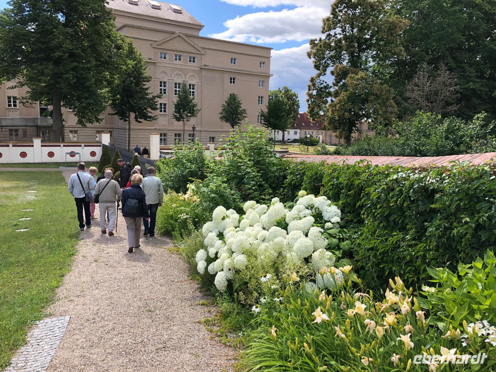 Im Anschluss zur Rundfahrt erkundeten wir die Altstadt noch etwas zu Fuss, bis wir uns zu unserer Führung durch die Schlossgartenanlage trafen. Wegen der Corona-Massnahmen mussten wir leider auf eine Führung durch das Schloss verzichten, jedoch entschädigte uns dafür wenigstens etwas eine der schönsten Barockanlagen Norddeutschlands, die einmal als Lustgarten nach französischem Vorbild angelegt worden war, aber vor allem vom Gartenarchitekten Jean Legeay seine Prägung erhielt. Jedoch ein uns bekannter Name, wenn es um Gärten und Parks geht, tauchte hier wieder auf: Peter Joseph Lenné. Die Erweiterung dieses Schlossgartens um die Mitte des 19. Jahrhunderts geht auf ihn zurück. Wir suchten seine berühmten Sichtachsen, wandelten durch Laubengänge an Blumenrabatten und Skulpturen vorbei und bedauern es von Neuem, dass die Zeit zu schnell verfliegt als das wir alles was die Stadt zu bieten hat, ansehen könnten.Gerade rechtzeitig zum Abendessen treffen wir im Hotel ein, wo uns diesmal nicht nur ein schmackhaftes Buffet, sondern auch noch ein Alleinunterhalter mit schwungvoller Musik erwartet, die dazu einlädt, mal wieder das Tanzbein zu schwingen.