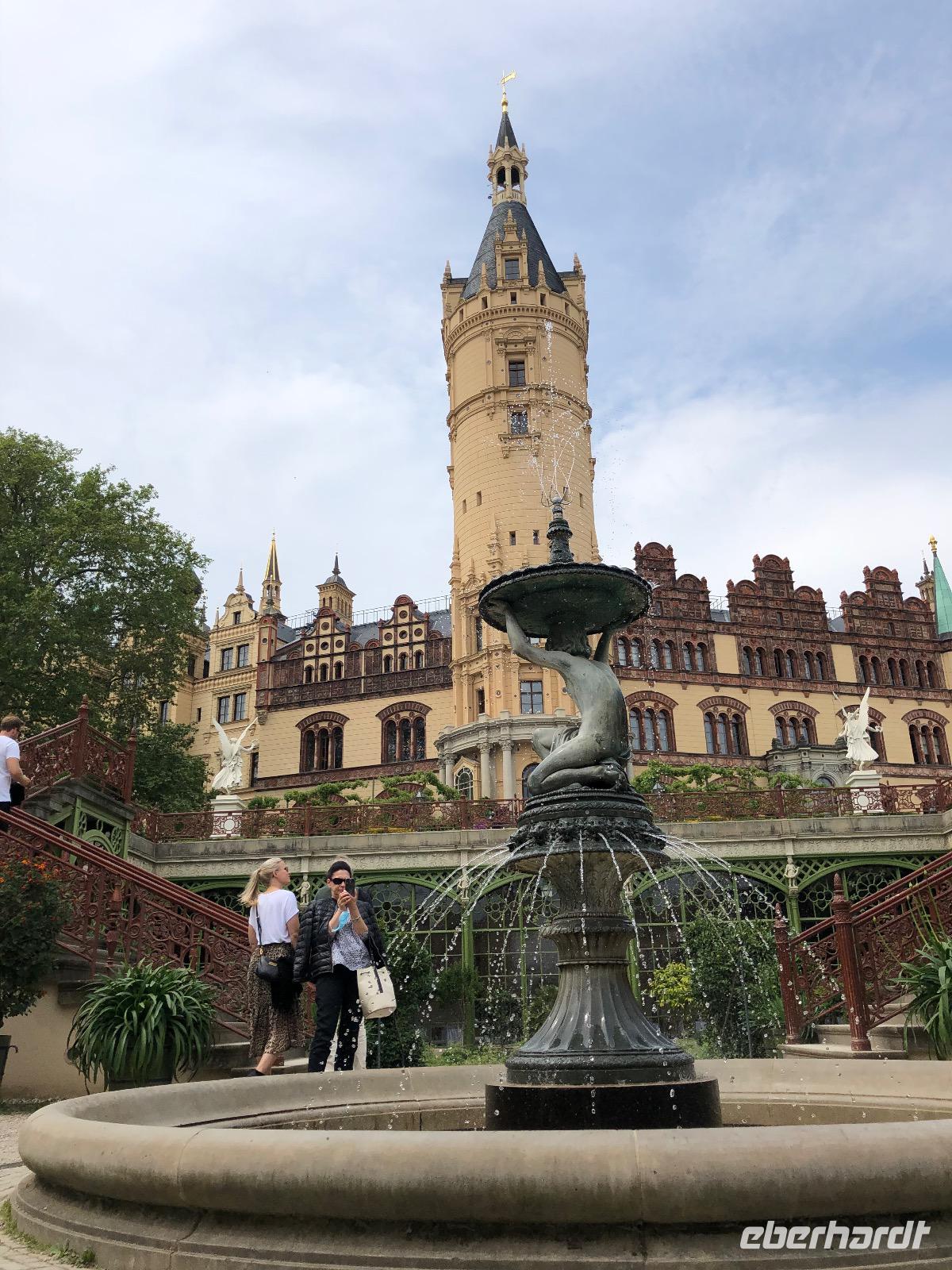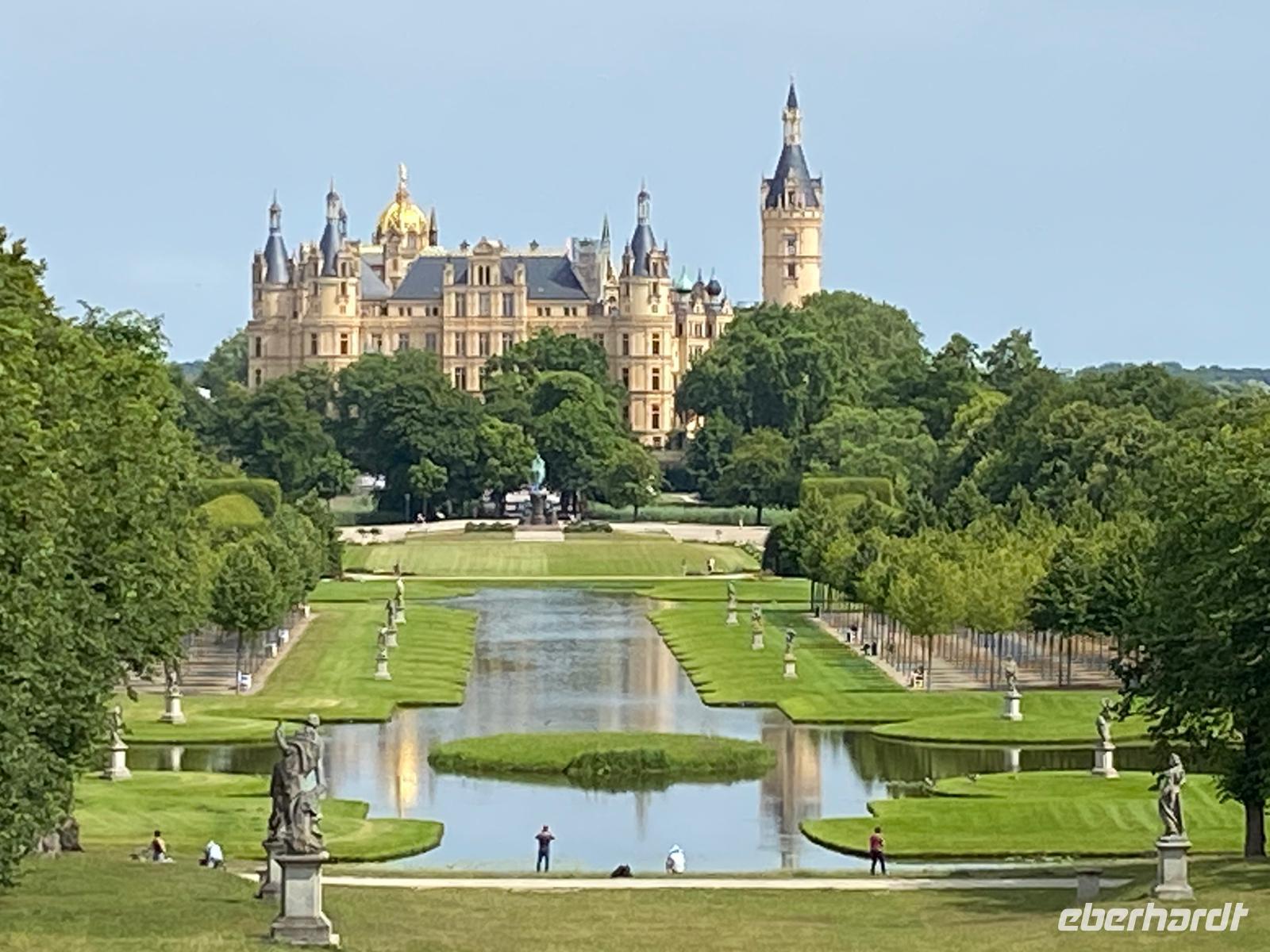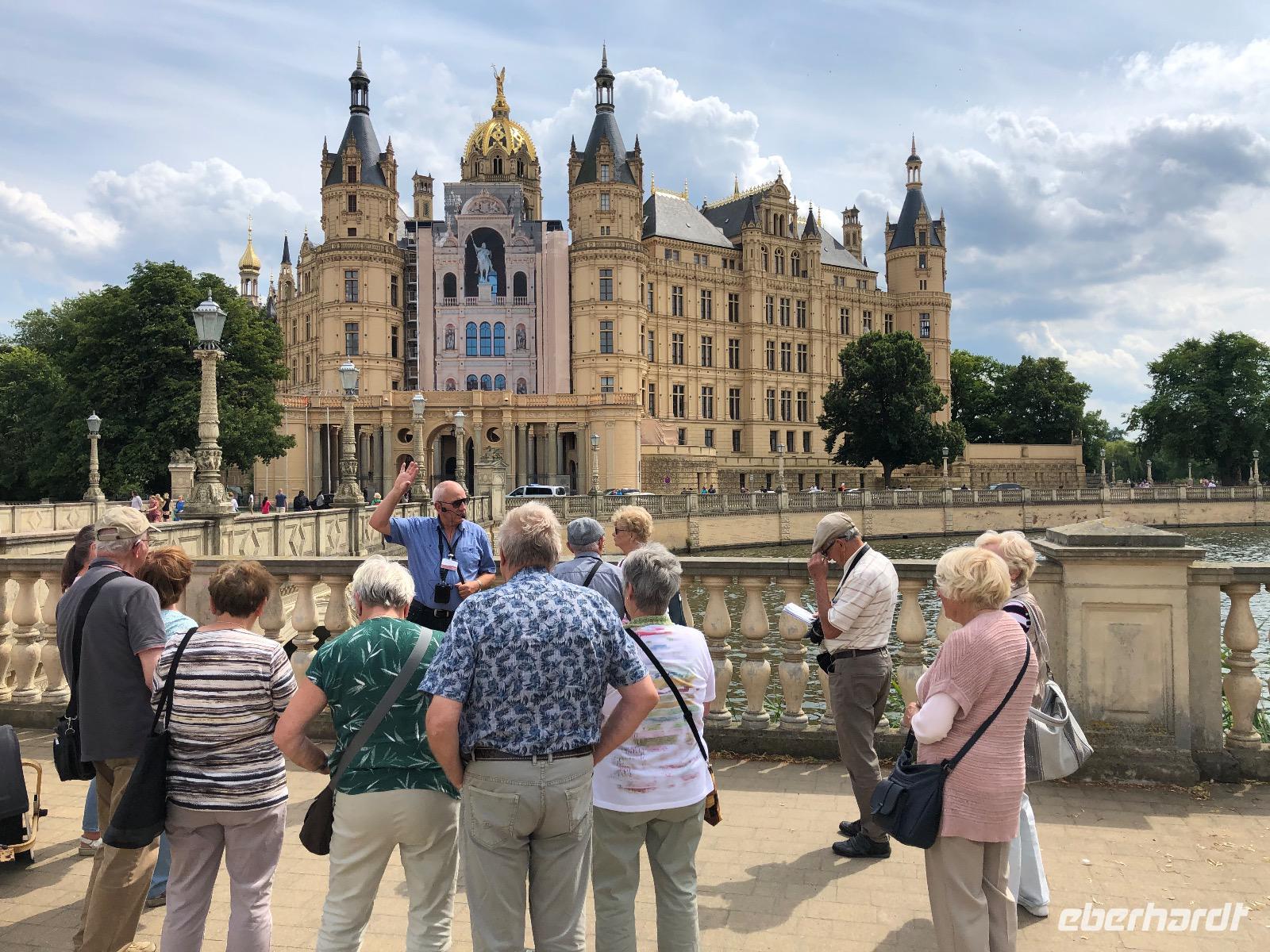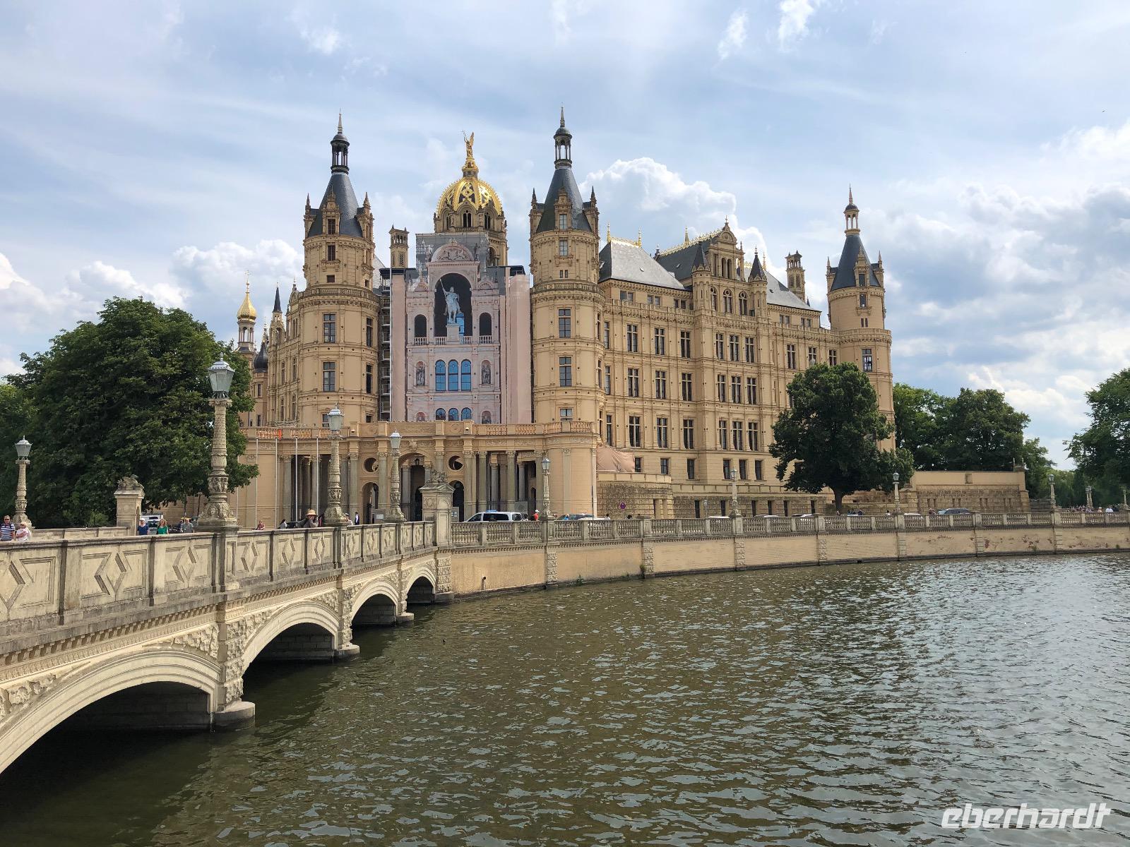 Dort wo ehemals die Obotritenburg Zuarin auf einer Insel im Schweriner See stand, ragt seit dem 19. Jahrhundert das heutige Wahrzeichen der Stadt empor. Schon von Weitem grüsst der Prachtbau und Sitz des Landtages jeden Besucher. Auch wir können uns dem Anblick nicht entziehen. Aber erst einmal begeben wir uns auf eine Stadtrundfahrt durch die mit weniger als 100.000 Einwohnern kleinste Landeshauptstadt Deutschlands.