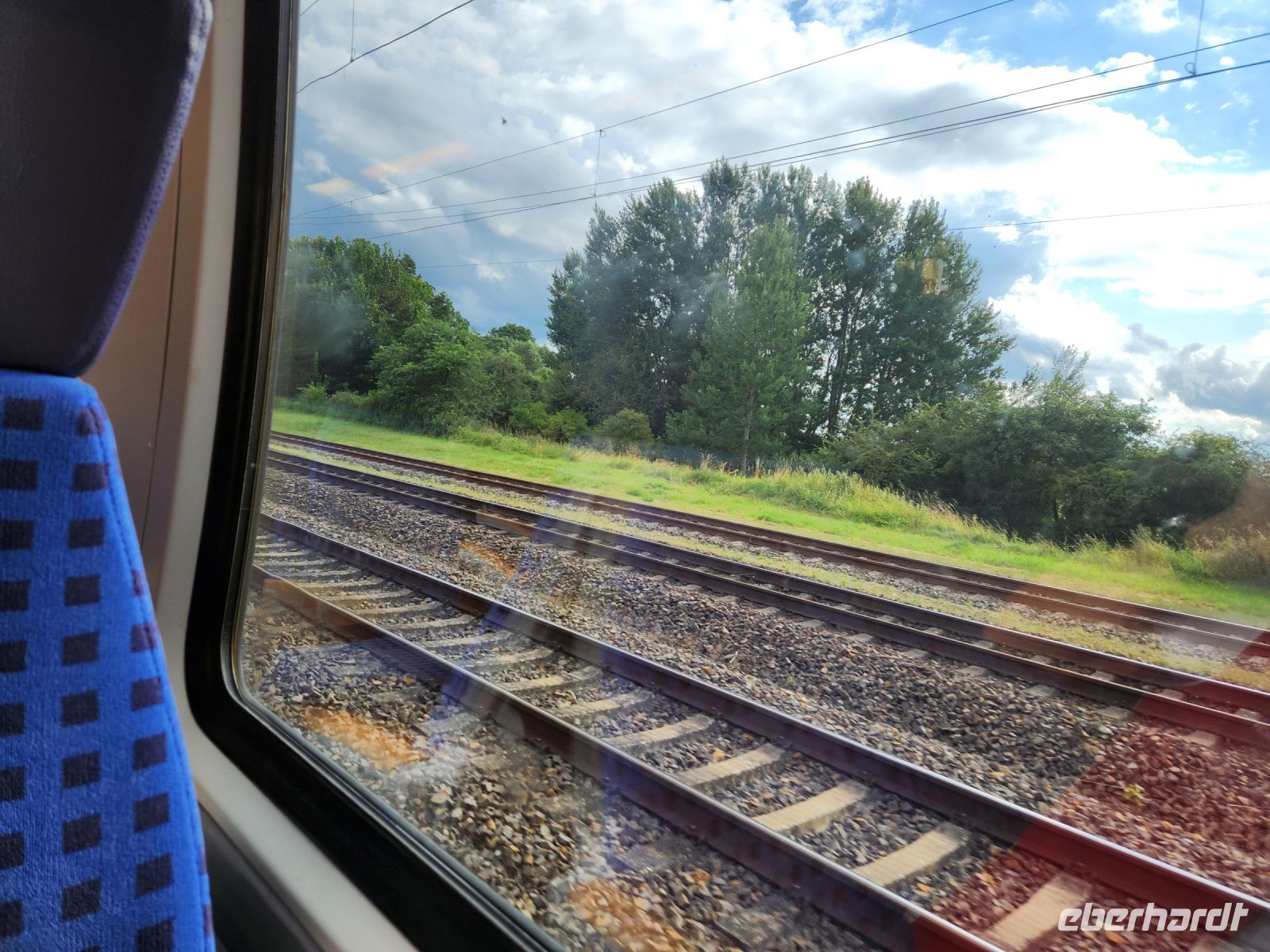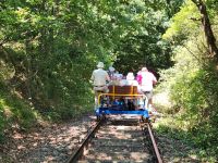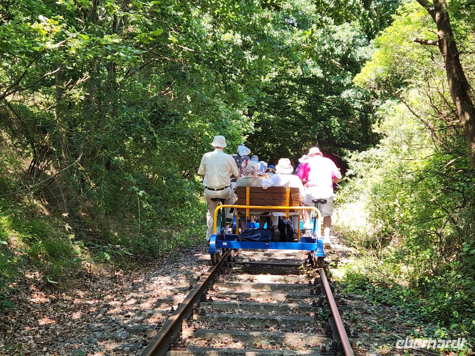 Mittags treffen wir uns alle wieder und wir schnuppern Eisenbahnflair auf stillgelegten Schienen. Zu viert sitzen wir jeweils auf einer Fahrrad-Draisine, 2 von uns müssen treten, 2 sitzen in der Mitte der Draisine auf einer kleinen Bank. Die ganze Strecke ist 13 km lang. Die Hitze an diesem Tag macht uns doch ganz schön zu schaffen. Und da wir auch von unseren 2 Radtouren ein bisschen von den leicht zu fahrenden E-Bikes verwöhnt sind, fällt uns die Draisinenfahrt doch schwerer als gedacht an diesem Tag. Wir schaffen immmerhin die Hälfte der Strecke, machen eine lange Pause im Schatten und machen uns dann auf den Rückweg.