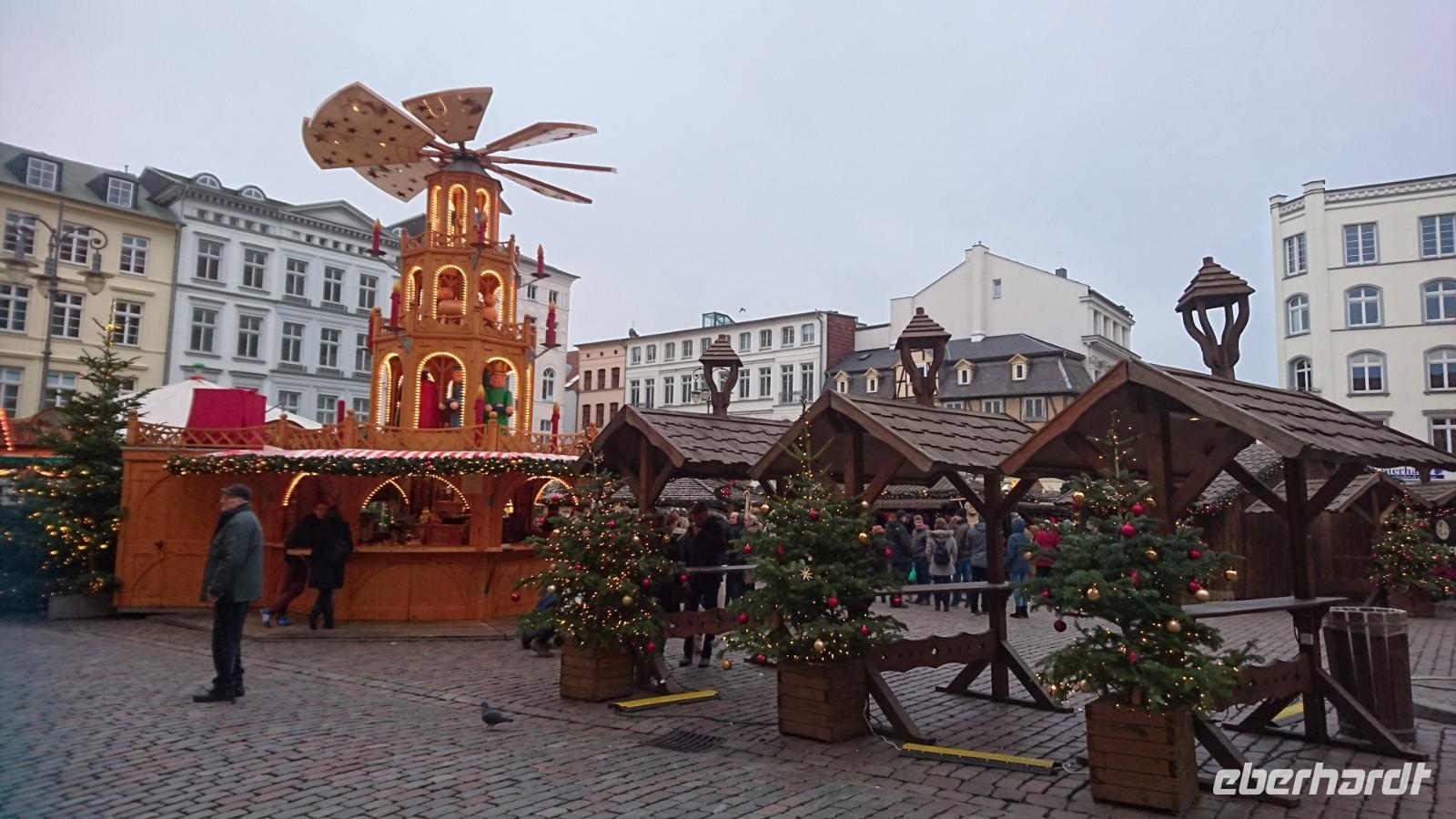 Schön geschmückte Stände und natürlich an jeder Ecke die duftenden gebrannten Mandeln oder der unverkennbare Glühweingeruch erfreute die Gäste und als wir alle am Marktplatz wieder eintrudelten, sang dort ein Seemannschor. Die Herren machten das so herrlich, daß der ein oder andere Gast sicher gern noch länger gelauscht hätte, aber wir hatten ja noch das bezaubernde Schloß Schwerin auf dem Programm und so spazierten wir gemütlich aus der mit Fachwerkhäusern reich gesegneten Altstadt hinüber zur Schloßinsel.