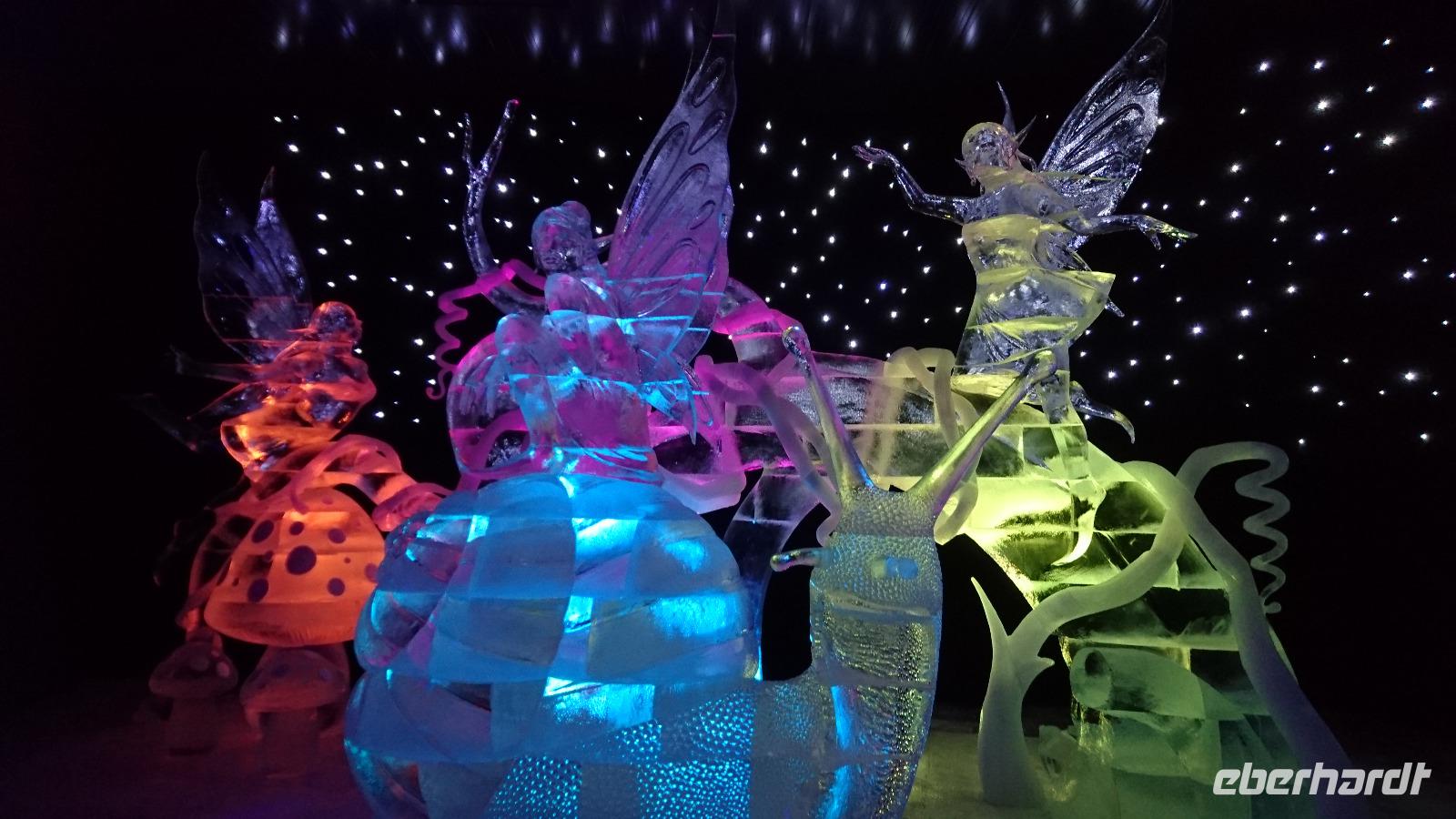 Danach ging es in Richtung Rövershagen. Dort befindet sich die berühmte Karls Erlebniswelt, ein Erdbeerhof, der sich von Jahr zu Jahr vergrößert und im Moment auch die größte Eisskulpturenausstellung in Europa bei frischen - 7 Grad bietet. Natürlich kann sich jeder denken, daß am 2. Feiertag ganz Mecklenburg mit Kind und Kegel diese Ausstellung besuchen möchte und uns wurde uns schon beim Anblick des übervollen Parkplatzes klar, daß wir hier wohl ein wenig Geduld brauchen würden. Es dauerte schon eine kleine Ewigkeit, bis ich endlich eine Kasse überzeugen konnte, uns doch bitte die Eintrittskarten auszuhändigen und man führte uns direkt zum Eingang der Eisskulpturen, da sonst auf dem Weg der ein oder andere sicher im Marmeladenladen oder im Fischershop im Getümmel untergegangen wäre. Eine magische Welt erwartete uns mit riesigen beleuchteten Drachen, Elfen, der Hexe Babajaga und sogar beweglichen Puppen aus Eis. Nach diesem fantastischen und eiskalten Erlebnis fuhren wir weiter in das nicht weit entfernte Schloß Gelbensande, wo uns wieder eine interessante Führung und danach ein wärmender Kaffee und leckerer Kuchen erwarteten und schwupps, war auch der letzte Tag schon wieder vorbei.