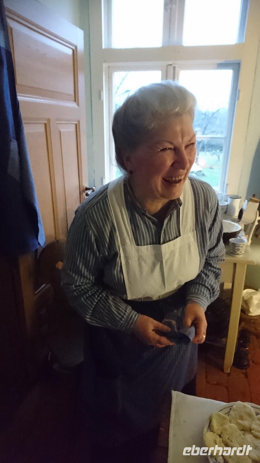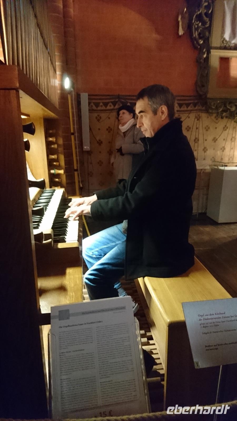 Dort empfing uns ein Organist, der uns liebevoll die Orgeln erklärte und vor allem: ER SPIELTE!!! Das erwärmte unsere Herzen und auch die Füße, die Kirche, in der die Orgeln stehen war nämlich nicht geheizt. So lauschten wir seinen Klängen und was besonders schön war, daß er das Hallelujah gleich auf mehreren Orgeln spielte, so daß wir ganz genau die Unterschiede im Klang der verschiedenen Orgeln wahrnehmen konnten. Einige Gäste hatten die Möglichkeit, den Balken einer sehr großen und tief klingenden Orgelpfeife zu bedienen und so wurde uns doch deutlich, daß Organist eine schweißtreibende Angelegenheit ist. Nach einem kurzen Aufwärmen im gegenüberliegenden Pfarrhaus, in dem eine kleine Geschichte der Orgeln in Mecklenburg zu sehen ist, machten wir uns auf den Weg zum nächsten Ziel, dem Freilichtmuseum Mueß.