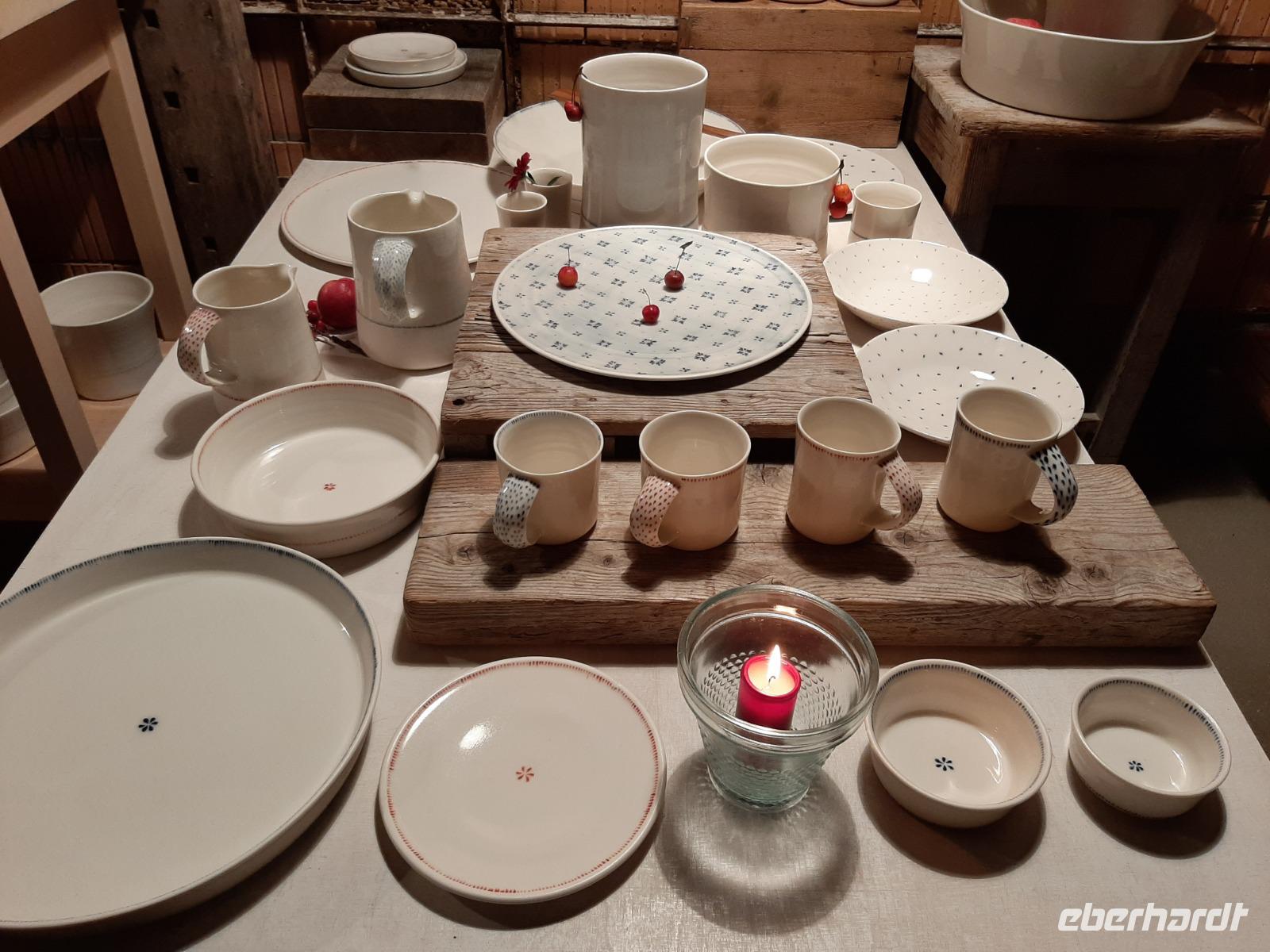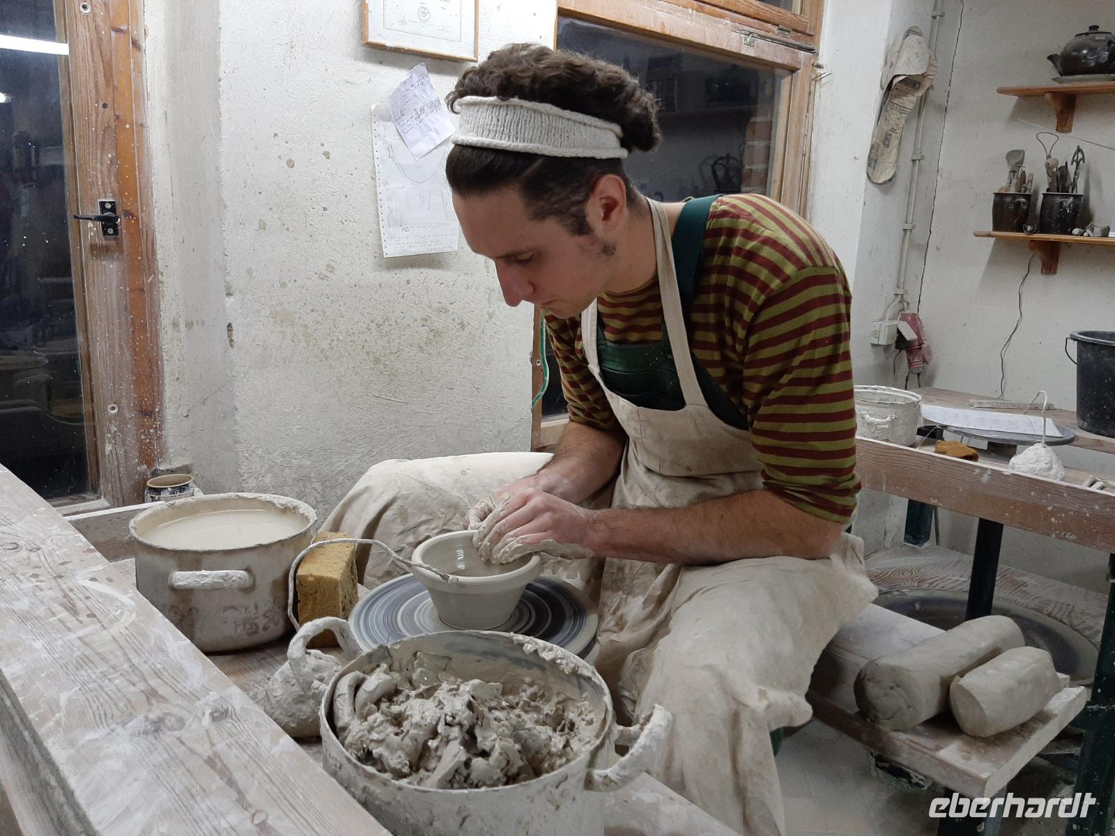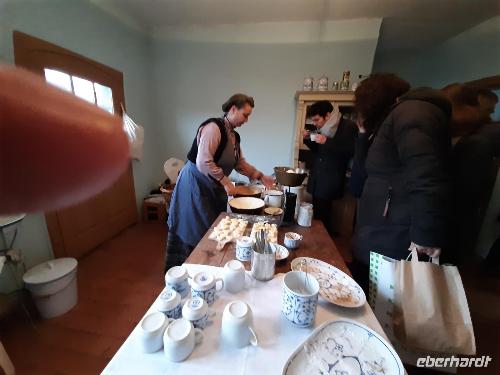 Nicht genug der Eindrücke bisher: am Nachmittag wird noch eins drauf gesetzt. Wir fahren nach Lenzen. Unterwegs gibt es als mittäglichen Imbiss Würstchen im Bus. Lenzen - das sind ein paar Häuser inmitten mecklenburgischer Natur, man könnte auch meinen: da, wo sich Fuchs und Hase Gute Nacht sagen. Genau dort, inmitten einfacher Natur, üben Töpfer ihr Handwerk aus. Wir besuchen zwei Töpfereien ganz unterschiedlicher „Philosophie" . Ist es in dem einem Töpferhof die denkbar einfachste Linie, die im Sortiment verfolgt wird und größte Funktionalität im Einklang mit zeitlosen Formen hervorbringt, geht in dem anderen das Holzfeuer eine zarte Symbiose mit dem Porzellan ein. Die Einfachheit der Natur und die herzliche Freundlichkeit der Gastgeber ziehen uns schnell in ihren Bann. Die Krönung ist, dass es noch dazu echte selbstgebackene köstlicche Plätzchen und einen wärmenden Punsch gibt. Was liegt näher, als Weihnachtslieder anzustimmen ... ? „Stille Nacht ...." Beeindruckt und mit dem ein oder anderen erstandenen Keramikteil im Gepäck fahren wir zu nserem Hotel zurück. Der Blick auf das erhabene Güstrower Schloss lässt uns wissen, dass wir da sind und die Vorfreude auf das abendliche Buffet beginnt spätestens jetzt.