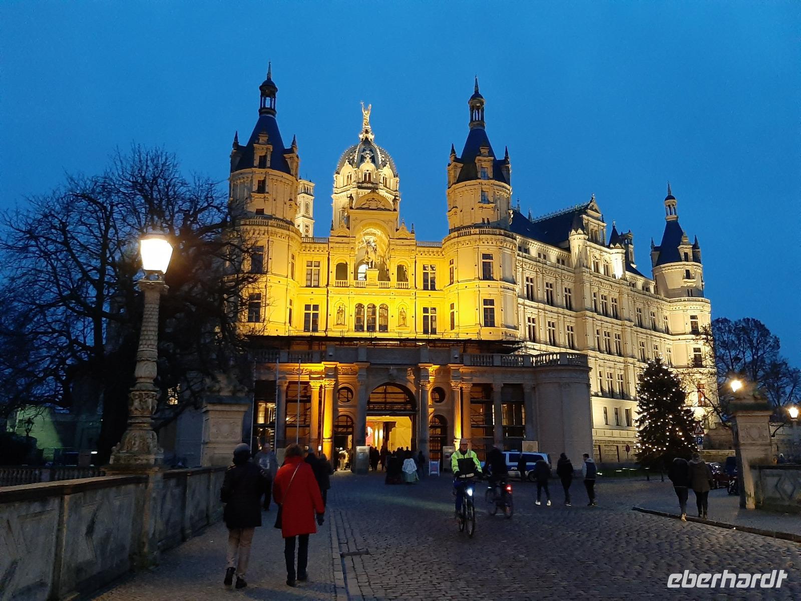 Die Reise beginnt heute am Sonntag, den 22.12. 2019, als die ersten Gäste am Flughafen Dresden in den Bus zusteigen. Die Reiseleiterin Birgit Hornung und der Fahrer Michael Dietze sind an Bord und begrüßen sie herzlich. Über die weiteren Zustiege Döbeln-Nord, Leipzig-Flughafen, Neu-Plötzin und Fehrbellin erreichen wir nahe Schwerin das ehemalige Fischer- und Bauerndorf Mueß, gelegen direkt am Südufer des Schweriner Sees. Hier treffen wir auch auf die selbst angereisten Gäste und unsere Gruppe ist nun komplett. Das Freilichtmuseum Mueß ist ein ganzjährig geöffnetes Museum, das über die Lebensweise der mecklenburgischen Landbevölkerung vom 17. Jahrhundert bis zum Beginn des 20. Jahrhunderts informiert. Inmitten reetgedeckter Häuser und Scheunen besuchen wir den stimmungsvollen Adventsmarkt „wintersonnenWERKE" , der inzwischen traditionsgemäß am 4. Adventswochenende des Jahres stattfindet. Das Ambiente des Museumsdorfes erzeugt eine besondere Stimmung, woran auch das unfreundliche Wetter nichts zu ändern vermochte. Kunsthandwerker zeigen ihre Erzeugnisse und Gerichte, hergestellt nach alten Rezepten, werden zum Verkosten angeboten. Gleich anschließend fahren wir zum Schweriner Schloss, das schon durch seine Lage auf einer Insel im Schweriner See besticht. Das Schweriner Schloss war jahrhundertelang die Residenz der mecklenburgischen Herzöge und Großherzöge und ist heute Sitz des Landtages von Mecklenburg-Vorpommern. Das Bauwerk gilt als das bekannteste und prächtigste der über zweitausend Schlösser und Herrenhäuser in Mecklenburg-Vorpommern und als eines der bedeutendsten Beispiele des Romantischen Historismus in Europa. Es gehört mit den einstigen Herzogsschlössern von Güstrow, Ludwigslust und Neustrelitz zu den Hauptresidenzen in Mecklenburg. Bei einer Führung im Schloss machen sich die Gäste direkt davon ein anschauliches Bild. Bei einbrechender Dunkelheit nimmt unser Bus nun Kurs Richtung Güstrow zu unserem "Hotel Am Schlosspark Güstrow". Dort angekommen nimmt uns der wunderschöne Anblick des beleuchteten Schlosses Güstrow gegenüber des Hotels sogleich gefangen. Das sehr freundliche Personal des *** Superior Hotels der gehobenen Mittelklasse begrüßt uns, wir checken ein und trefen uns bald danach zum ersten gemeinsamen Abendessen in Buffetform wieder. Wir haben einen Teil der Räumlichkeiten für uns als Gruppe und spüen, dass wir uns in den nächsten Tagen hier und bei dem schmackhaften Essen wohlfühlen werden. Dieser Anreisetag hatte für einige der Gäste durchaus sehr früh begonnen und war bereits gefüllt war mit Programmpunkten. Gut verständlich, dass man sich gerne alsbald in sein komfortables Zimmer zum Entspannen und erholsamen Schlaf zurückziehen möchte, je nach Bedarf nach einem kurzen Spaziergang in die sehr nahe befindliche Altstadt von Güstrow.