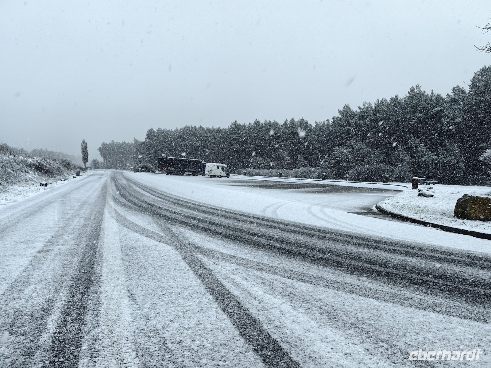 Während unserer Reise gen Norden schneit es so heftig, daß es die Scheibenwischer der Busfrontscheibe teilweise gar nicht schaffen, die dicken Flocken in Schach zu halten und die Szenerie rechts und links sieht wirklich aus wie in Winter-Weihnachts-Katalogen. Die Rehe stehen direkt an der Schnellstraße. Erst etwa 50 Kilometer vor Güstrow läßt das Schneetreiben nach.