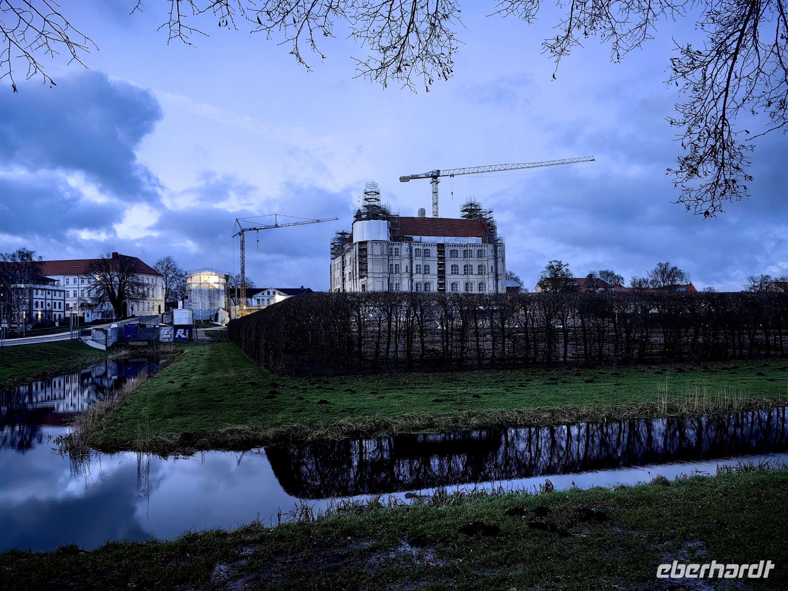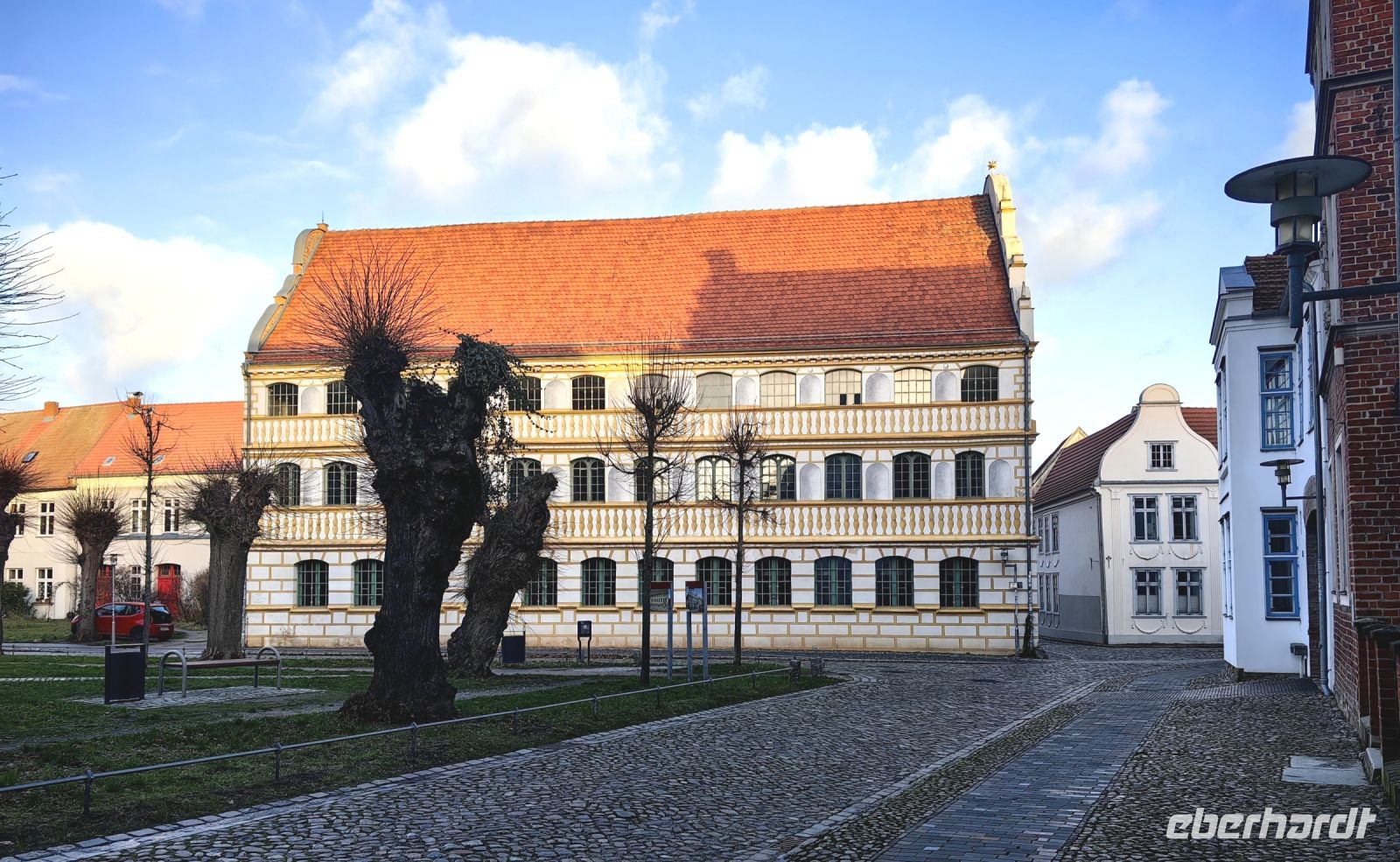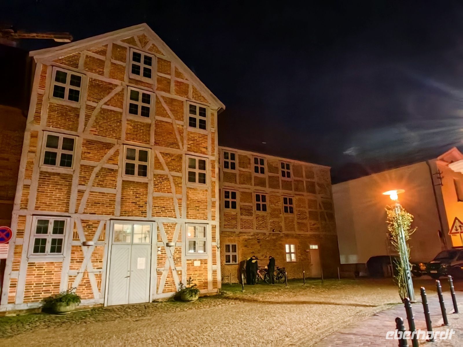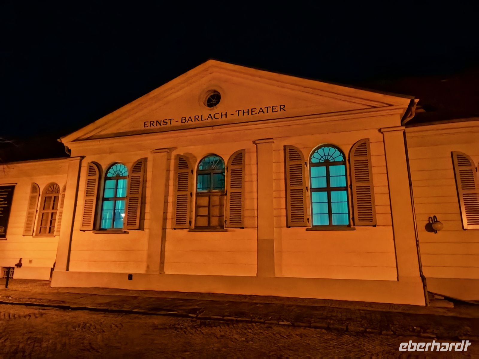 Der zünftig gekleidete, mit Hellebarde und Laterne ausgestattete Bursche nimmt uns mit in eine kleine verwinkelte und von etlichen Fachwerkhäusern gesäumte Altstadt und erzählt uns eine spannende Anekdote nach der anderen. Wir spazieren am Marktplatz vorbei, sehen das Rathaus, mittelalterliches Fachwerk mit schmalen Türchen und reich geschmückten Fensterchen. Am Ernst-Barlach-Theater verweilen wir ein wenig und beenden unseren Rundgang am Schloß, welches gerade aufwendig saniert wird und völlig von Bauplanen verdeckt ist.
