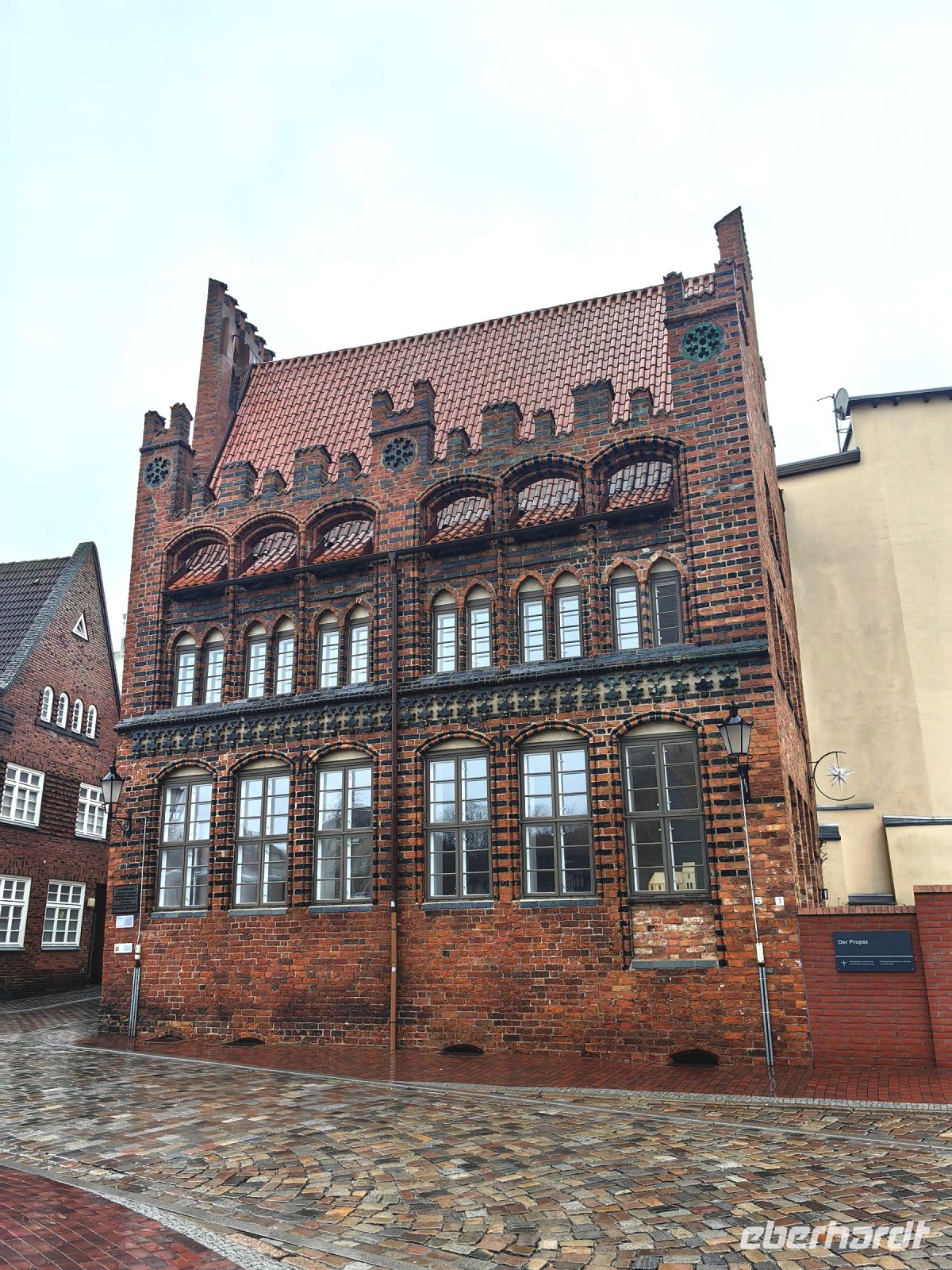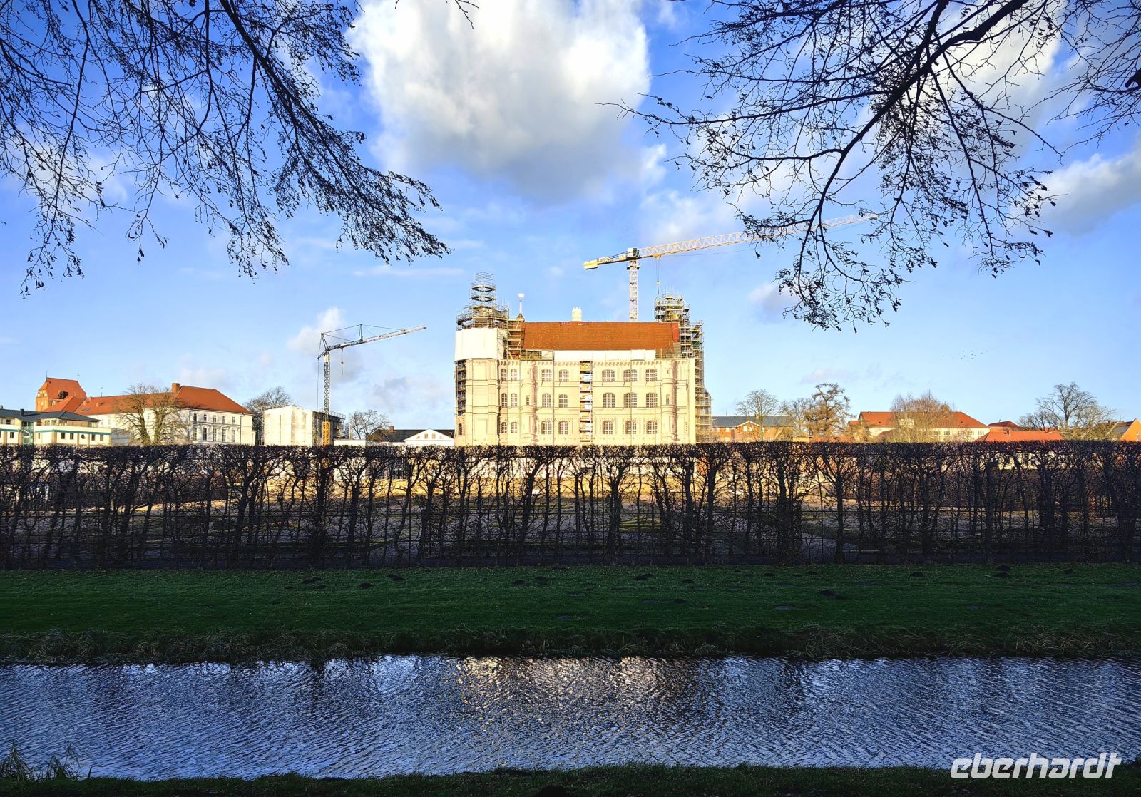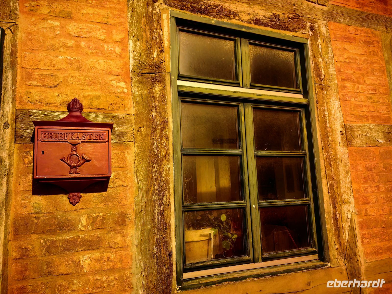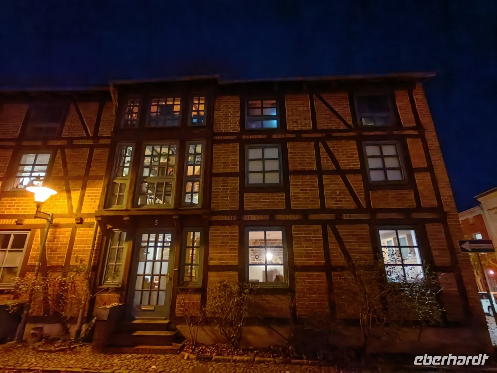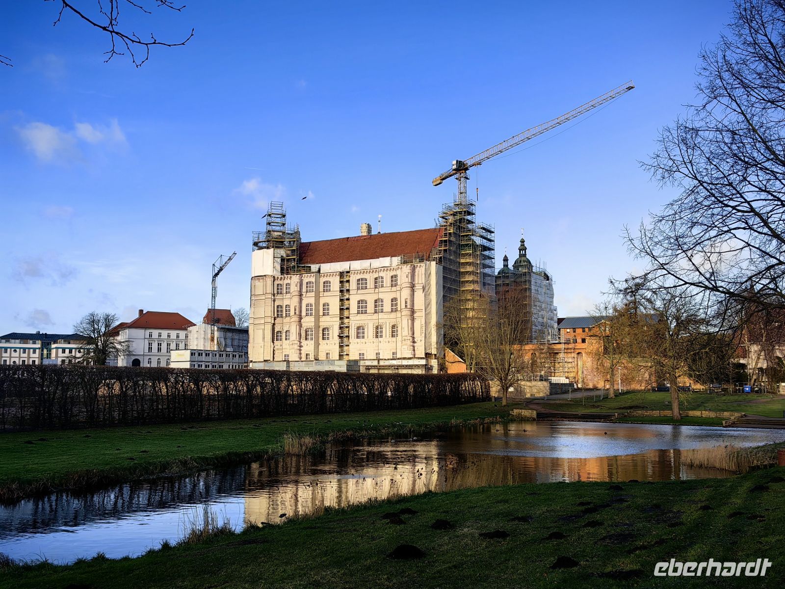 Der zünftig gekleidete, mit Hellebarde und Laterne ausgestattete Bursche nimmt uns mit in eine kleine verwinkelte und von etlichen Fachwerkhäusern gesäumte Altstadt und erzählt uns eine spannende Anekdote nach der anderen. Wir spazieren am Marktplatz vorbei, sehen das Rathaus, mittelalterliches Fachwerk mit schmalen Türchen und reich geschmückten Fensterchen. Am Ernst-Barlach-Theater verweilen wir ein wenig und beenden unseren Rundgang am Schloß, welches gerade aufwendig saniert wird und völlig von Bauplanen verdeckt ist.