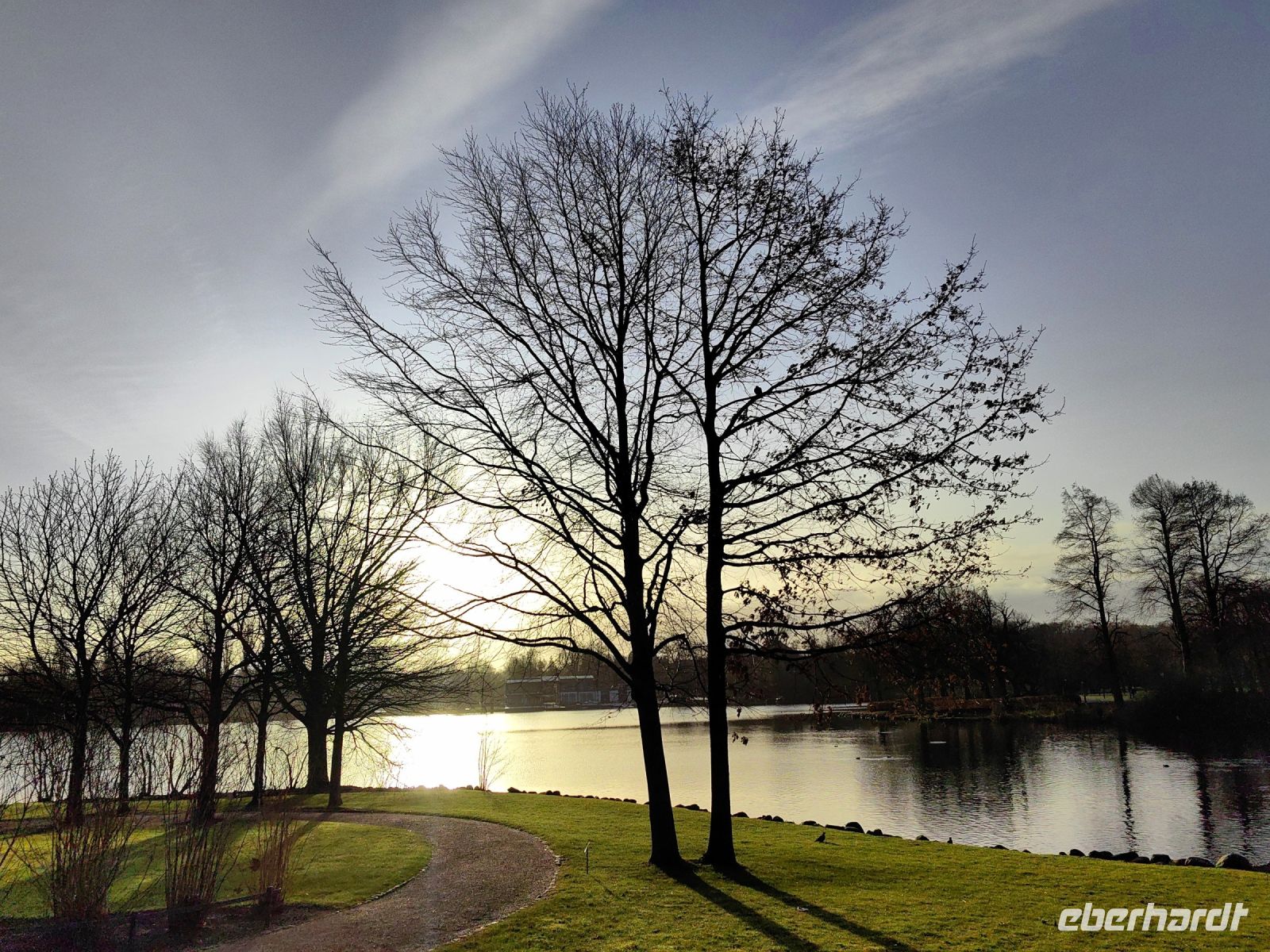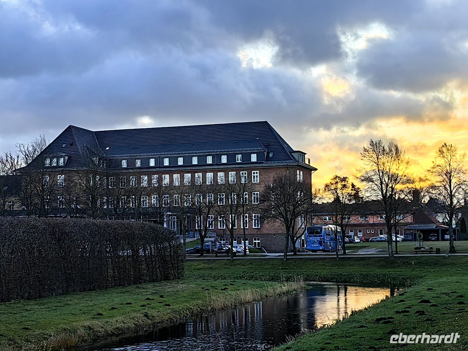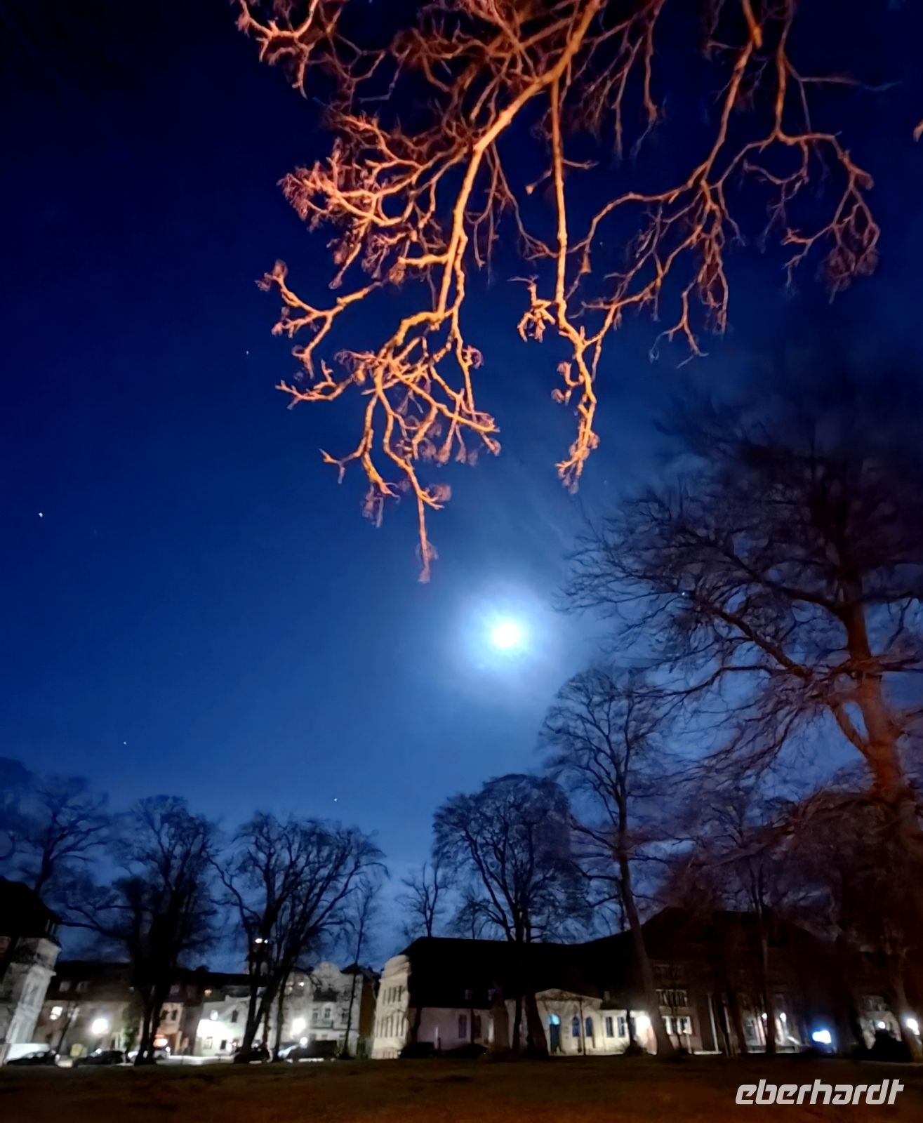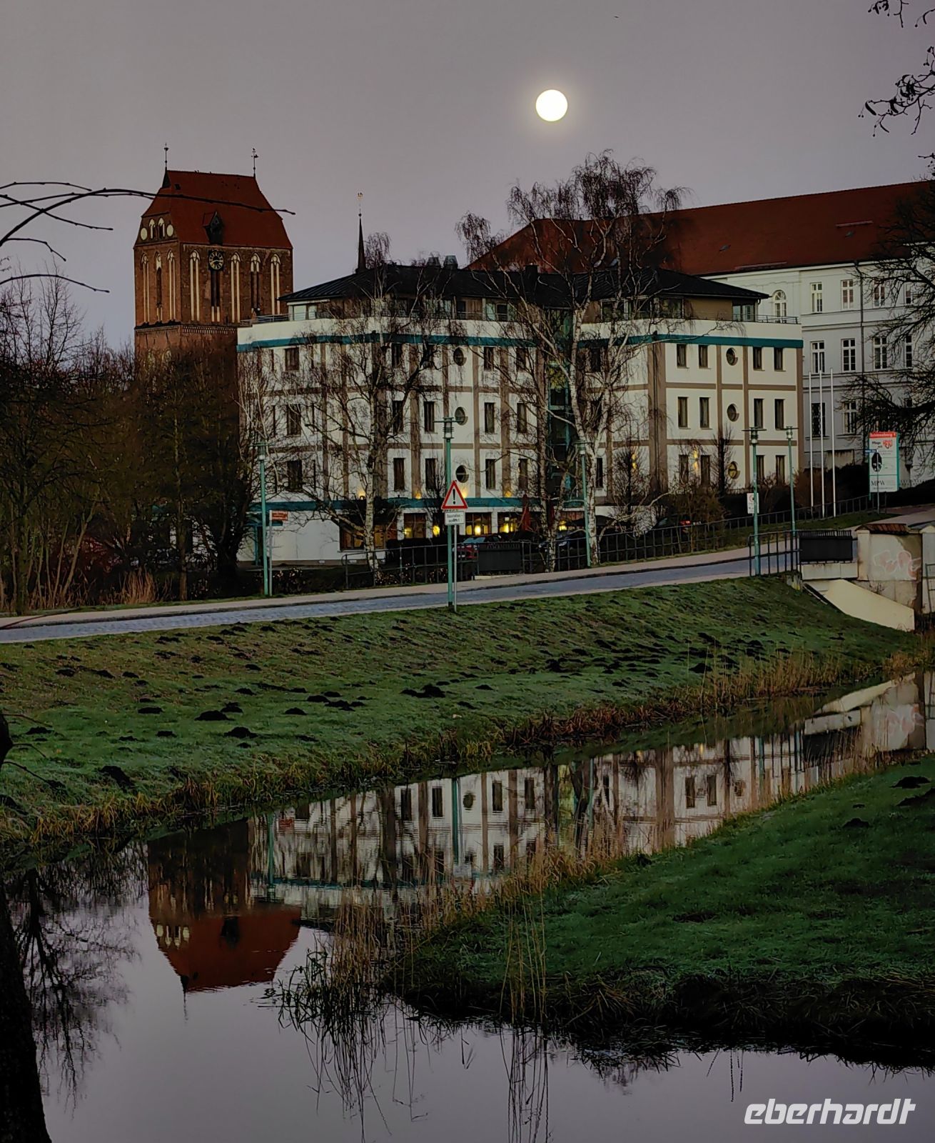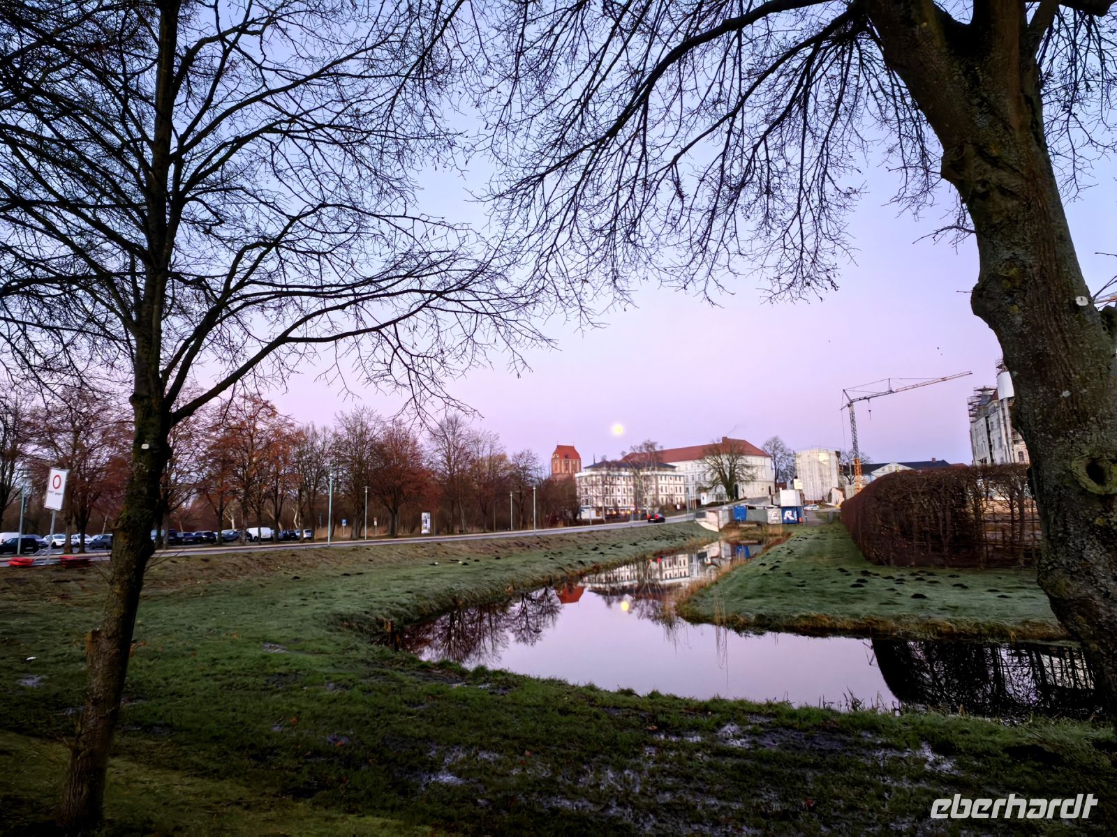 Nach dem Frühstück und dem Abschiednehmen von den Gästen, die Silvester noch in Güstrow verbringen werden, machen wir uns auf den Rückweg. Die Szenerie scheint uns verabschieden zu wollen, Der Mond steht voll und gelb über dem Schloßberg und als wir los fahren, geht die Sonne auf und macht uns den Abschied wirklich schwer.