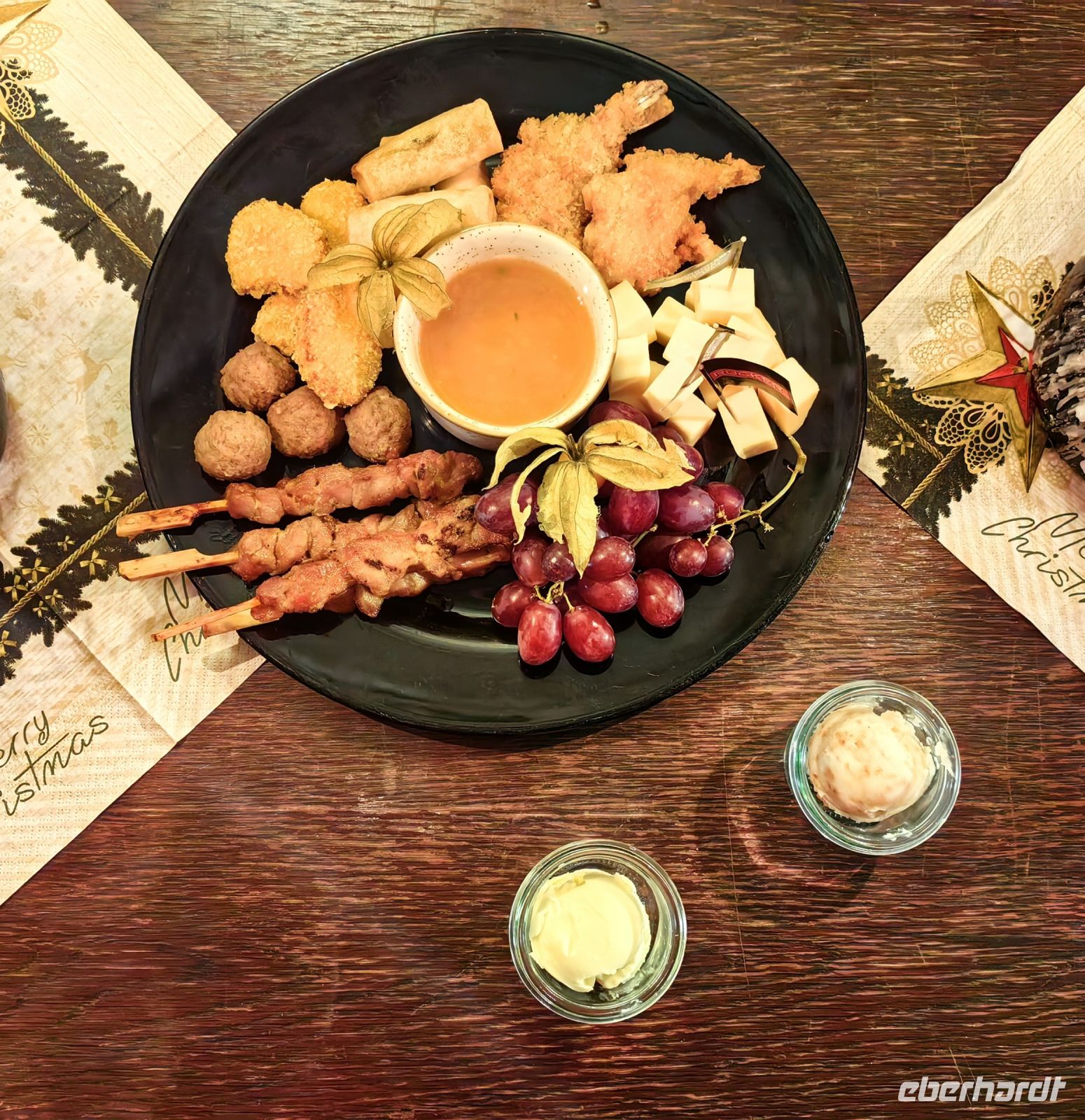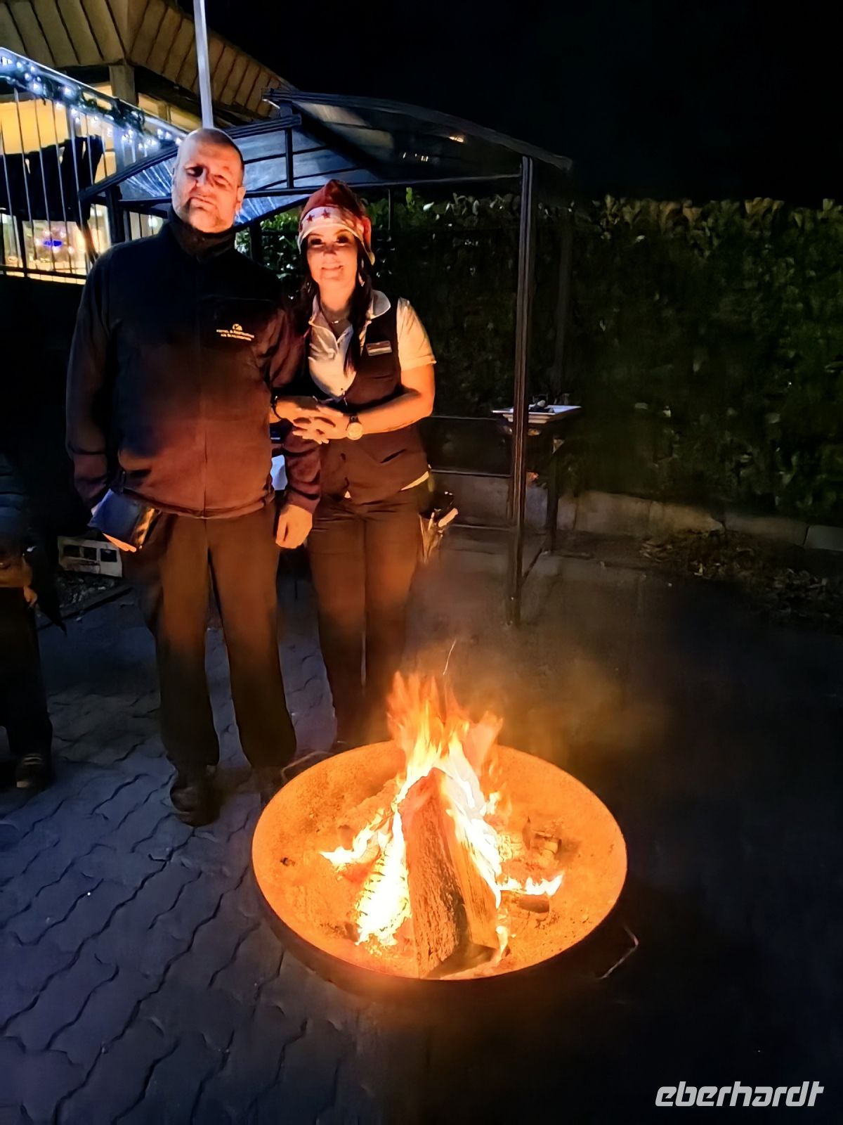 Am Abend finden wir uns alle auf der Hotelterrasse zum erneuten Glühwein-Umtrunk am offenen Feuerkorb ein und wenig später gibt es den lang ersehnten Entenbraten mit Klößen und Rotkraut. Lange noch verweilen wir, solch ein herrlicher Urlaubstag könnte unendlich sein ...