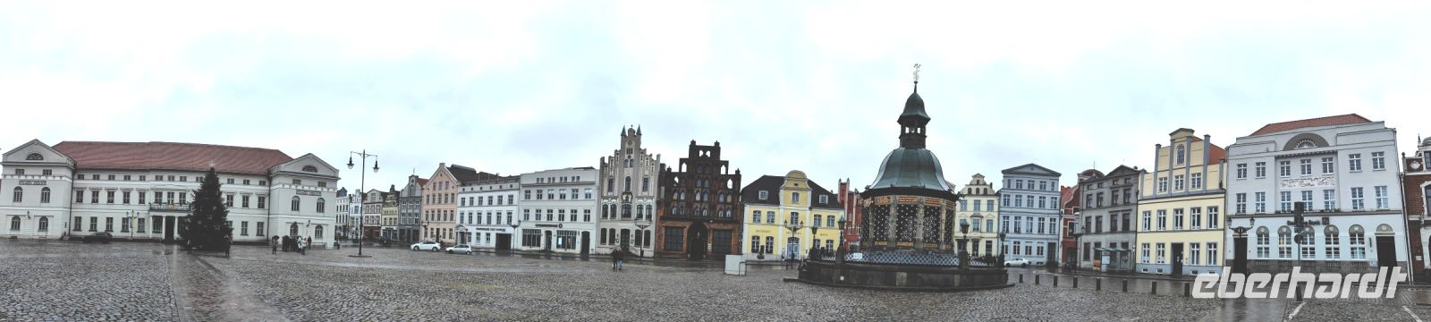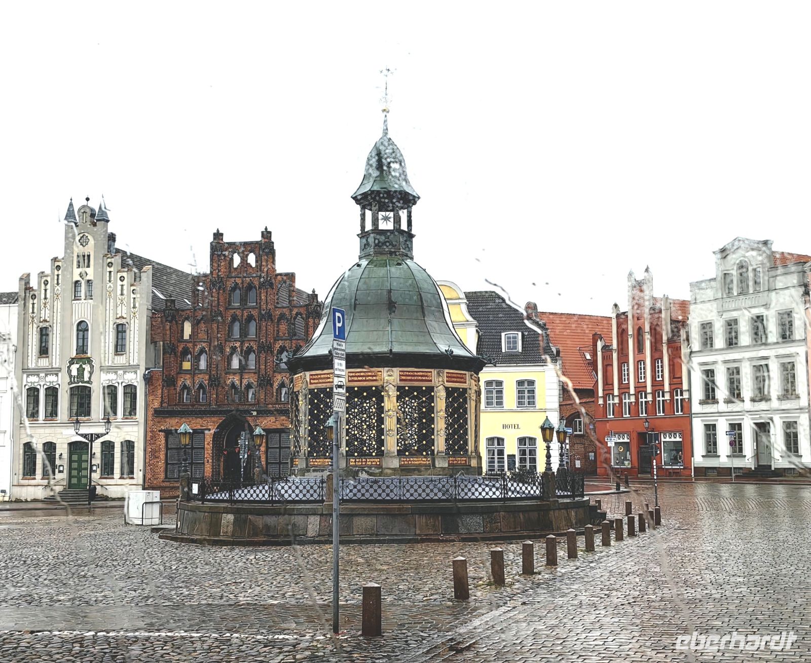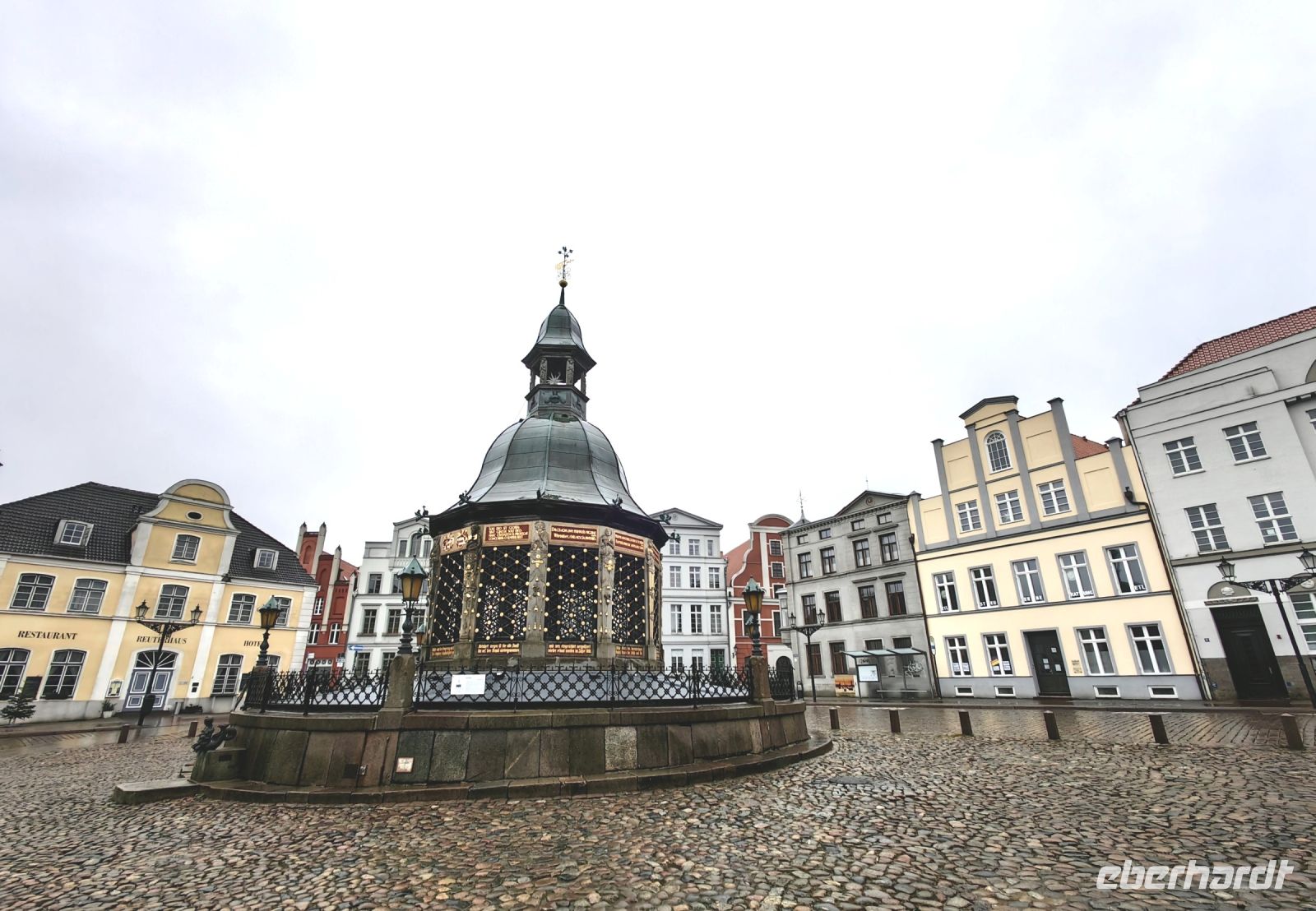 An der Wismarer Wasserkunst, mitten auf dem einen Hektar großen Marktplatz bleiben wir stehen. Dieser Brunnen ist das Wahrzeichen der Stadt und wurde im Jahre 1602 fertig gestellt. Er hat zwölf Ecken und auf diesen befindet sich eine Kupferhaube mit einer sechseckigen Laterne. Zur Zeit seiner Erbauung diente er der Wasserversorgung und wurde vom nahe gelegenen Mühlteich gespeist.