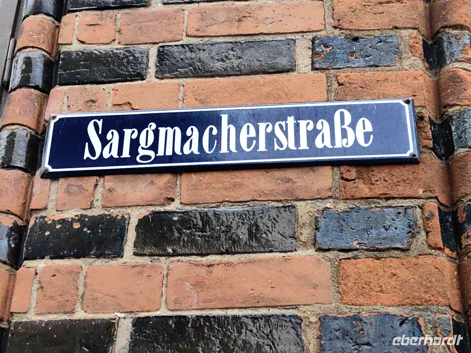 Beim Rundgang fallen uns einige Straßennamen auf, unter anderem die Sargmacherstraße, oder die Tittentasterstraße. Sie ist im Stadtplan gar nicht verzeichnet und wurde auch in älteren Plänen nicht erwähnt. Doch in früheren Zeiten hat es an dieser Stelle zwischen den Gebäuden einen sehr schmalen Durchgang vom Markt zur Diebsstraße gegeben und weil dieser so eng gewesen sein soll, daß sich zwei Personen, die gleichzeitig hindurch wollten unweigerlich mit Körperkontakt begegneten, kam sie zu ihrem auffälligen Namen.