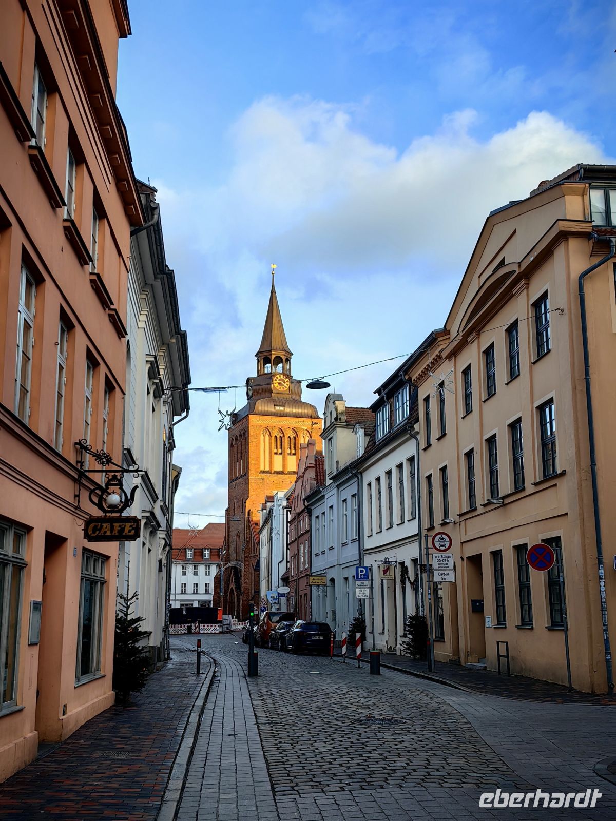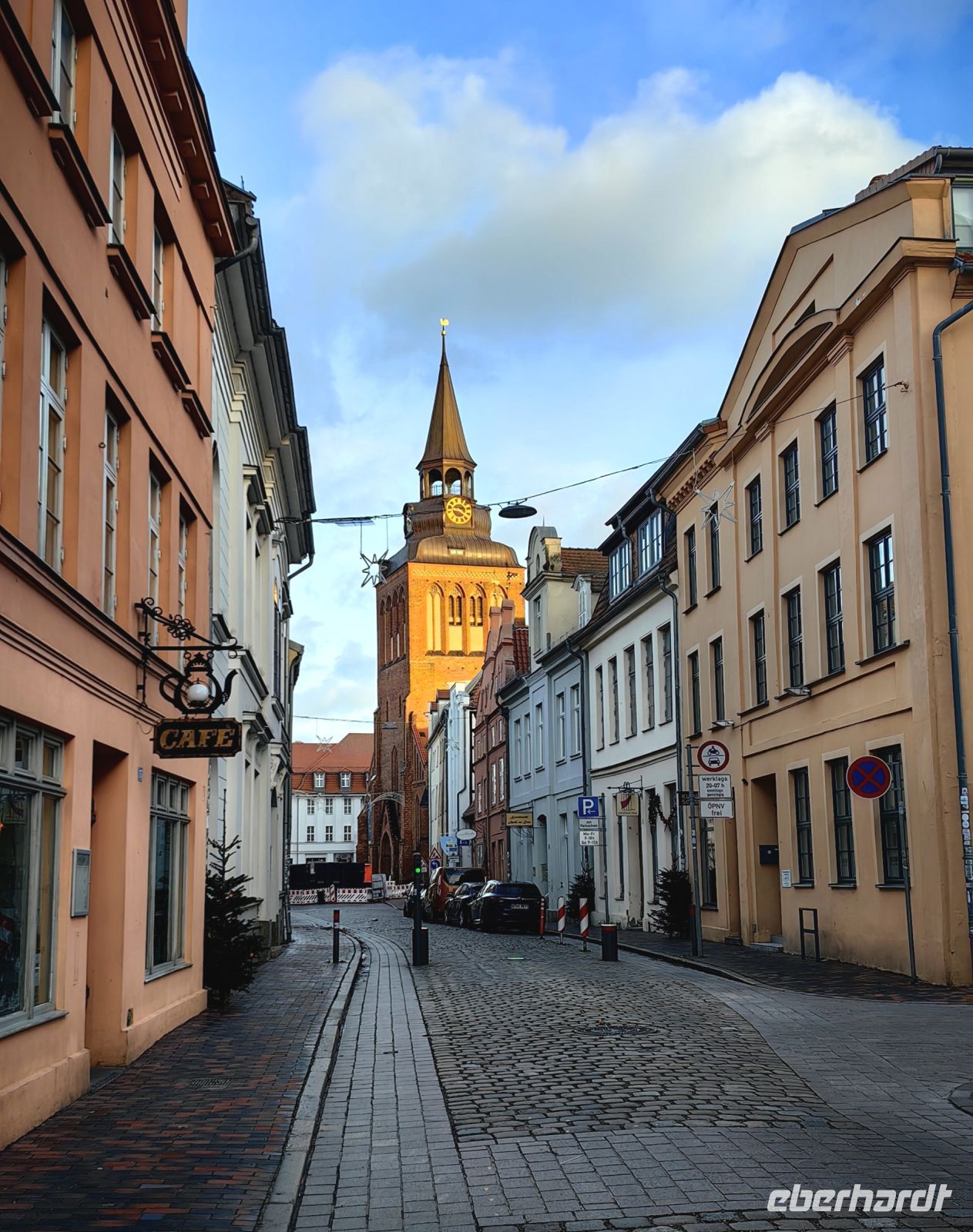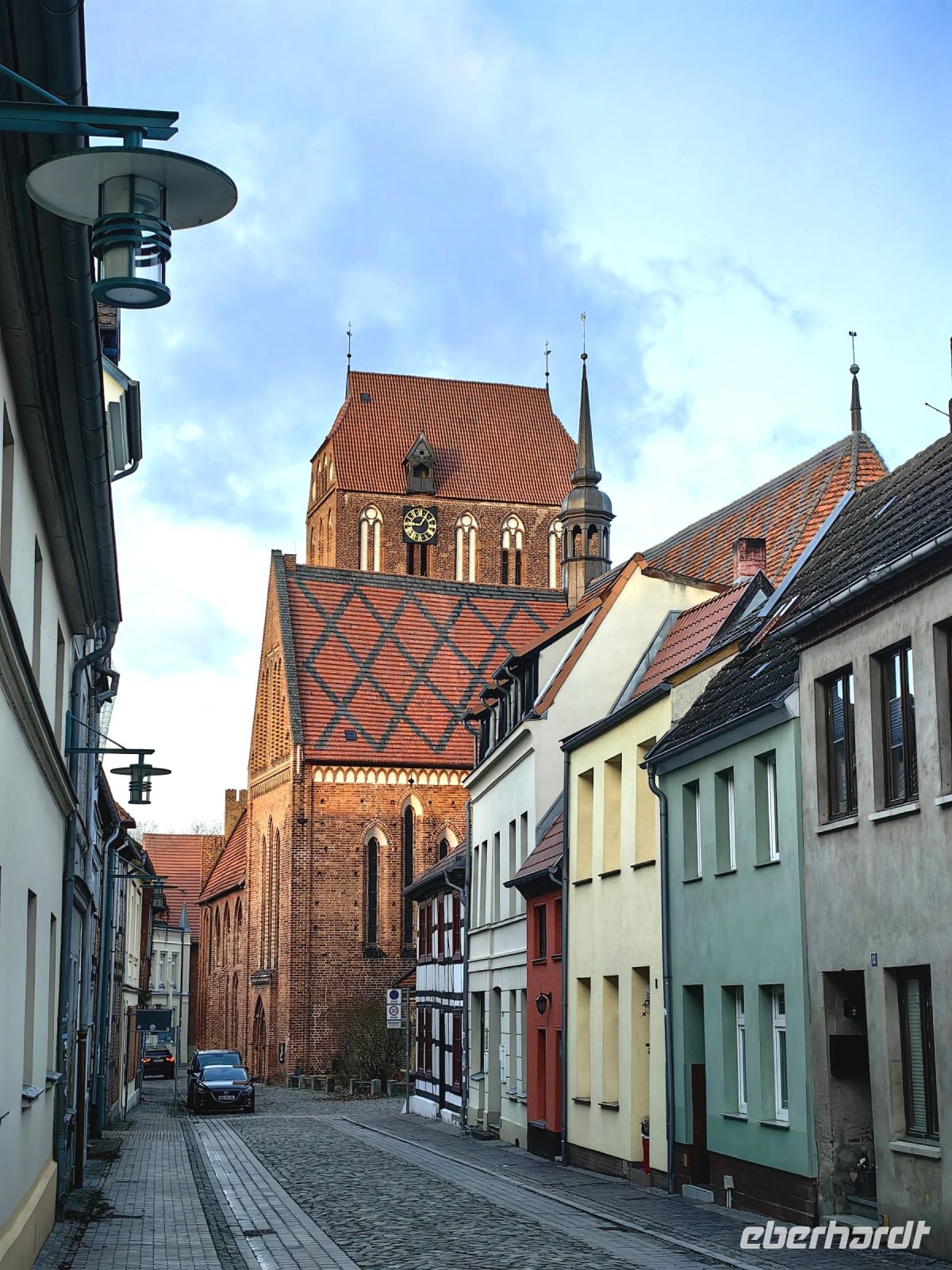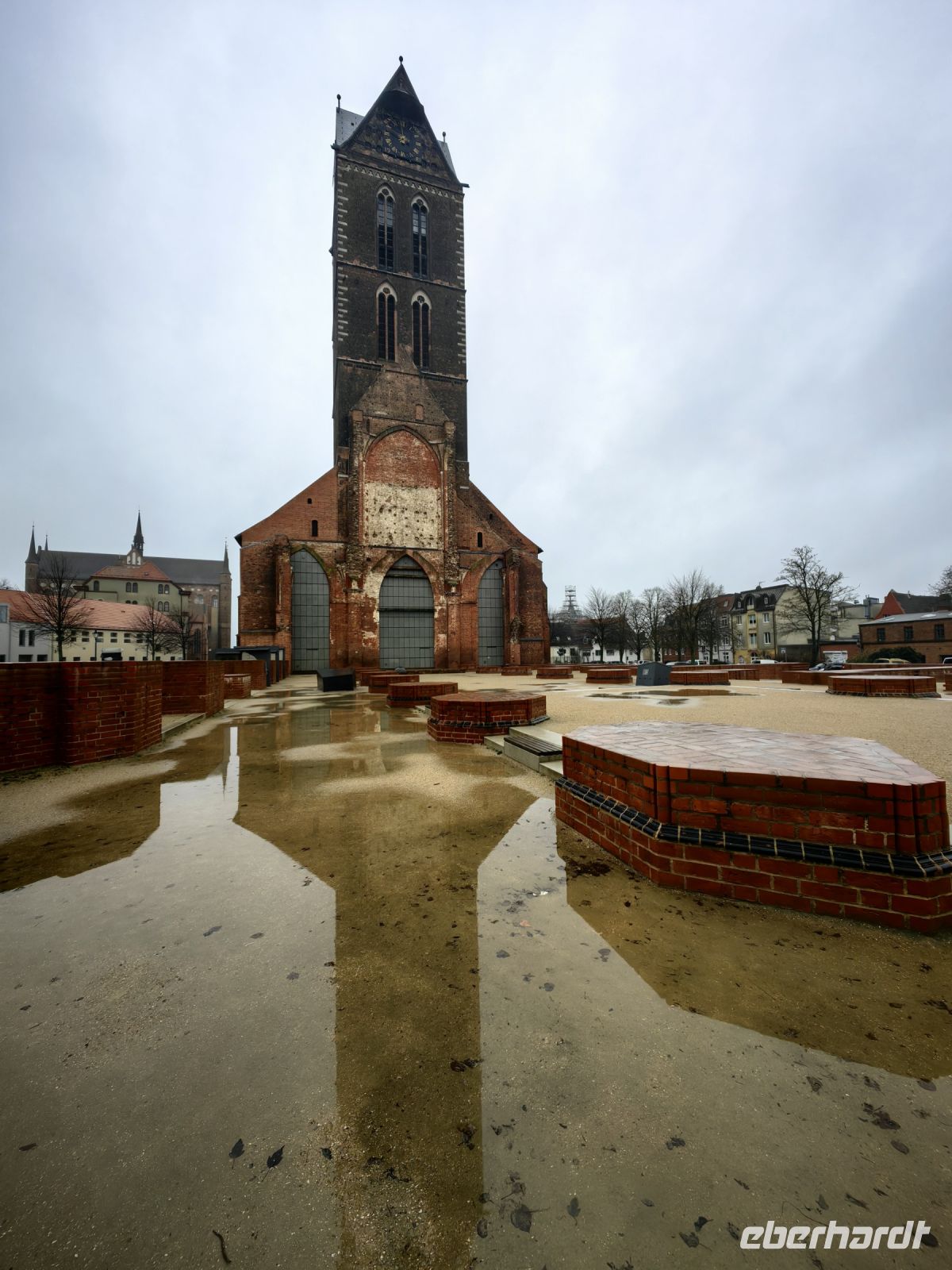 Wir beenden unseren Stadtspaziergang am Turm der Marienkirche, der wie ein mahnender Finger gut 80 Meter hoch über die Stadt hinausragt. Im zweiten Weltkrieg wurde das Kirchenschiff schwer beschädigt und zu DDR Zeiten beschloß man, es zu sprengen. So sieht dieser Platz heut ein wenig wie eine große klaffende Wunde im sonst so beschaulichen Stadtbild aus.