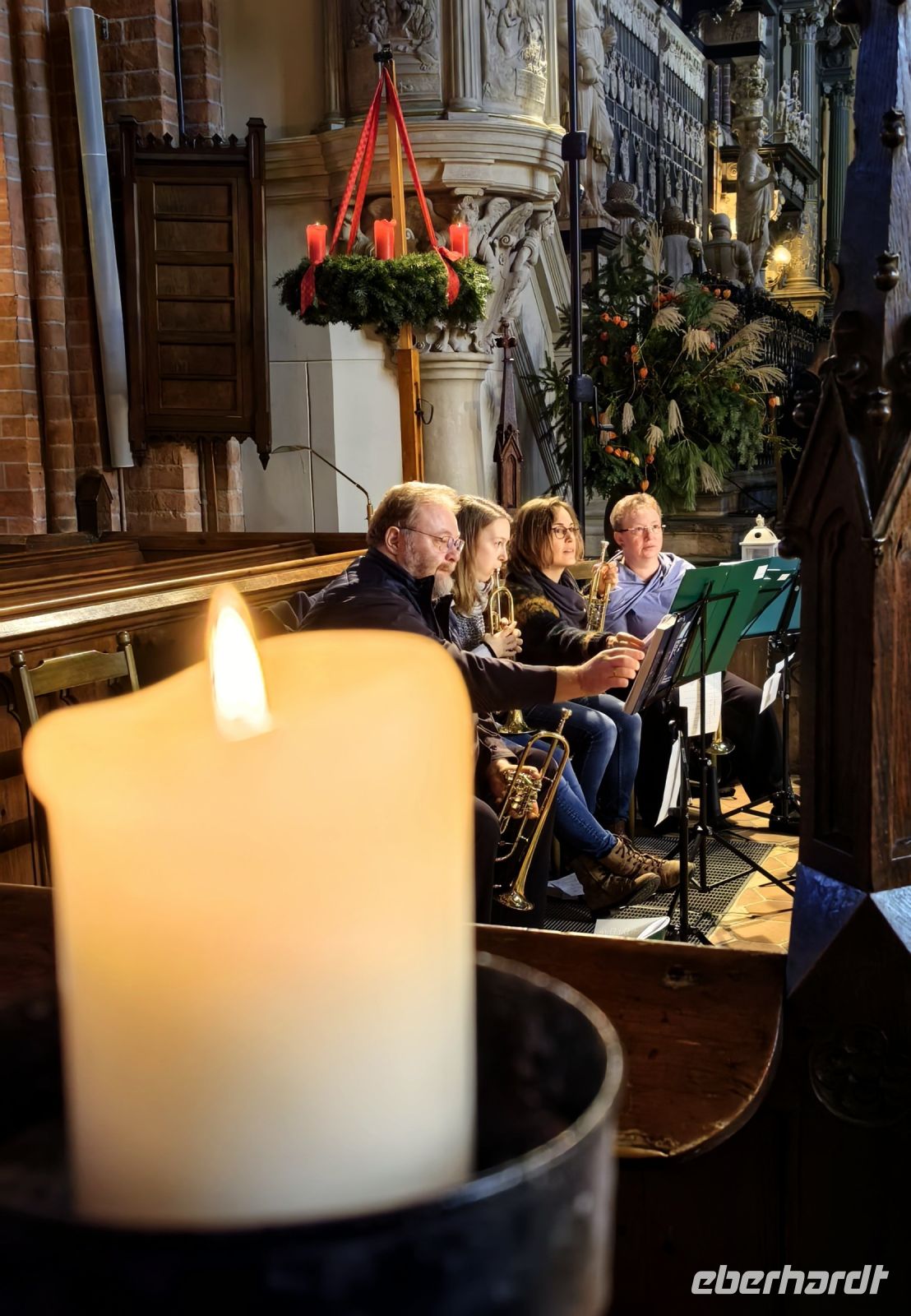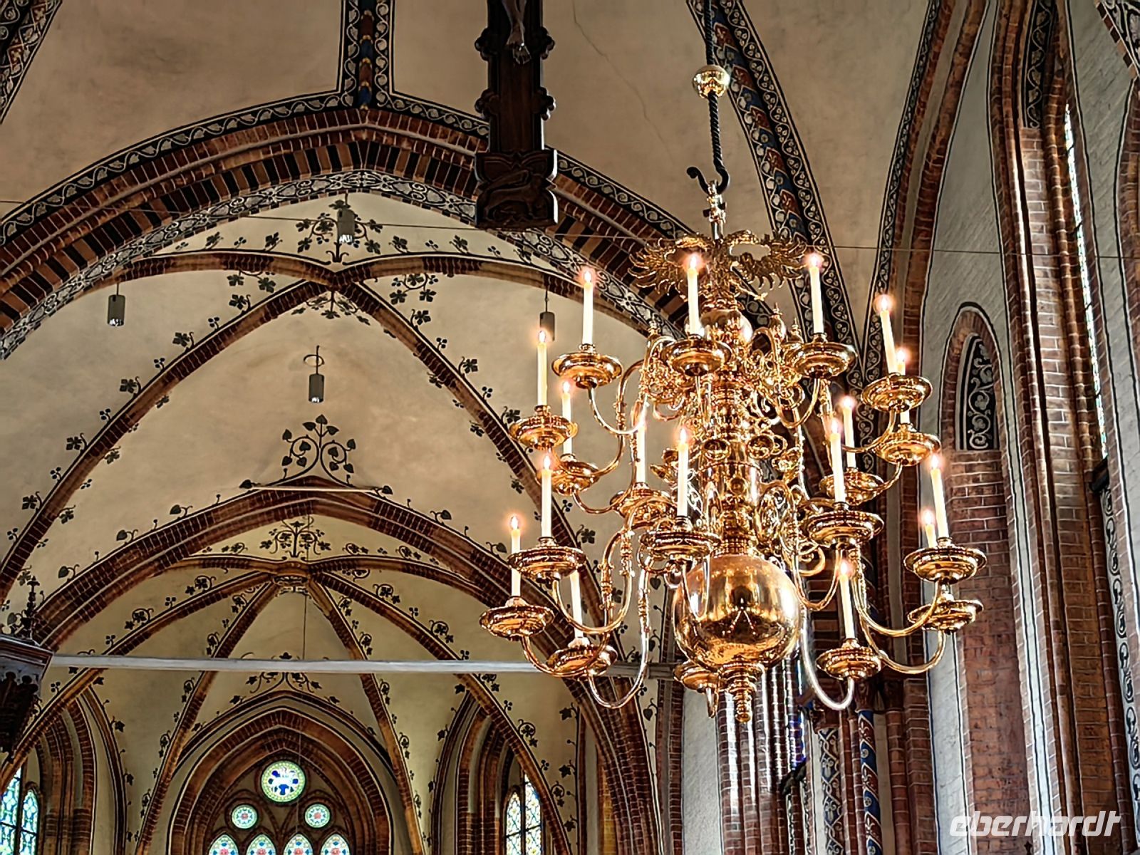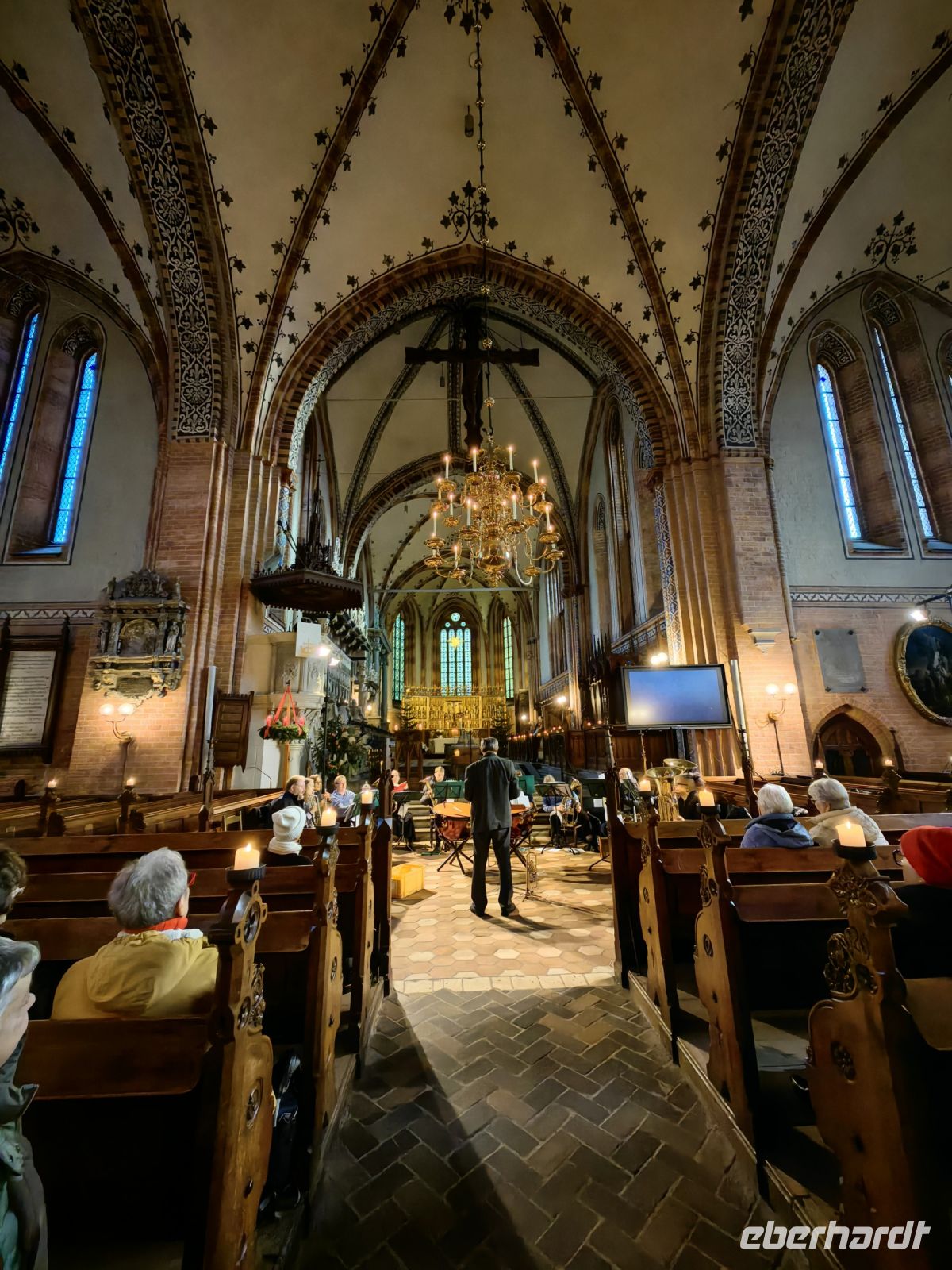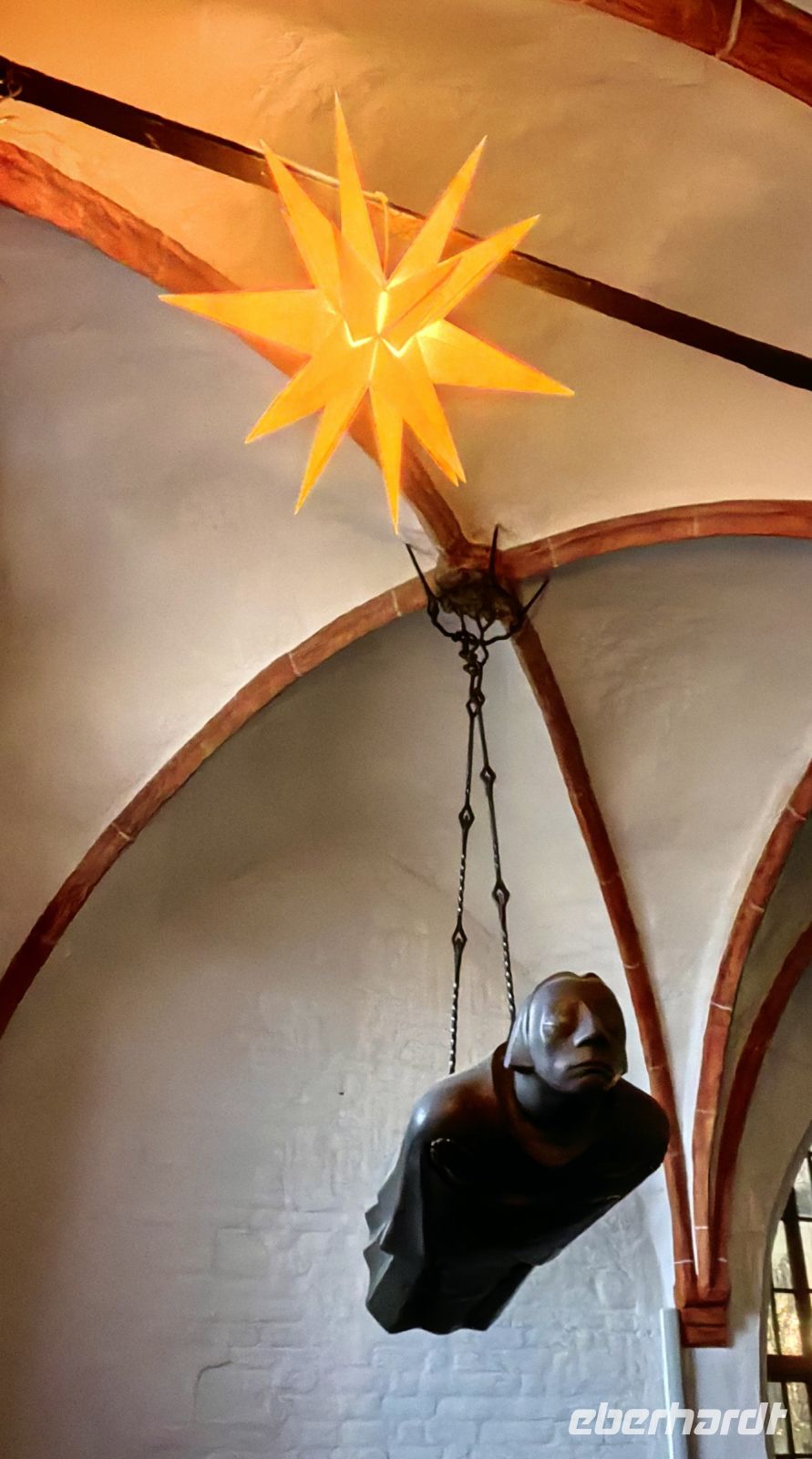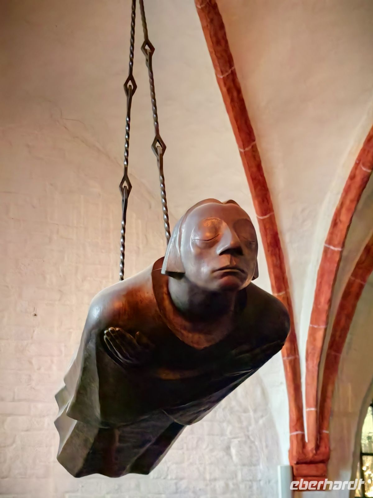 Erholt starten wir am heutigen Morgen direkt am Hotel und laufen zum Dom zu Güstrow. Der Bläsergottesdienst steht auf dem Programm. Zuerst müssen wir natürlich dem Schwebenden von Barlach einen Besuch abstatten. Diese hängende Engelsfigur mit dem recht starren Gesichtsausdruck im indirekten Licht des Nordens ist faszinierend und zugleich verstörend. Die Geschichte dieser Bronzefigur, die einst als Mahnmal für die Opfer des Ersten Weltkrieges in Auftrag gegeben und später von den Nazis als entartete Kunst verschmäht wurde, ist beeindruckend. Eine Kopie hing in Köln und erst nach dem Zweiten Weltkrieg kam er in den 1950er Jahren wieder an seinen Platz zurück nach Güstrow. Während wir noch damit beschäftigt sind, den Engel ins rechte Fotolicht zu setzen, beginnen die Bläser im Dom bereits mit ihrer Probe für den Gottesdienst.