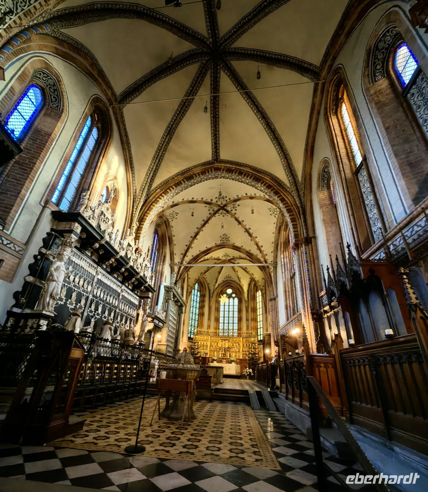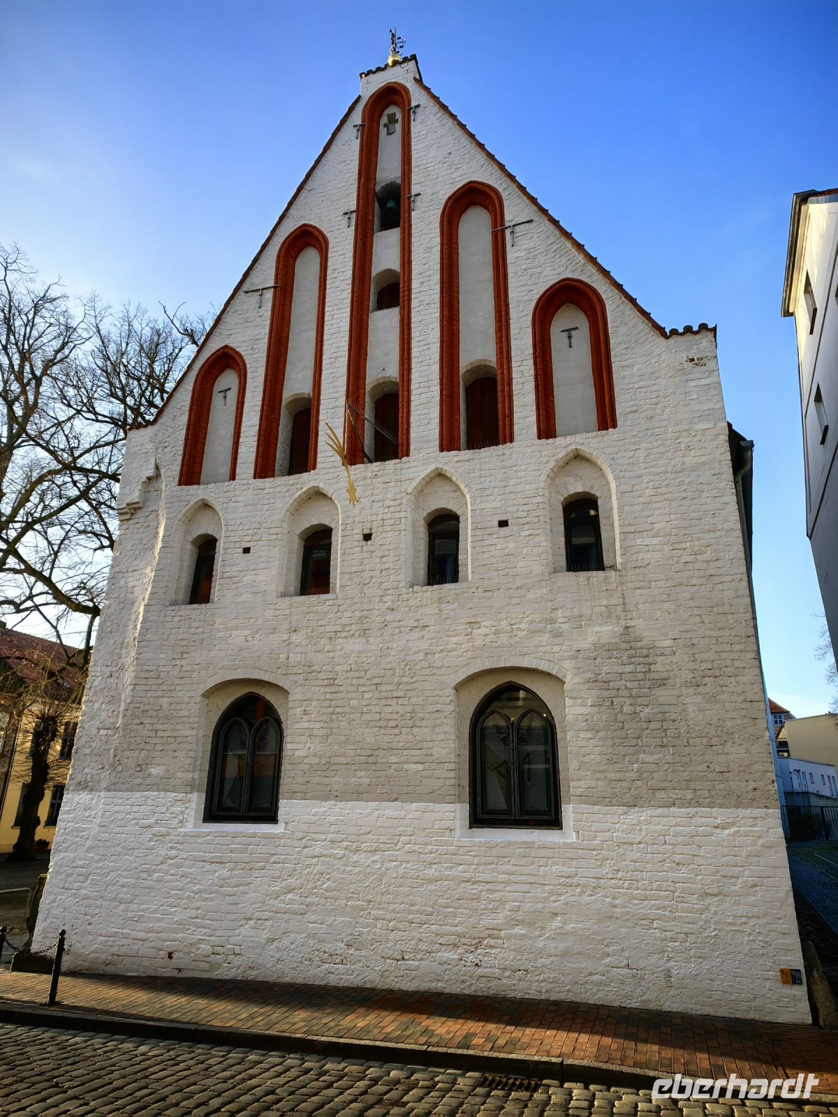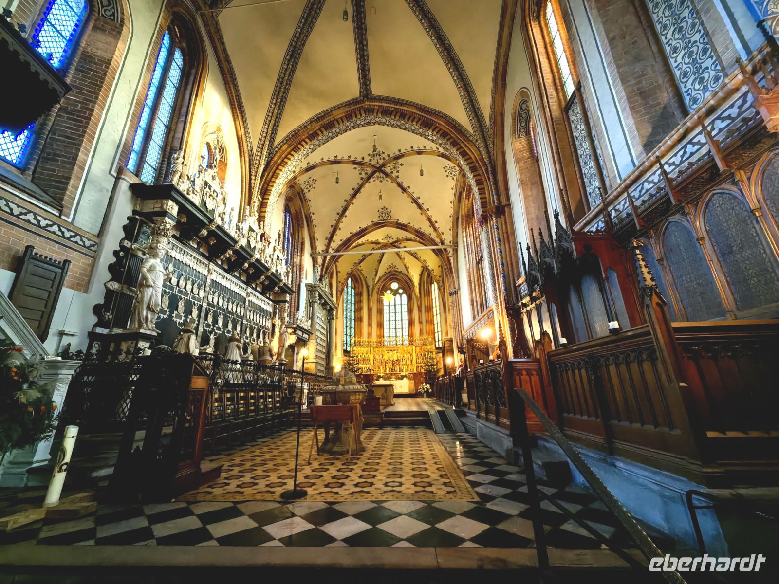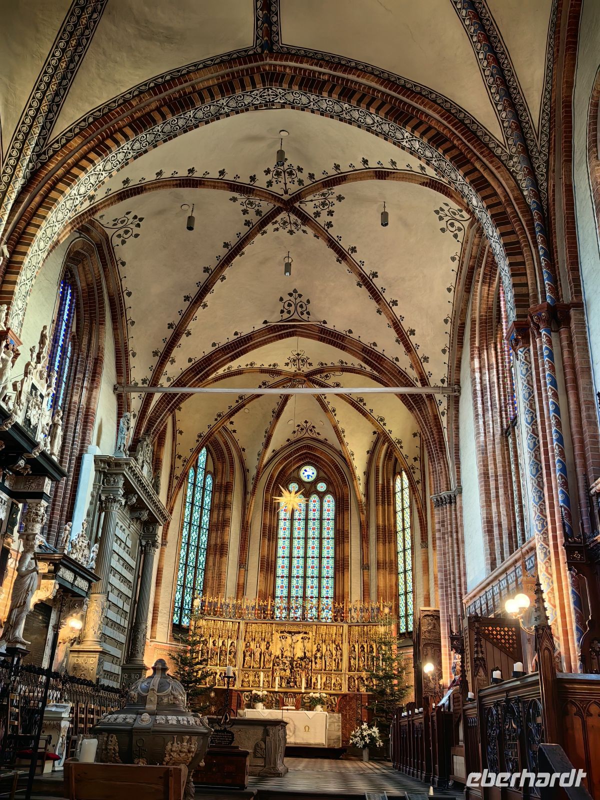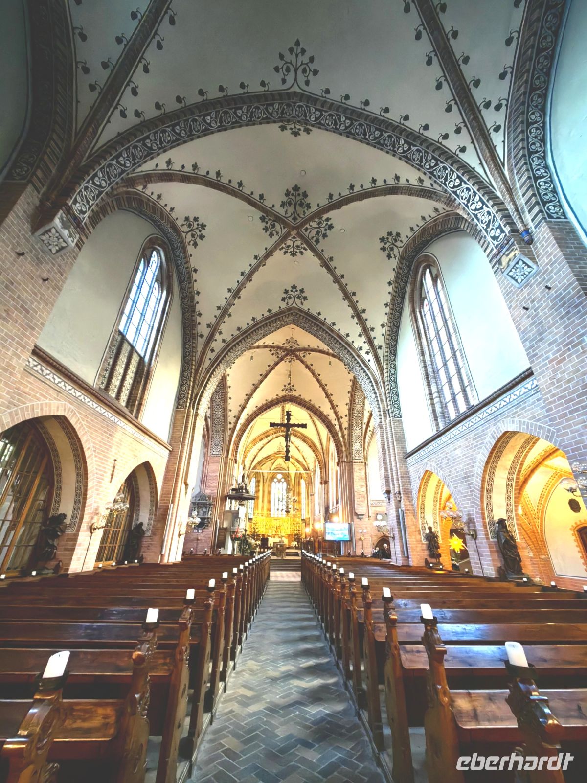 Erholt starten wir am heutigen Morgen direkt am Hotel und laufen zum Dom zu Güstrow. Der Bläsergottesdienst steht auf dem Programm. Zuerst müssen wir natürlich dem Schwebenden von Barlach einen Besuch abstatten. Diese hängende Engelsfigur mit dem recht starren Gesichtsausdruck im indirekten Licht des Nordens ist faszinierend und zugleich verstörend. Die Geschichte dieser Bronzefigur, die einst als Mahnmal für die Opfer des Ersten Weltkrieges in Auftrag gegeben und später von den Nazis als entartete Kunst verschmäht wurde, ist beeindruckend. Eine Kopie hing in Köln und erst nach dem Zweiten Weltkrieg kam er in den 1950er Jahren wieder an seinen Platz zurück nach Güstrow. Während wir noch damit beschäftigt sind, den Engel ins rechte Fotolicht zu setzen, beginnen die Bläser im Dom bereits mit ihrer Probe für den Gottesdienst.