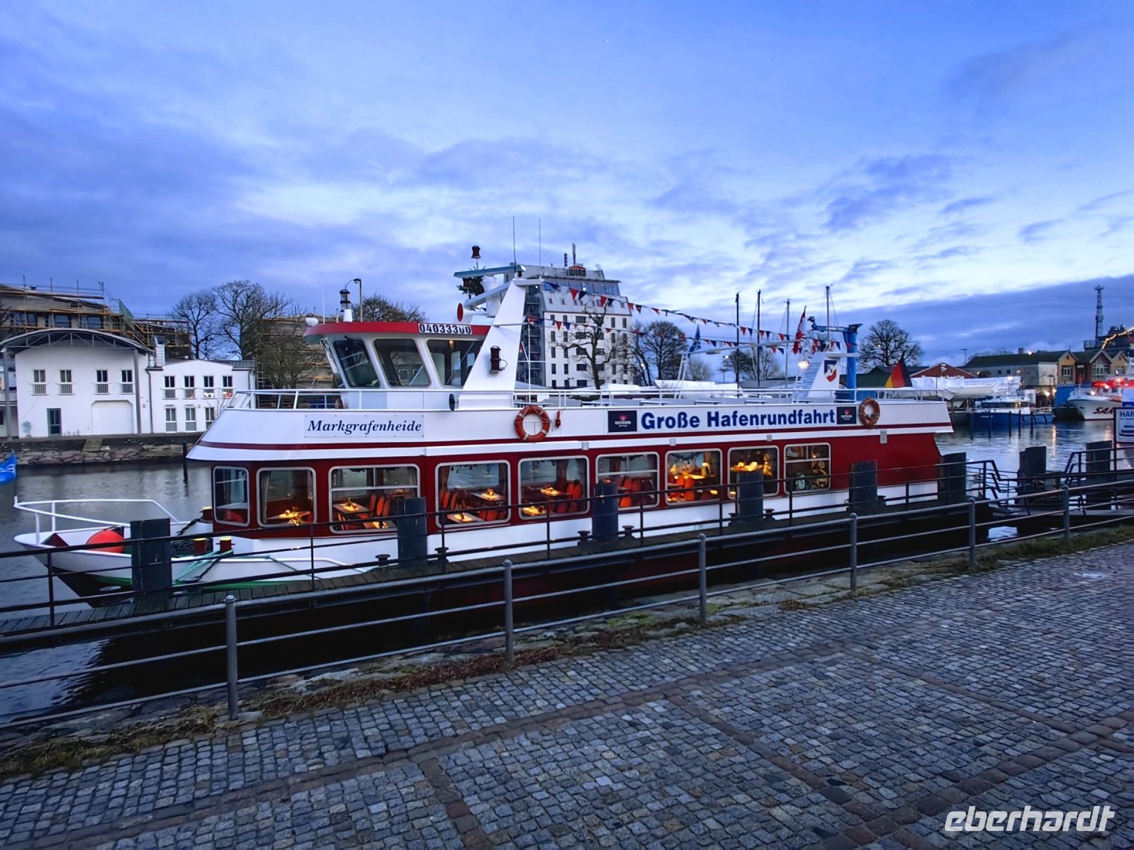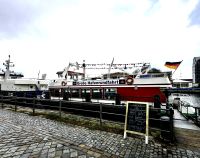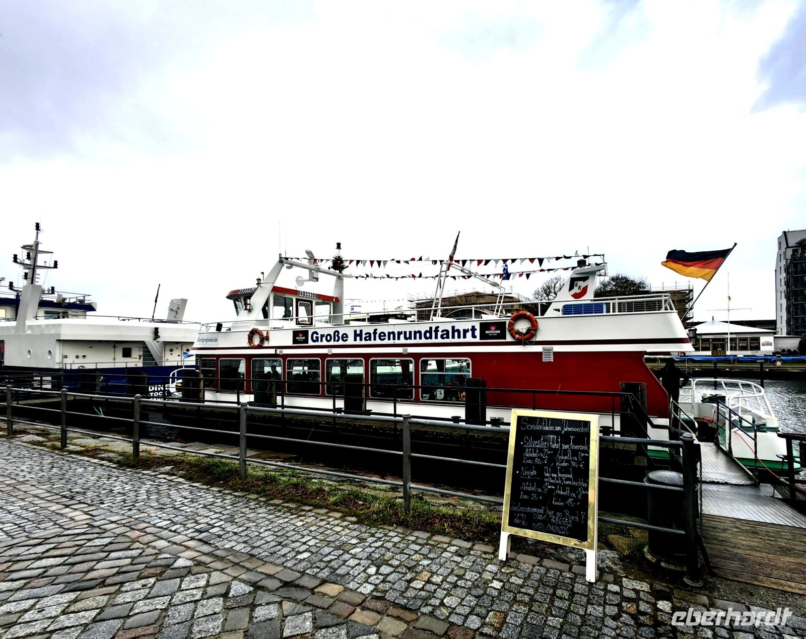 Zur Mittagszeit schippern wir im Bauch des gemütlichen Schiffes bei heißem Pharisäer oder kühlem Bier durch die imposanten Hafenanlagen, sehen die neuen Werftgebäude und etliche riesige Krane, die von hier aus in die ganze Welt verschifft werden. Viel zu schnell ist diese spannende Rundfahrt vorbei und wir stehen wieder am Alten Strom.