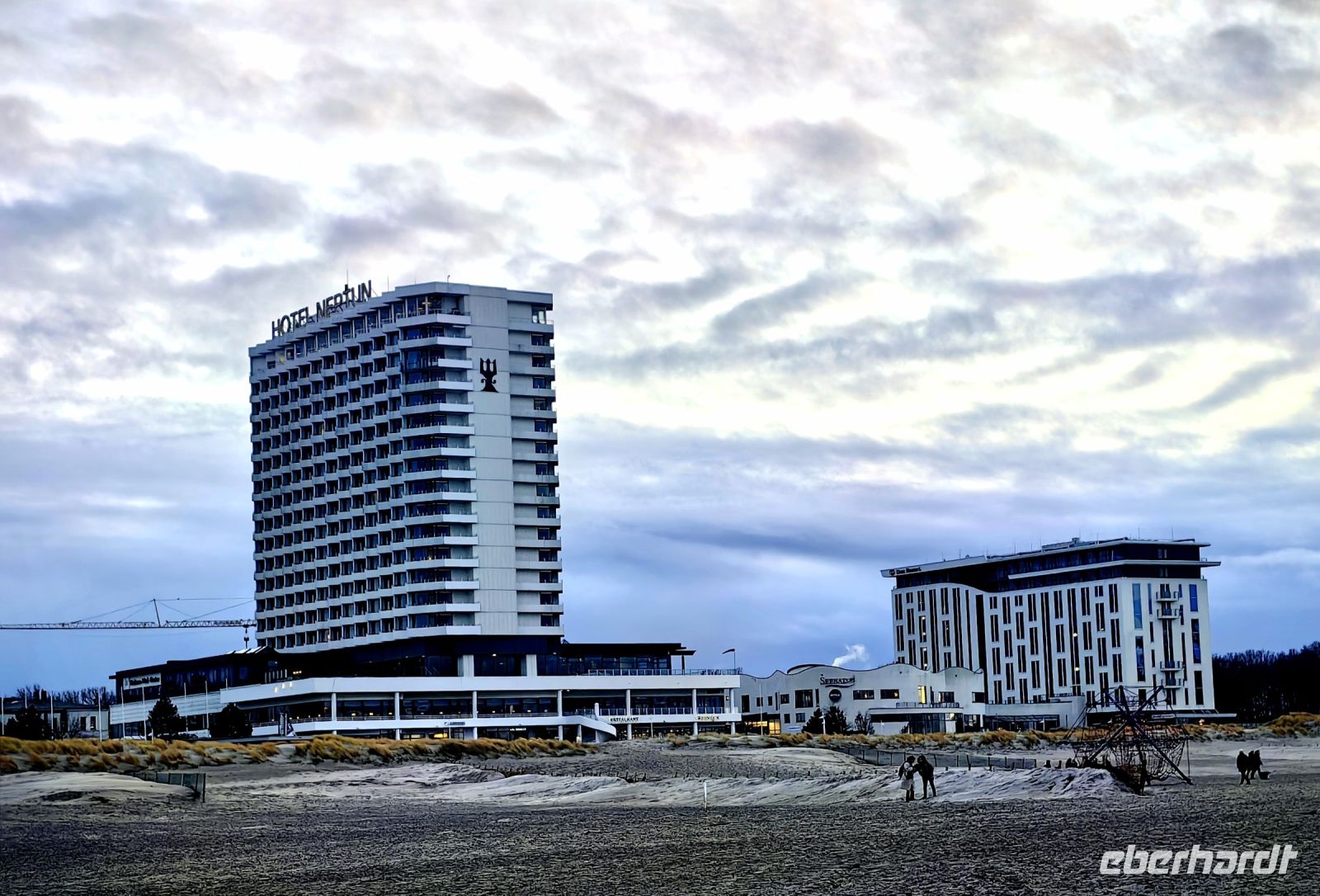 Gemeinsam laufen wir "vom Winde verweht" entlang der Küste in Richtung des legendären Hotel Neptun. Bereits 1971 mit Hilfe von schwedischen Architekten geplant, wurde dieser "Klotz" direkt an der Ostseeküste erbaut. Alle Zimmer haben Meerblick und um dieses Hotel rankt sich so manche Legende. In der einstigen Kult-DDR-Sky-Bar im 19. Stock erwarten uns leckerer Kuchen, Kaffee und ein atemberaubender Ausblick.