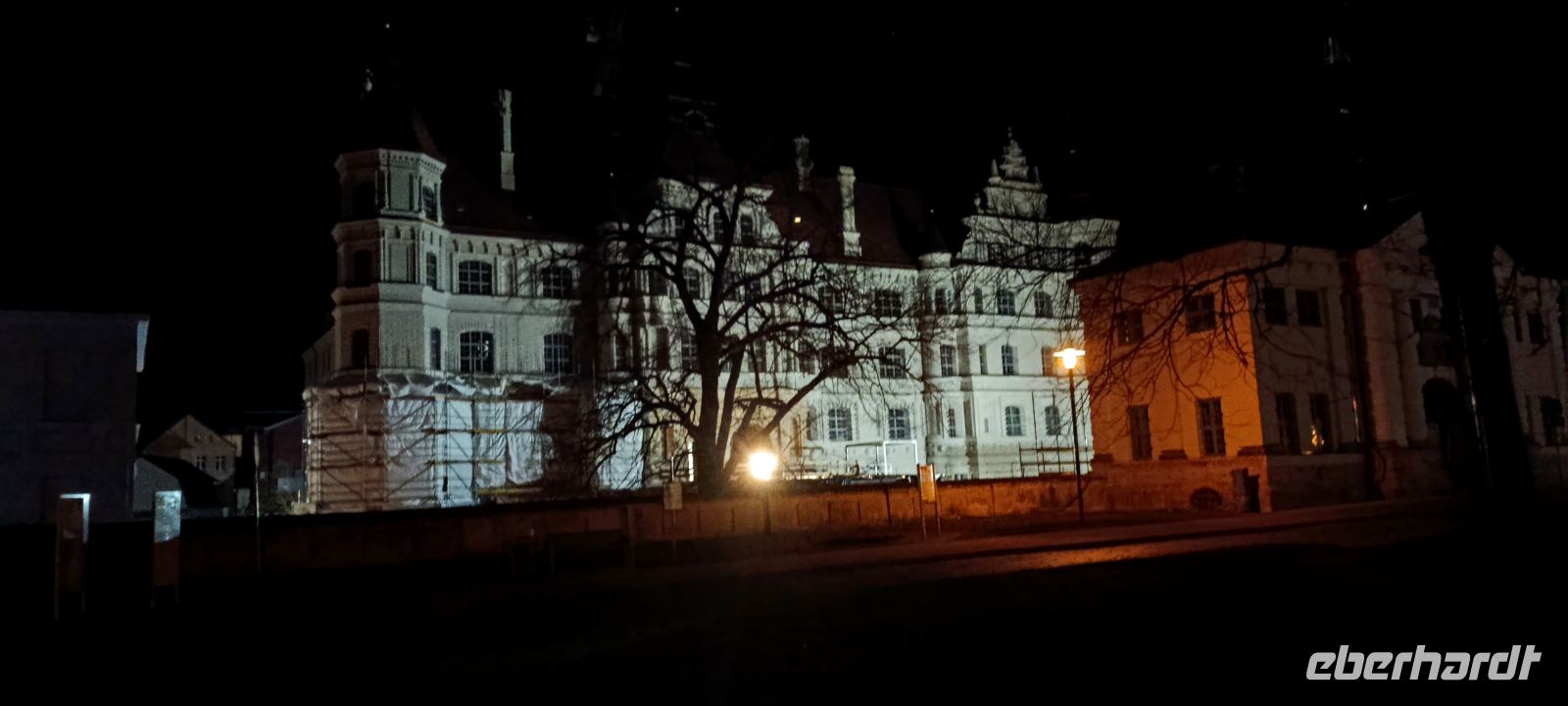 Danach startete eine Nachtwächterführung. Der zünftig gekleidete, mit Hellebarde und Laterne ausgestattete Bursche nimmt uns mit in eine kleine verwinkelte und von etlichen Fachwerkhäusern gesäumte Altstadt und erzählt uns eine spannende Anekdote nach der anderen. Wir spazieren am Marktplatz vorbei, sehen das Rathaus, mittelalterliches Fachwerk mit schmalen Türchen und reich geschmückten Fensterchen. Am Ernst-Barlach-Theater verweilen wir ein wenig und beenden unseren Rundgang am Schloß, welches gerade aufwendig saniert wird.