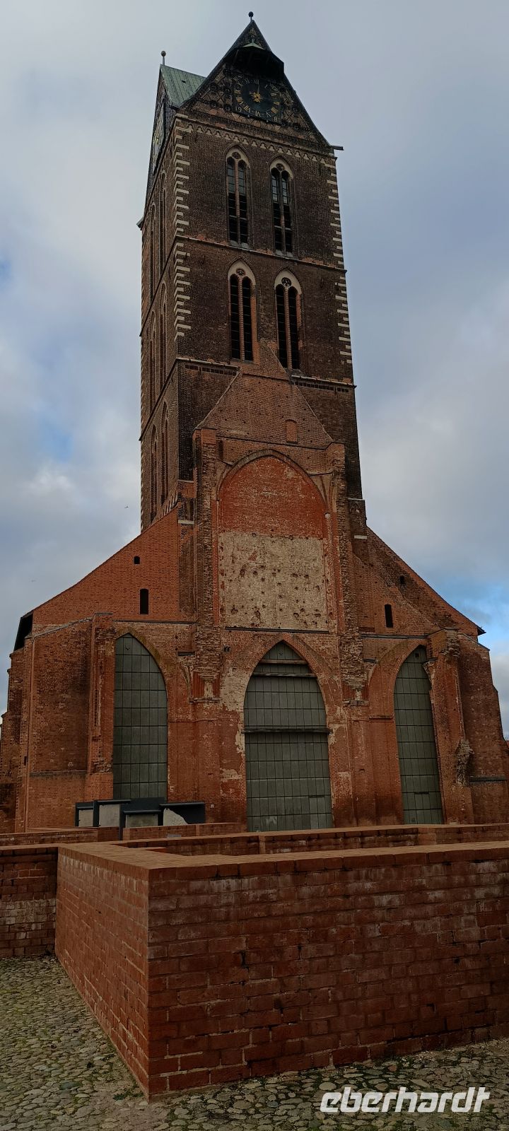 Wir beenden unseren Stadtspaziergang am Turm der Marienkirche, der wie ein mahnender Finger gut 80 Meter hoch über die Stadt hinausragt. Im zweiten Weltkrieg wurde das Kirchenschiff schwer beschädigt und zu DDR Zeiten beschloß man, es zu sprengen. So sieht dieser Platz heut ein wenig wie eine große klaffende Wunde im sonst so beschaulichen Stadtbild aus.