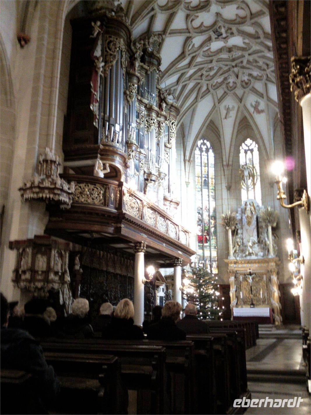 Anschließend setzten wir unseren Ausflug zum Schloss Altenburg fort. Das baraocke Schloss, ehemals Residenzschloss der Herzöge von Sachsen-Altenburg, beherbergt die im spätgothischen Stil errichtete imposante Schlosskirche und das Spielkartenmuseum. Durch den Schlosspark mit dem neu restaurierten Teehaus und der Orangerie, dem Zwingerberich am großen Eingang erreichten wir den Schlosshof. Von hier aus konnten wir den 32 Meter hohen Hausmannsturm, welcher das höchste Bauwerk des Schlosses bildet. Die sogenannte "Flasche", der zweite noch erhaltene Turm von ehemals sieben, ist ein Bergfried und wurde im Jahre 1000 gebaut. Während einer Führung durch die Schlossräume und die Schlosskirche erfuhren wir Ausführliches zur Nutzung der Räume und der im Schloss lebenden Personen. In der Schlosskirche hörten wir ein Ausschnitt aus dem Orgelkonzert der Trostorgel. Zwar gab es an dem Tag niemanden, der es live spielen konnte, und wir das Musikstück von einer CD hörten, war es trotzdem schön.